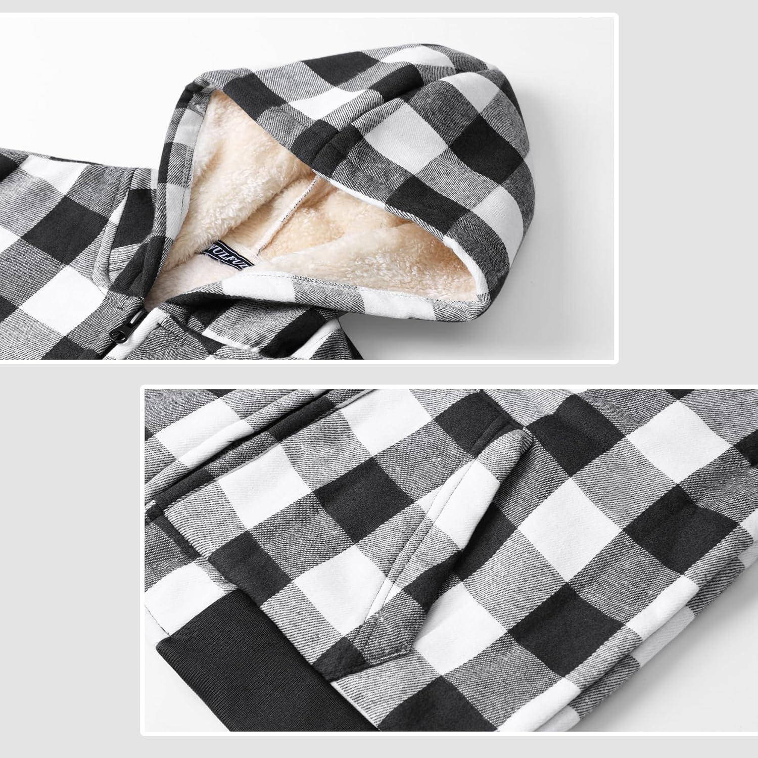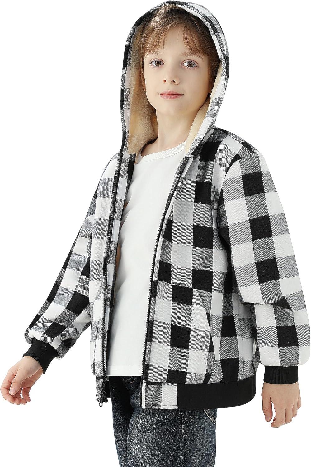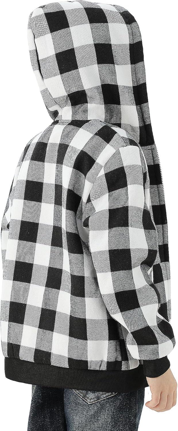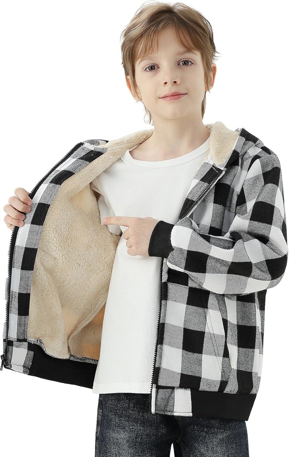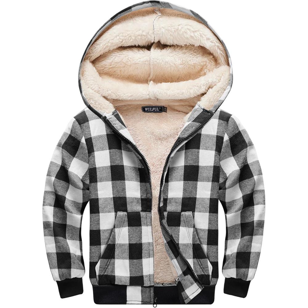 WULFUL Boys Flannel Fleece Jackets Plaid Sherpa Hoodie Zip Up Winter Coat 5-14 Years(Black)