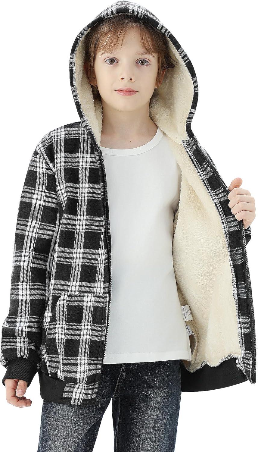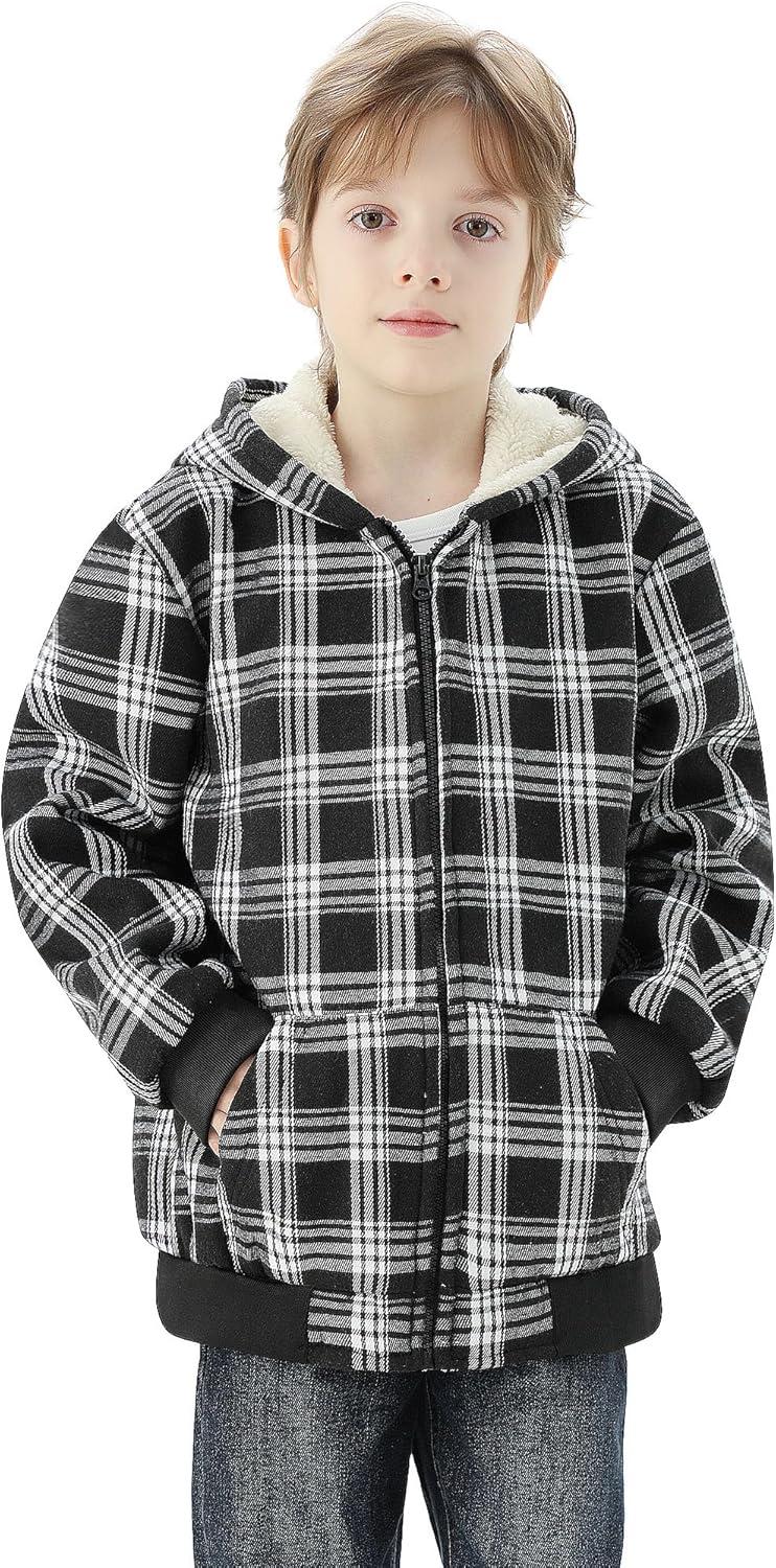 WULFUL Boys Flannel Fleece Jackets Plaid Sherpa Hoodie Zip Up Winter Coat 5-14 Years(Black 649)