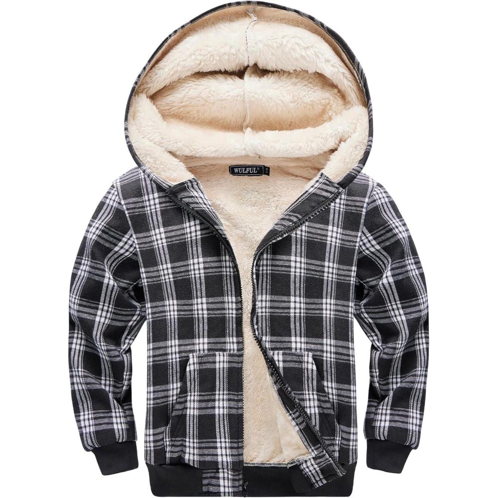 WULFUL Boys Flannel Fleece Jackets Plaid Sherpa Hoodie Zip Up Winter Coat 5-14 Years(Black 758)