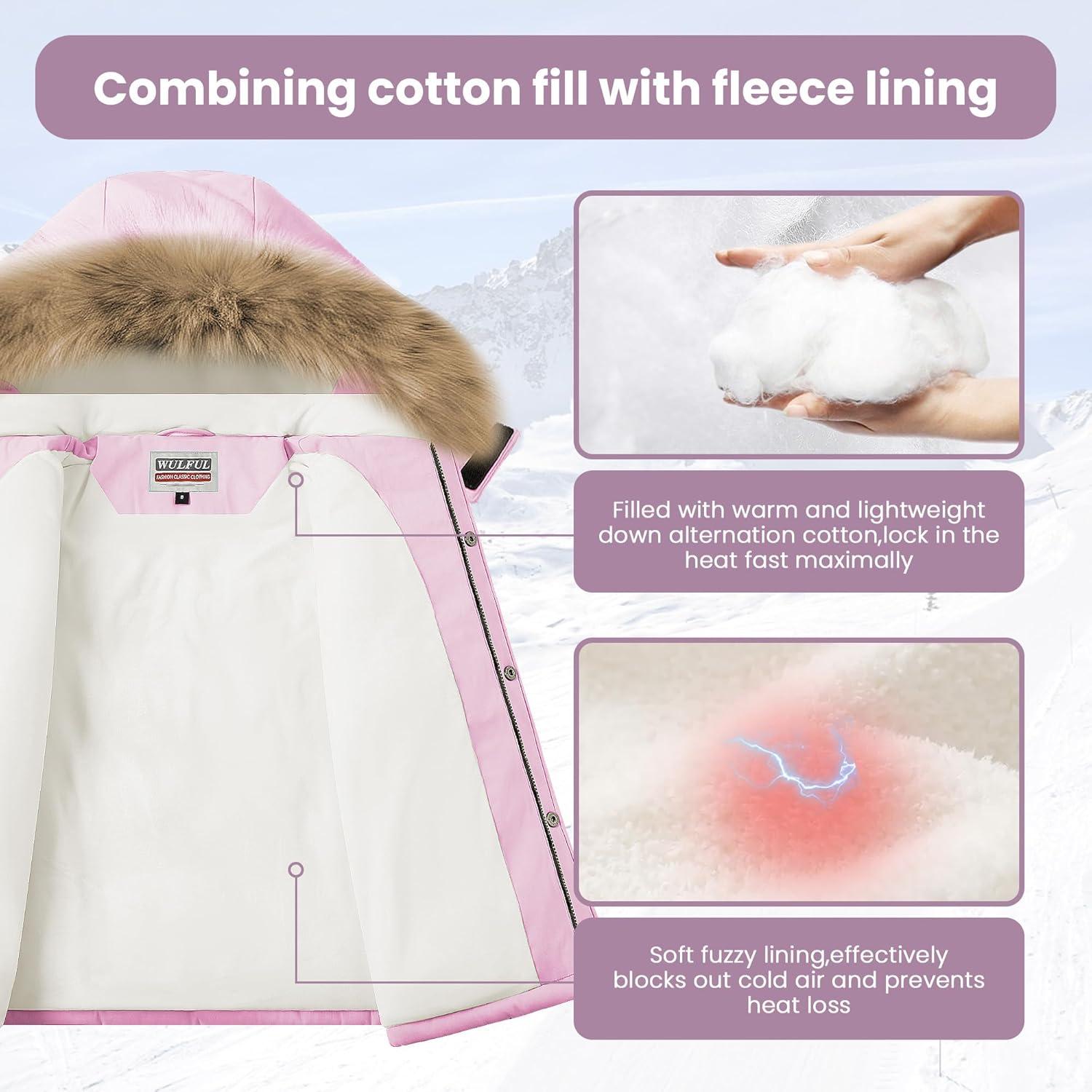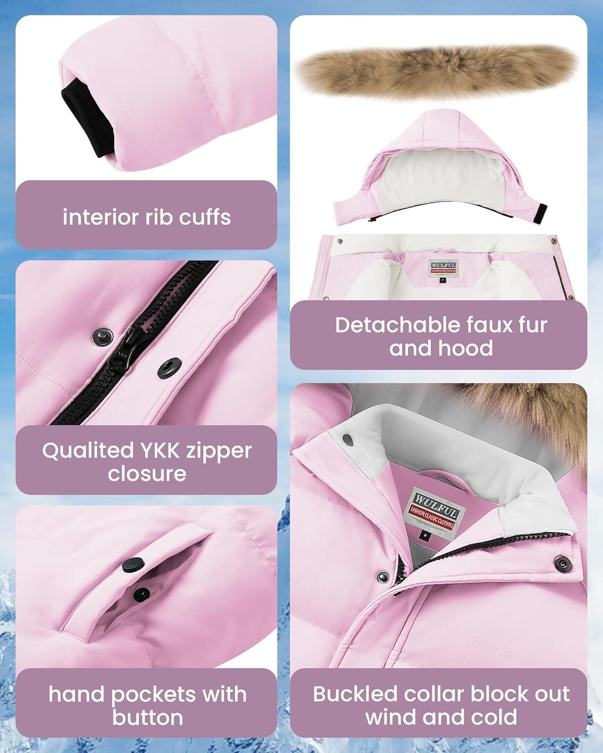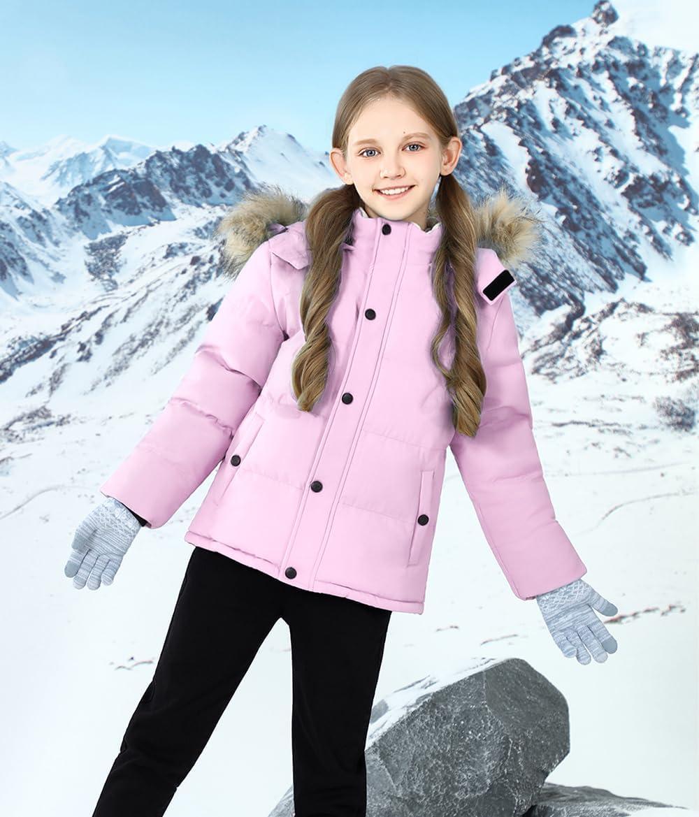 WULFUL Boy's Girls Winter Coats Waterproof Fleece Lined Puffer Jackets Kids Thicken Outerwear With Detachable Hood(Pink)