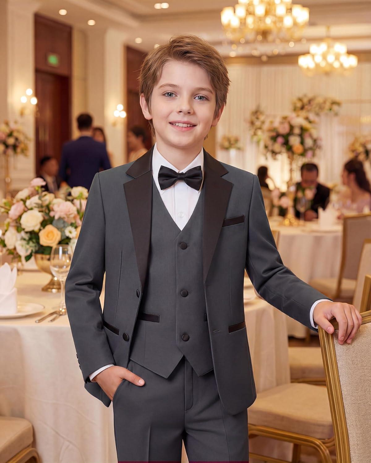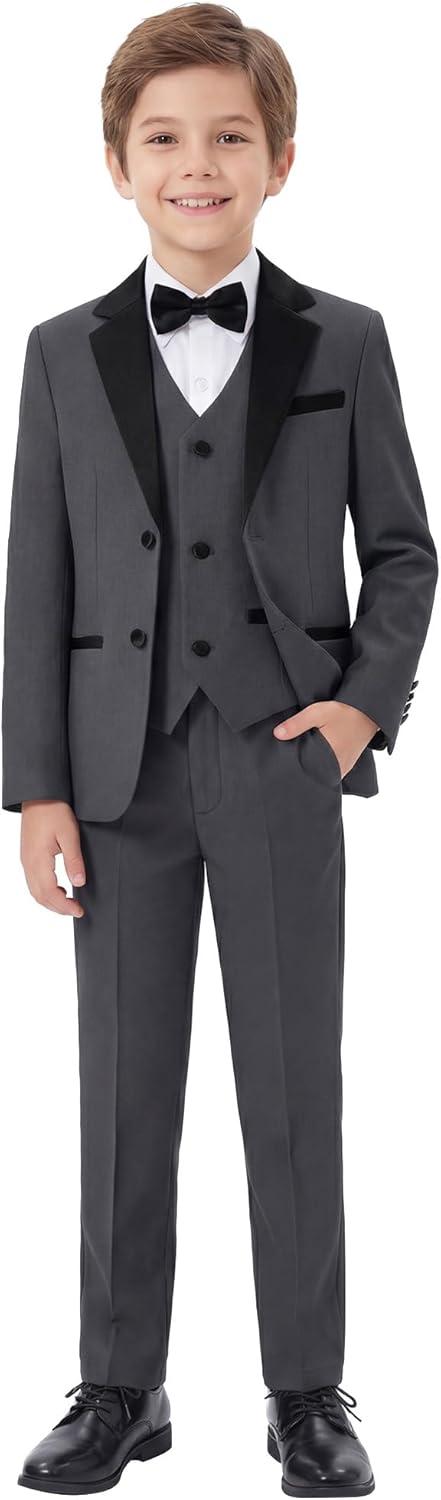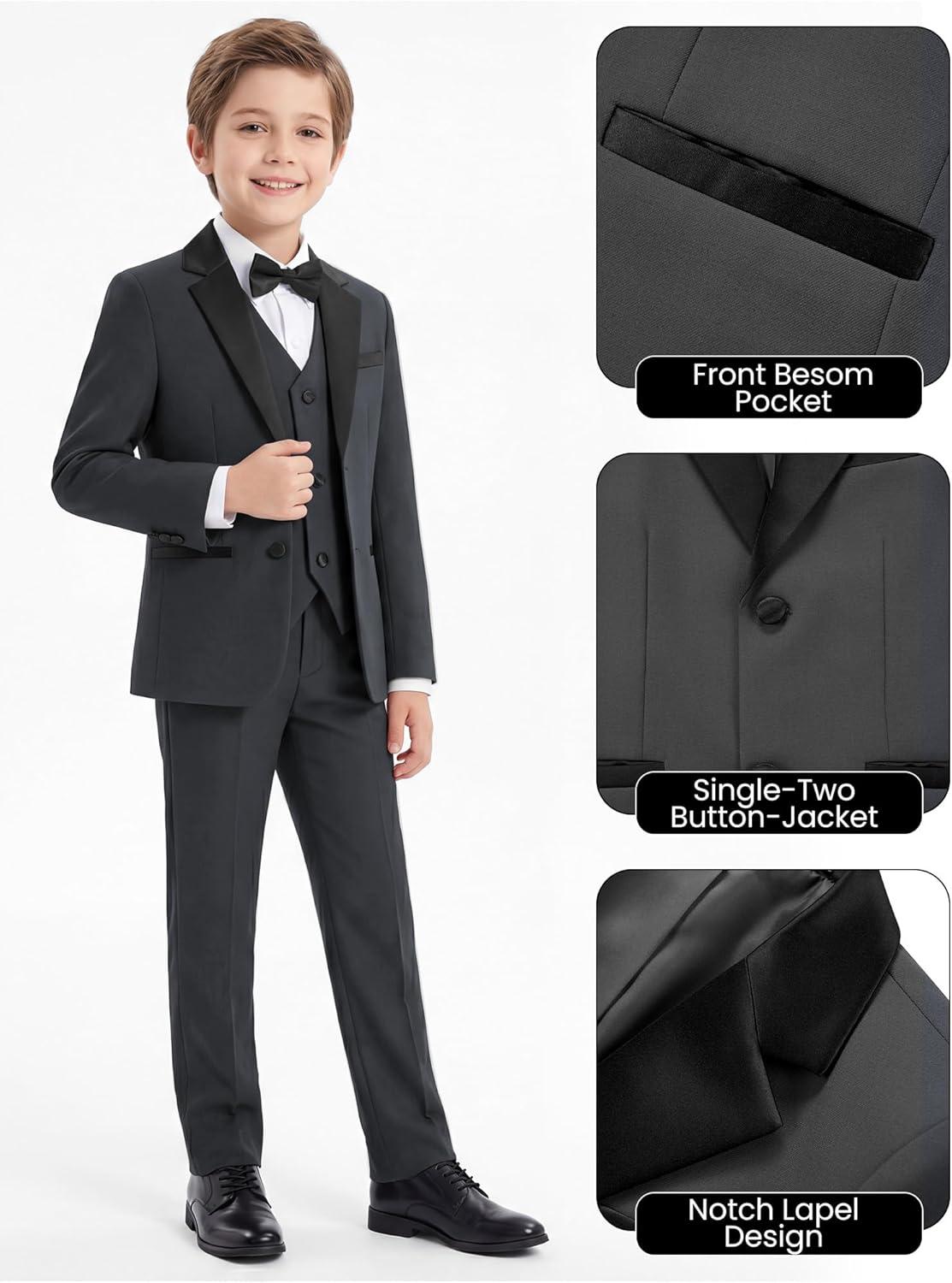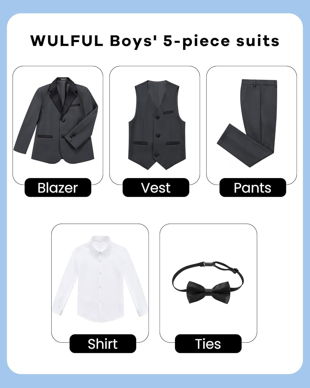 WULFUL Boys Suits 5-Piece Tuxedo Suit Set: Jacket, Pants, Shirt, Vest & Bow Tie for Kids Wedding Ring Bearer Party(Dark Grey)