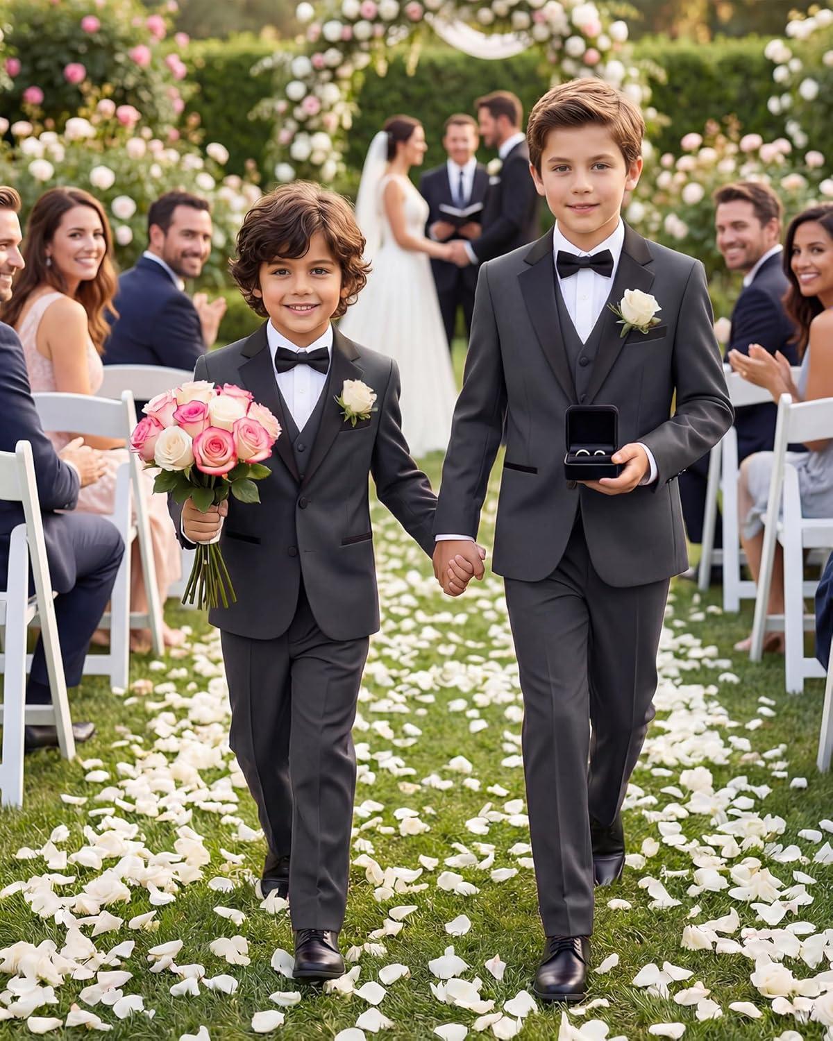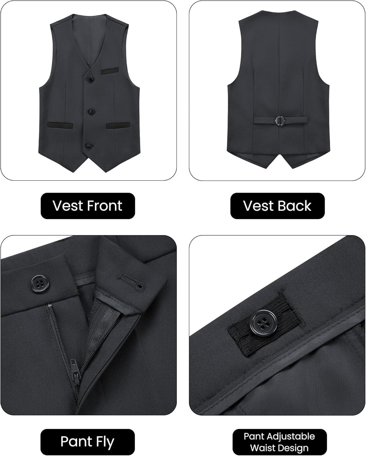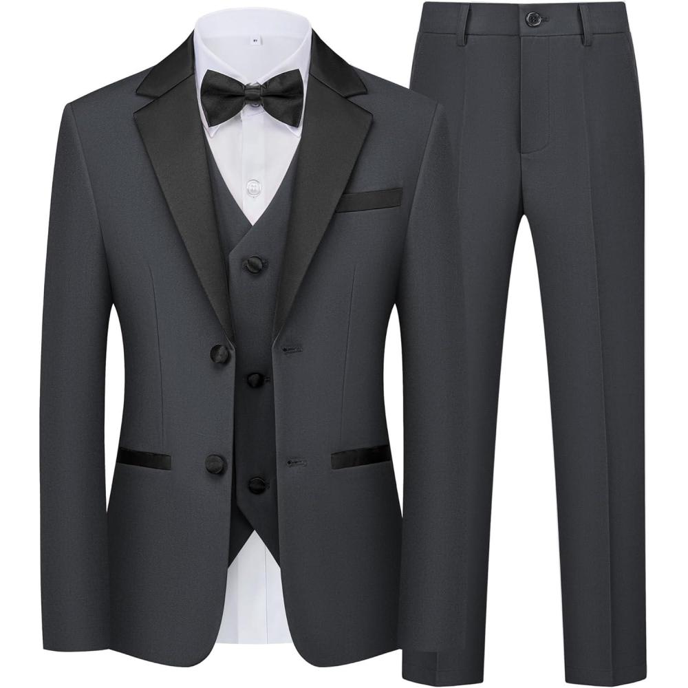 WULFUL Boys Suits 5-Piece Tuxedo Suit Set: Jacket, Pants, Shirt, Vest & Bow Tie for Kids Wedding Ring Bearer Party(Dark Grey)