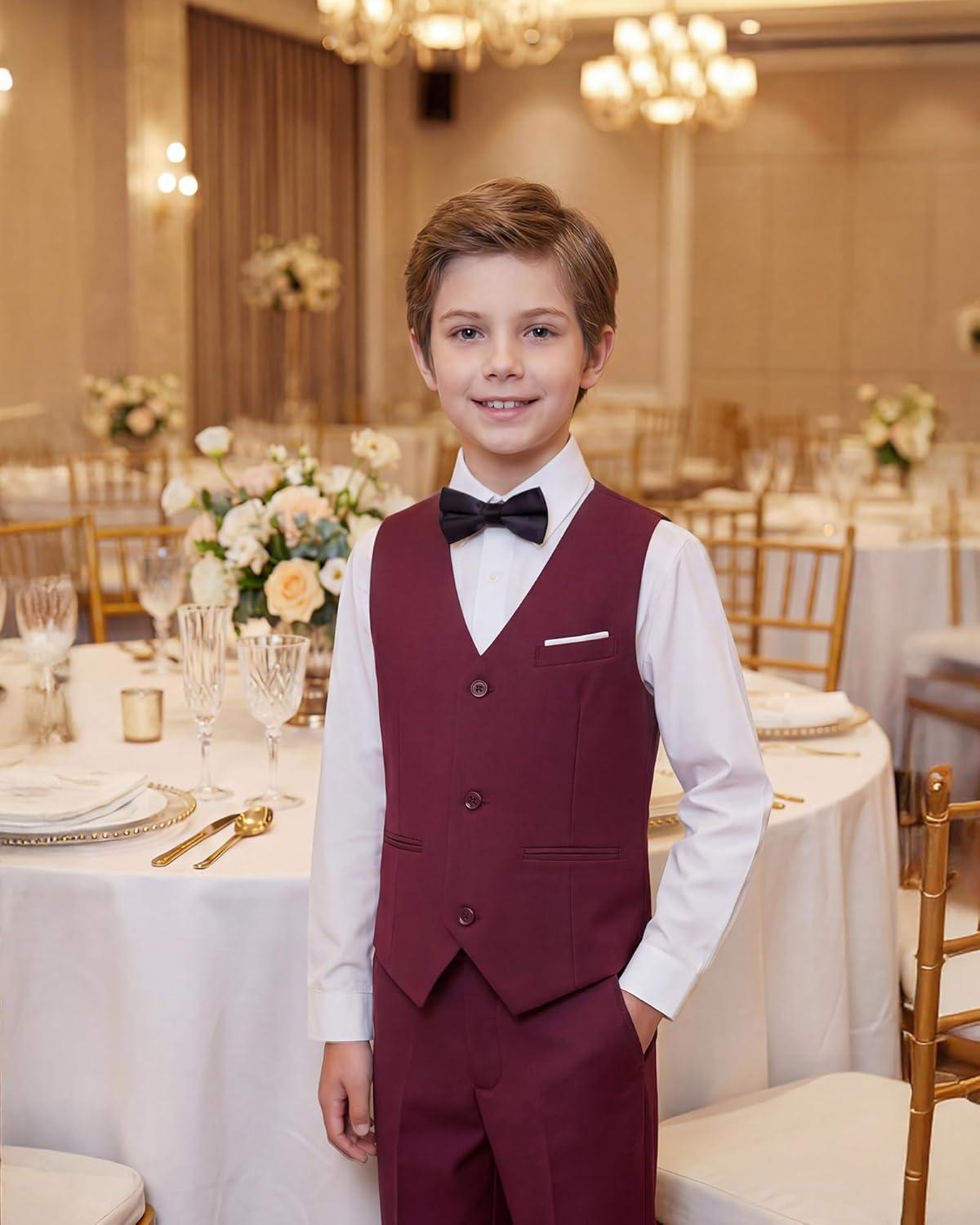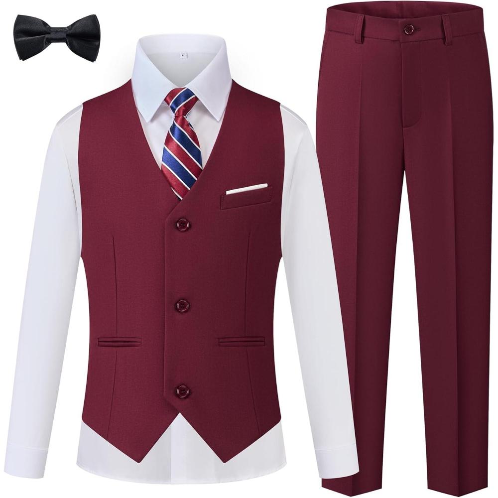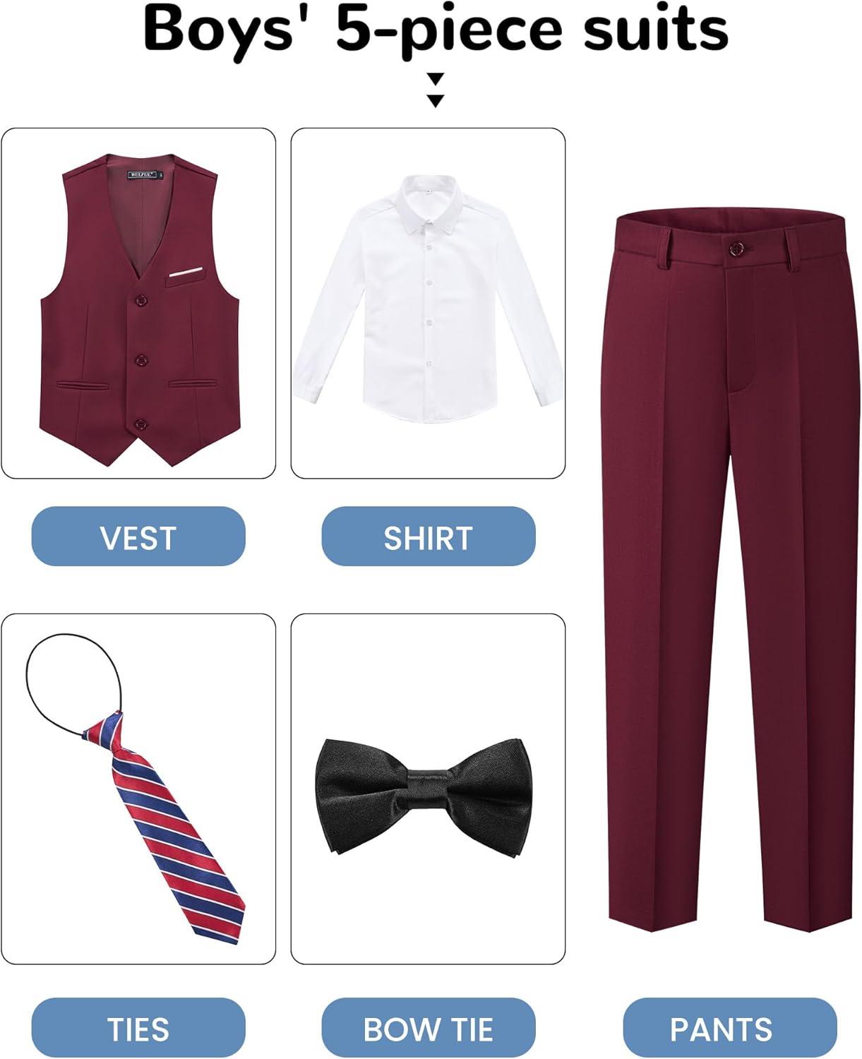 WULFUL Boys Suits 5-Pieces Formal Slim Fit Tuxedo Suit Set,Teen Suits for Wedding Ring Bearer Church Outfit(Wine Red)