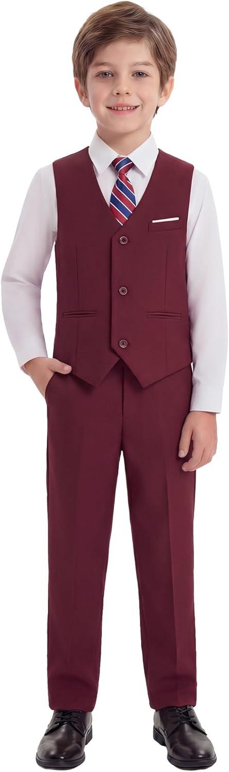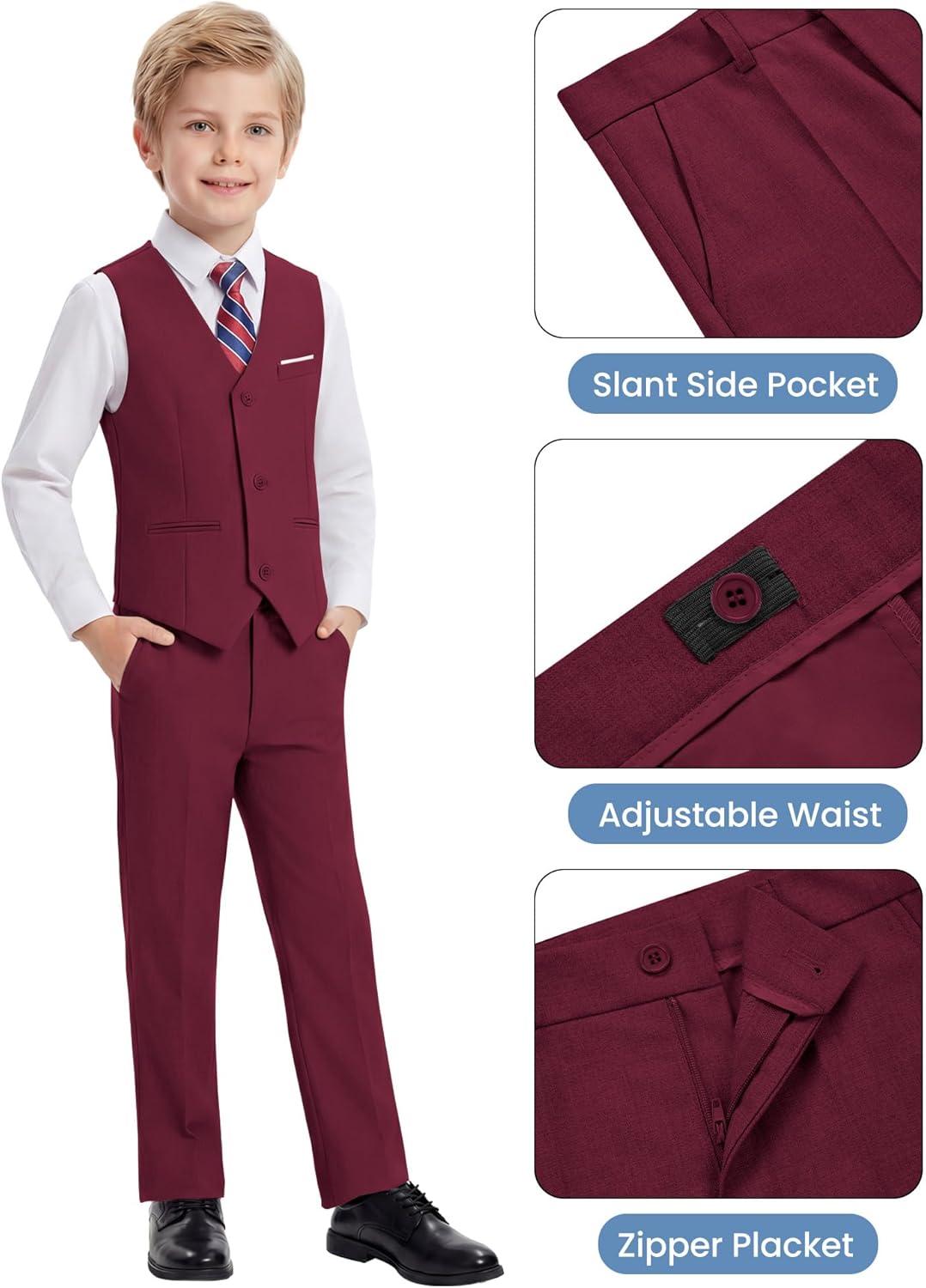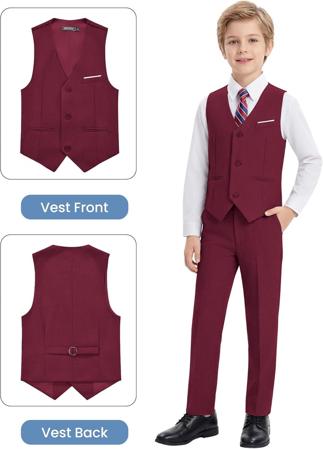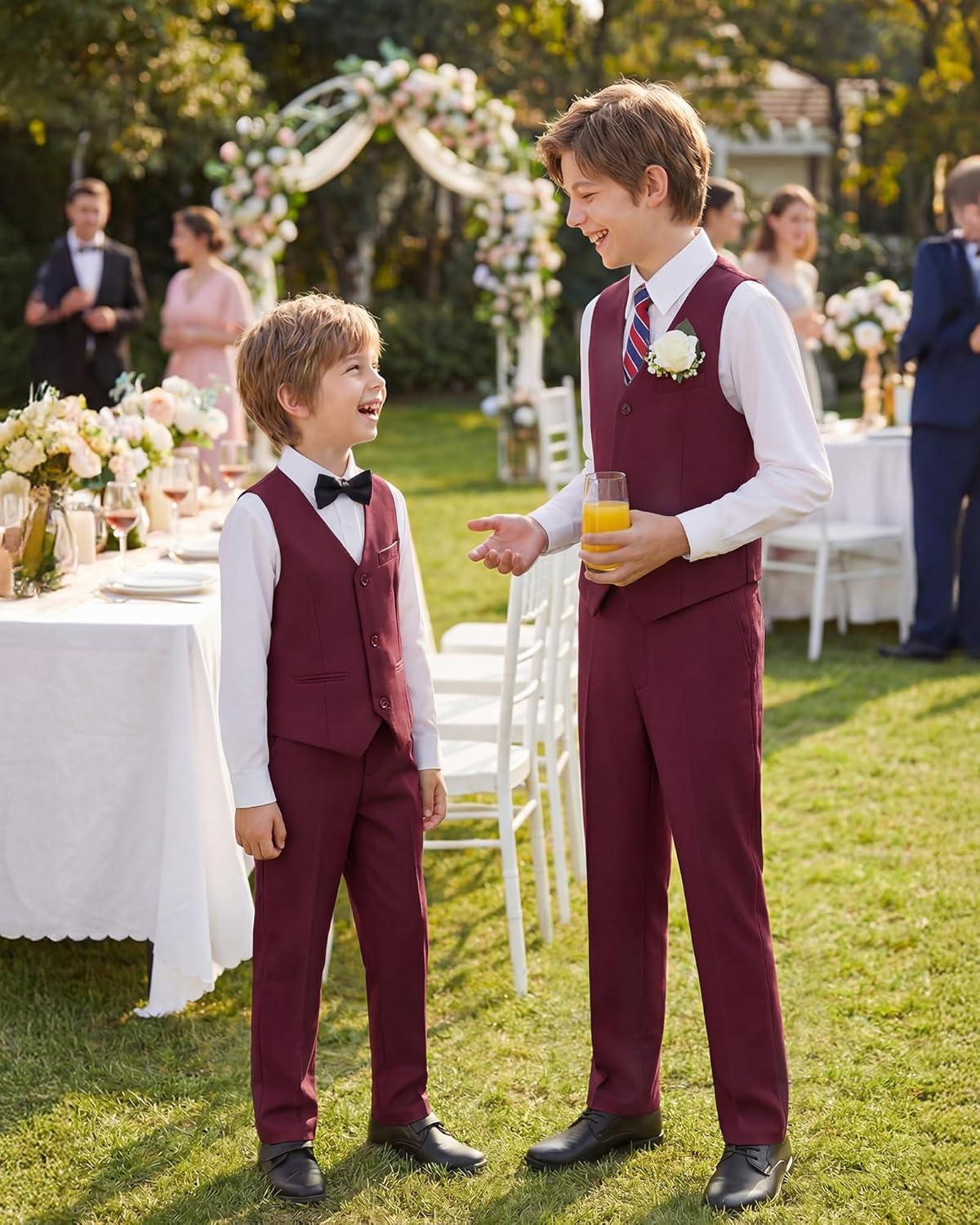 WULFUL Boys Suits 5-Pieces Formal Slim Fit Tuxedo Suit Set,Teen Suits for Wedding Ring Bearer Church Outfit(Wine Red)