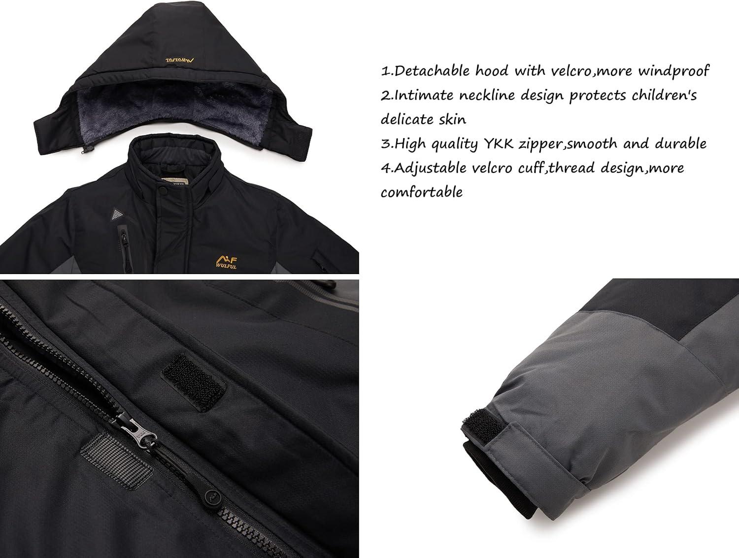 WULFUL Boy's Waterproof Ski Jacket Warm Fleece Hooded Winter Snow Coat(Black-grey)