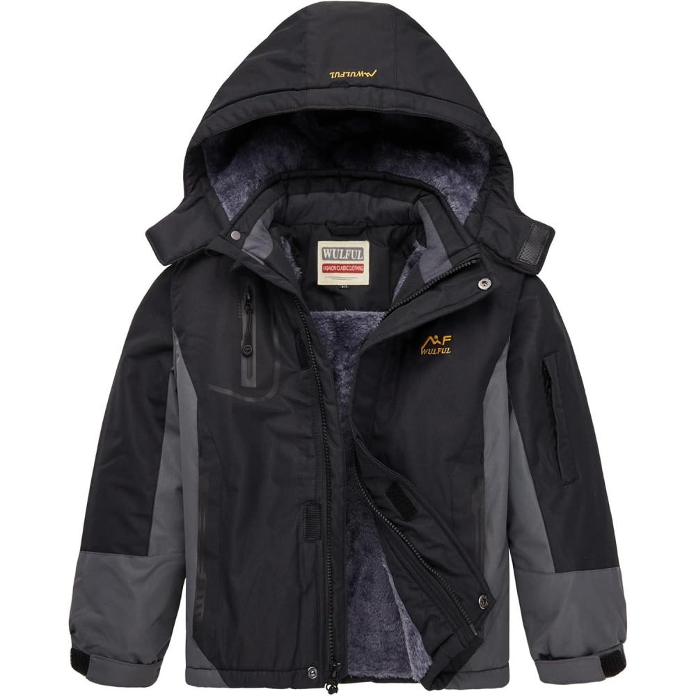 WULFUL Boy’s Waterproof Ski Jacket Warm Fleece Hooded Winter Snow Coat(Black-grey)