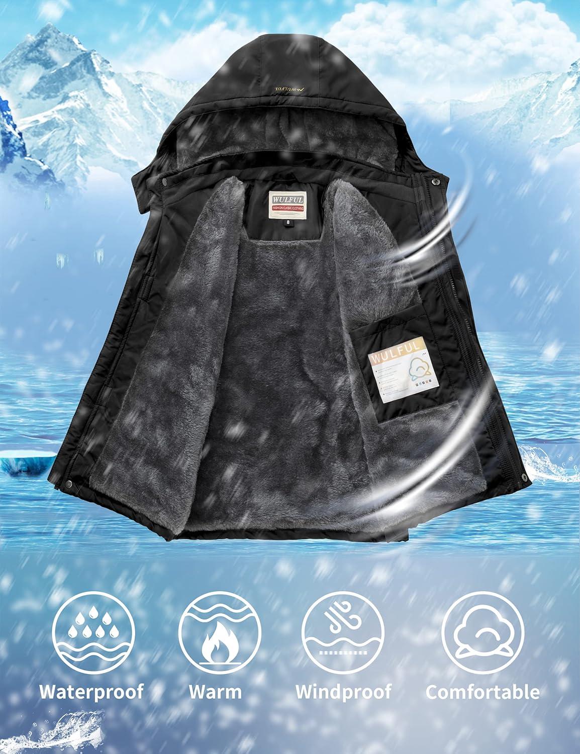 WULFUL Boy's Waterproof Ski Jacket Warm Fleece Hooded Winter Snow Coat(Black)