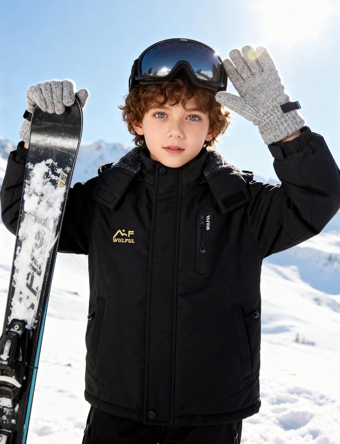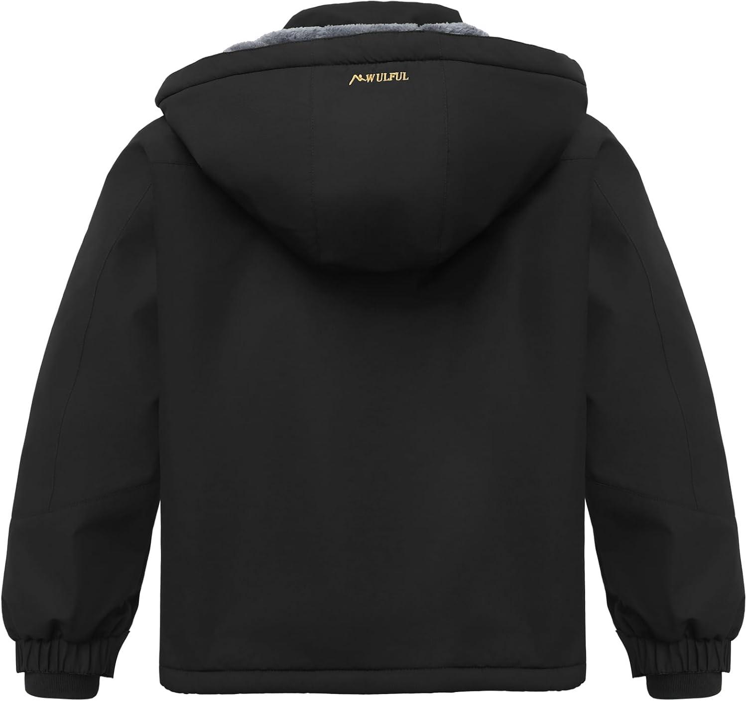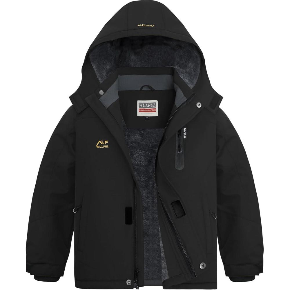 WULFUL Boy's Waterproof Ski Jackets Warm Fleece Lined Hooded Winter Snow Coat(Black)