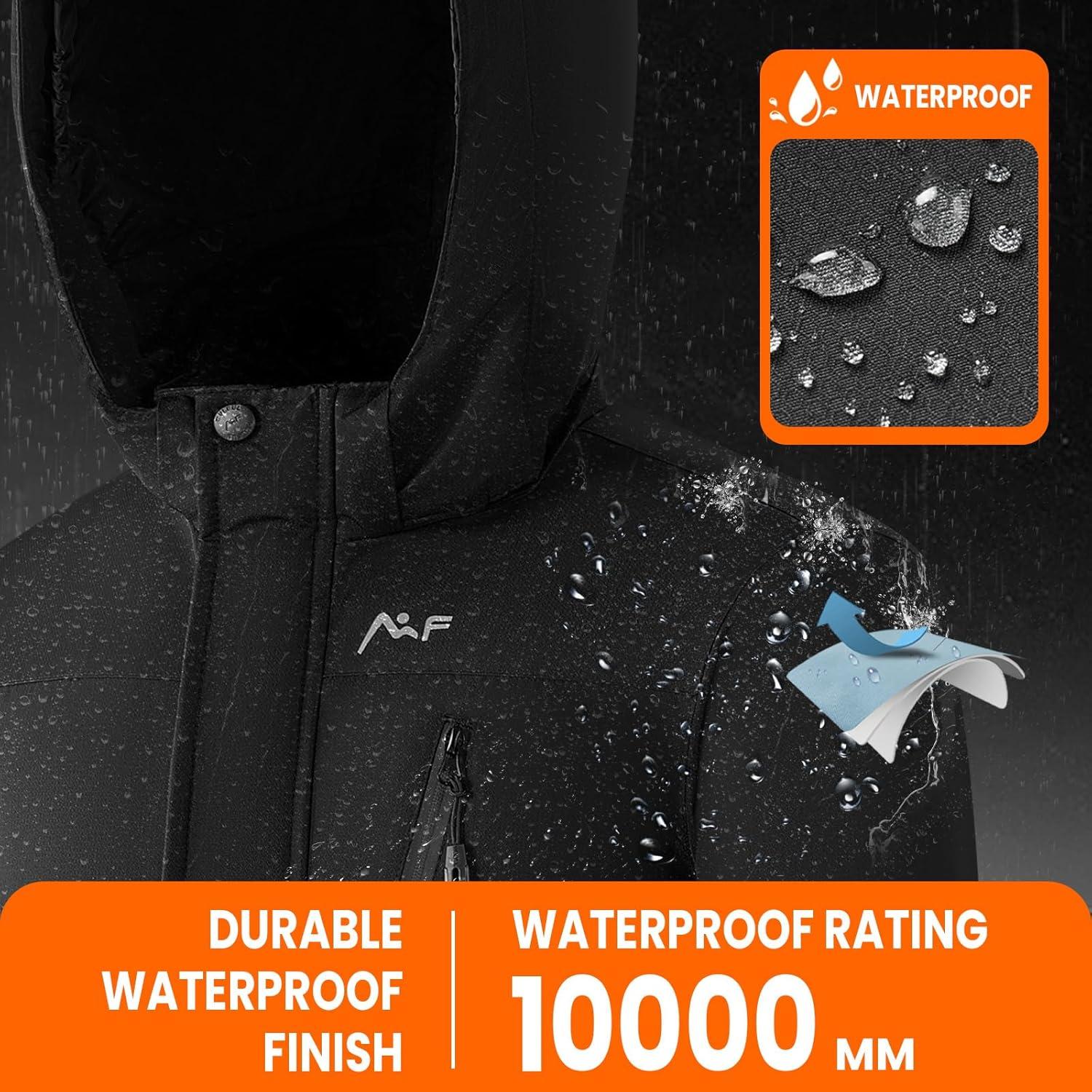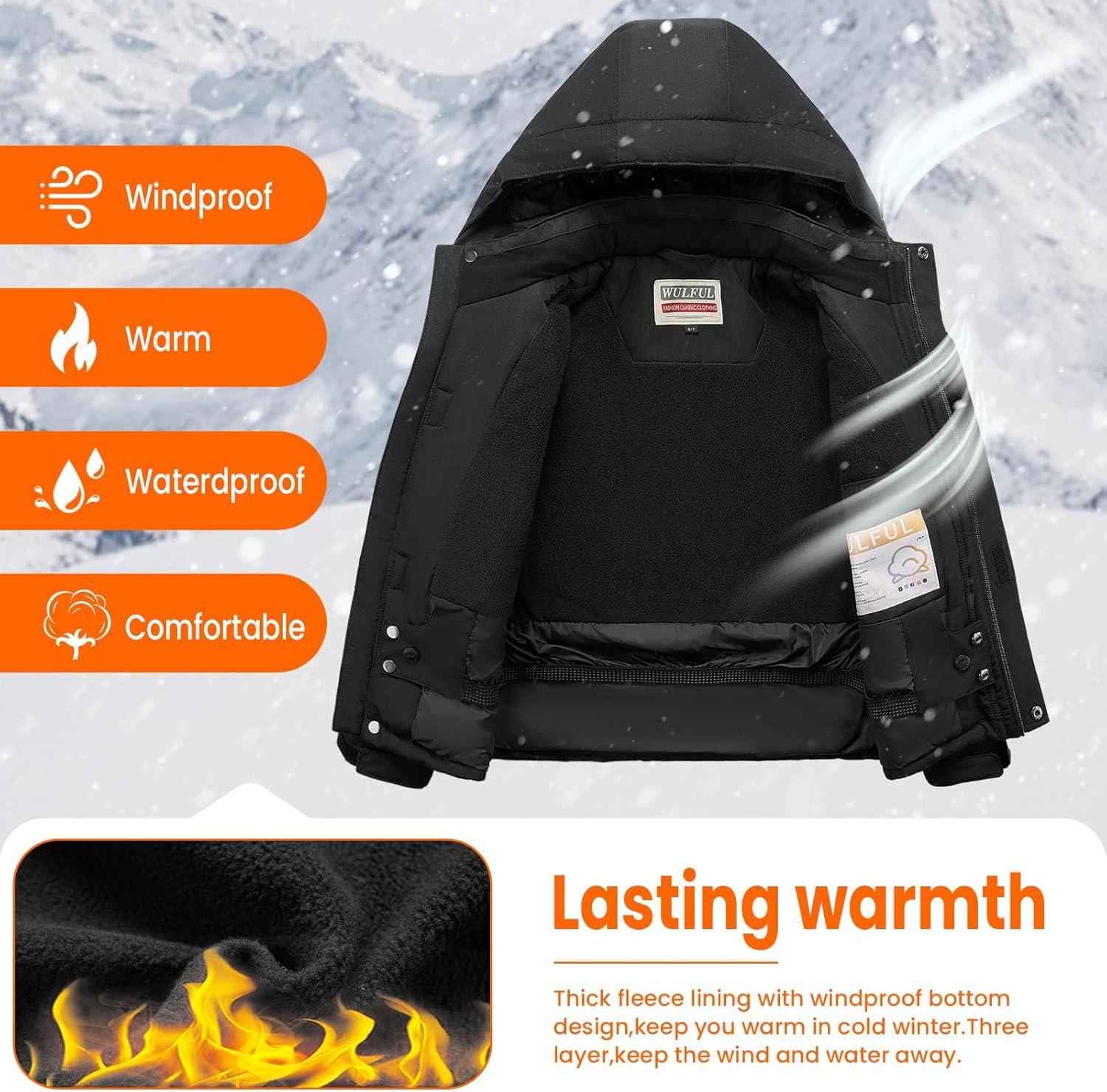 imageWULFUL Boys Winter Waterproof Ski Coat Kids Windproof Snow Jacket with Detachable HoodBlack