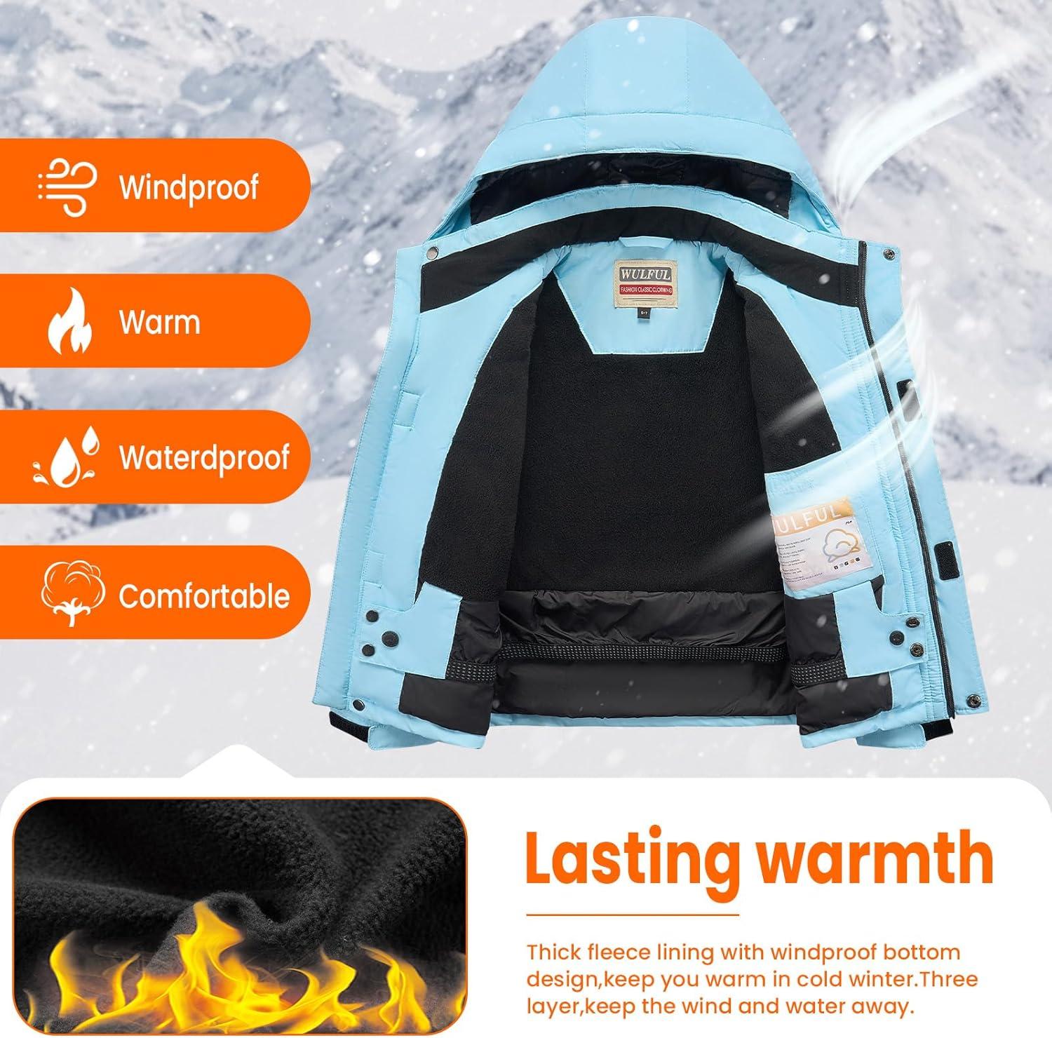 imageWULFUL Boys Winter Waterproof Ski Coat Kids Windproof Snow Jacket with Detachable HoodLight Blue