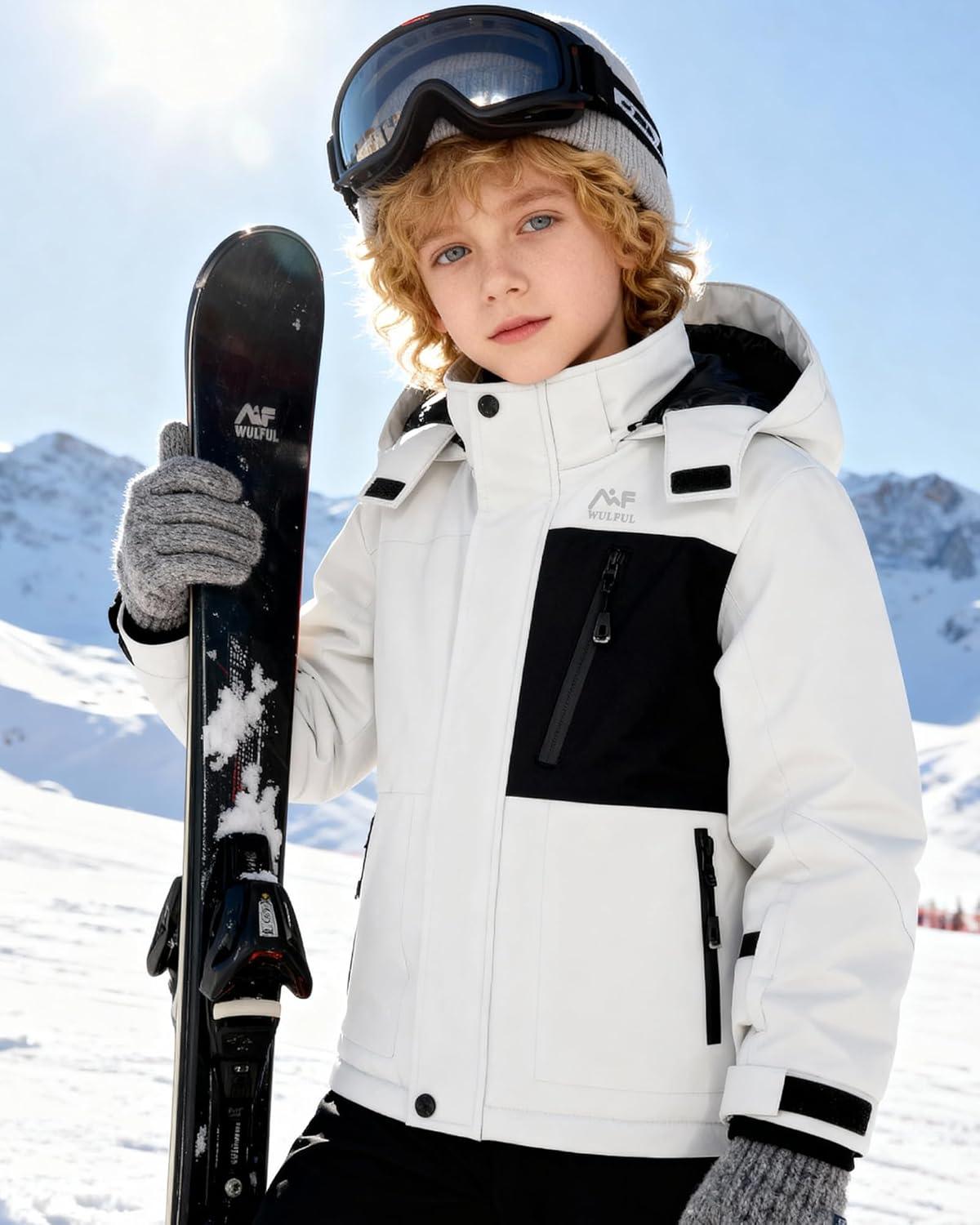 WULFUL Boy's Winter Waterproof Ski Coat Kids Windproof Snow Jacket with Detachable Hood(White)