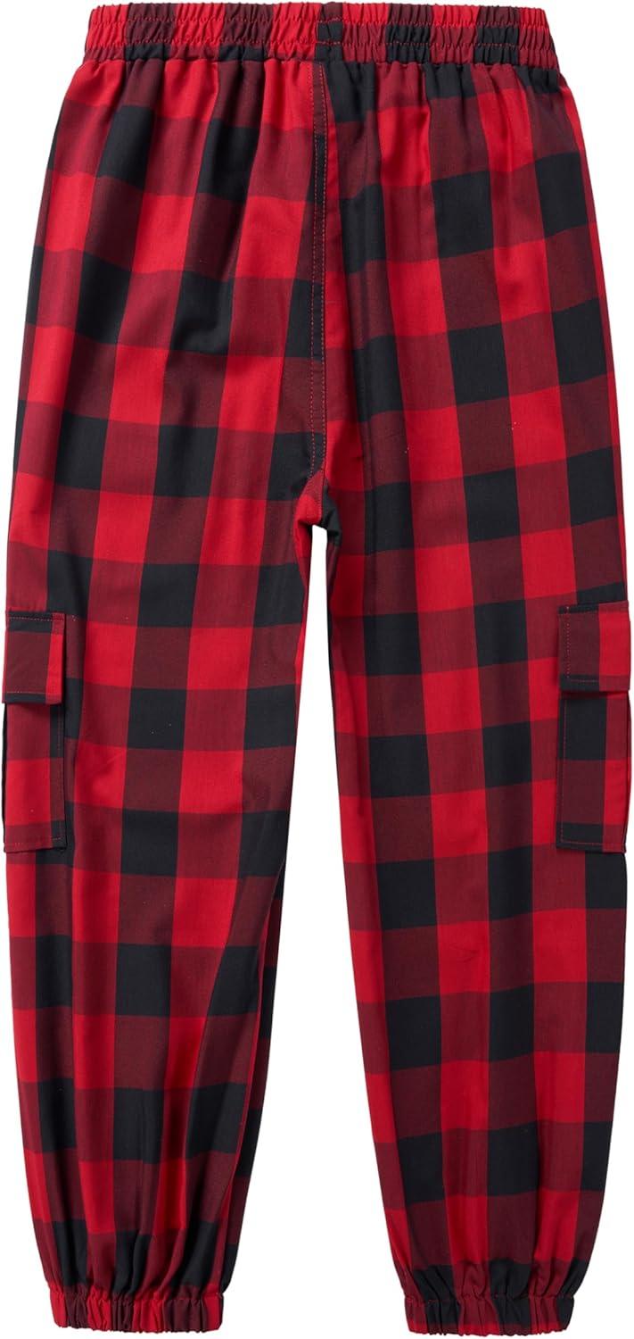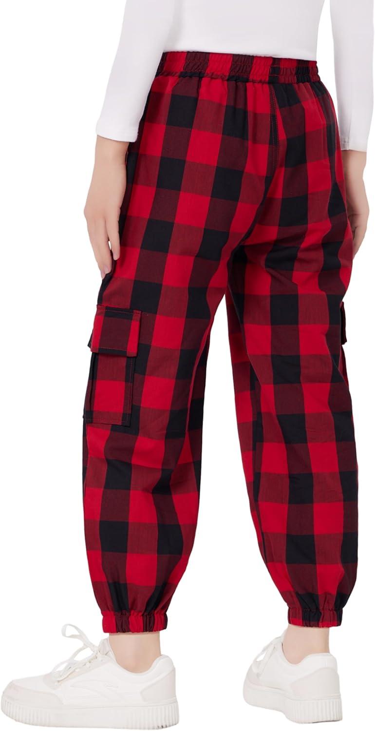 WULFUL Girl's Casual Cargo Jogger Pants Adjustable Waist(Red Black Plaid)