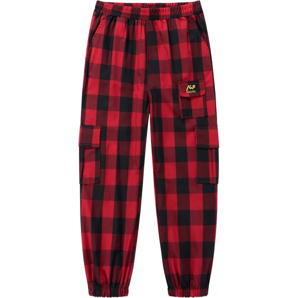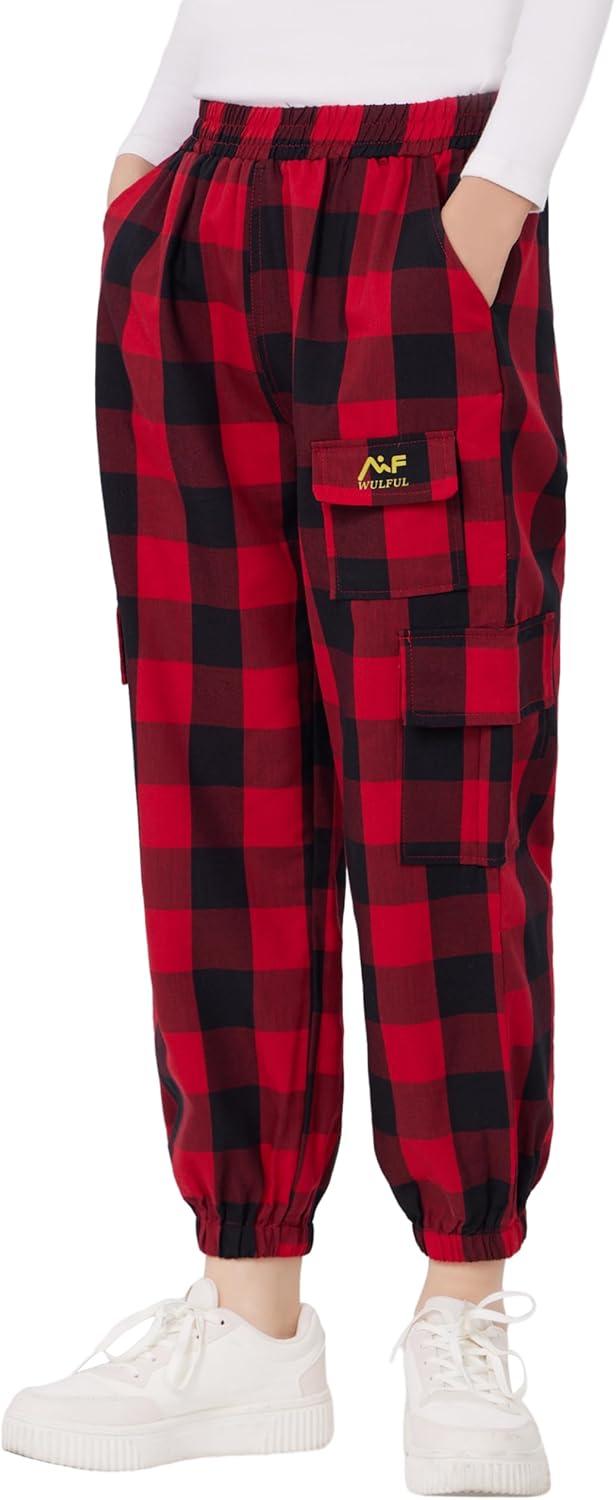 WULFUL Girl’s Casual Cargo Jogger Pants Adjustable Waist(Red Black Plaid)