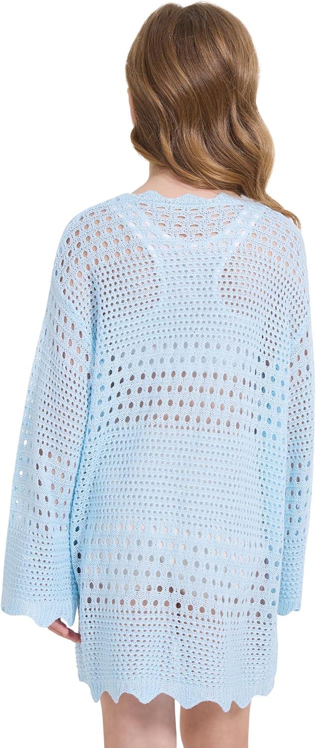 imageWULFUL Girls Crochet Long Sleeve Swimwear Cover Up Summer Beach Dress SwimsuitBlue