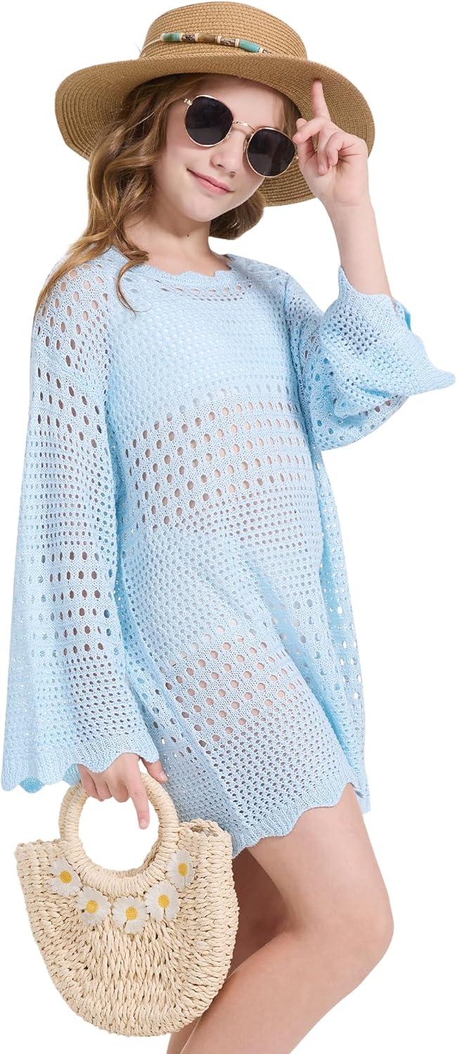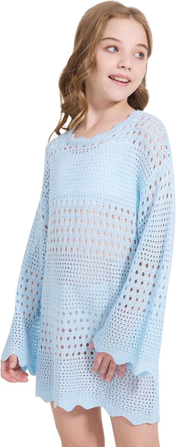 WULFUL Girl’s Crochet Long Sleeve Swimwear Cover Up Summer Beach Dress Swimsuit(Blue)