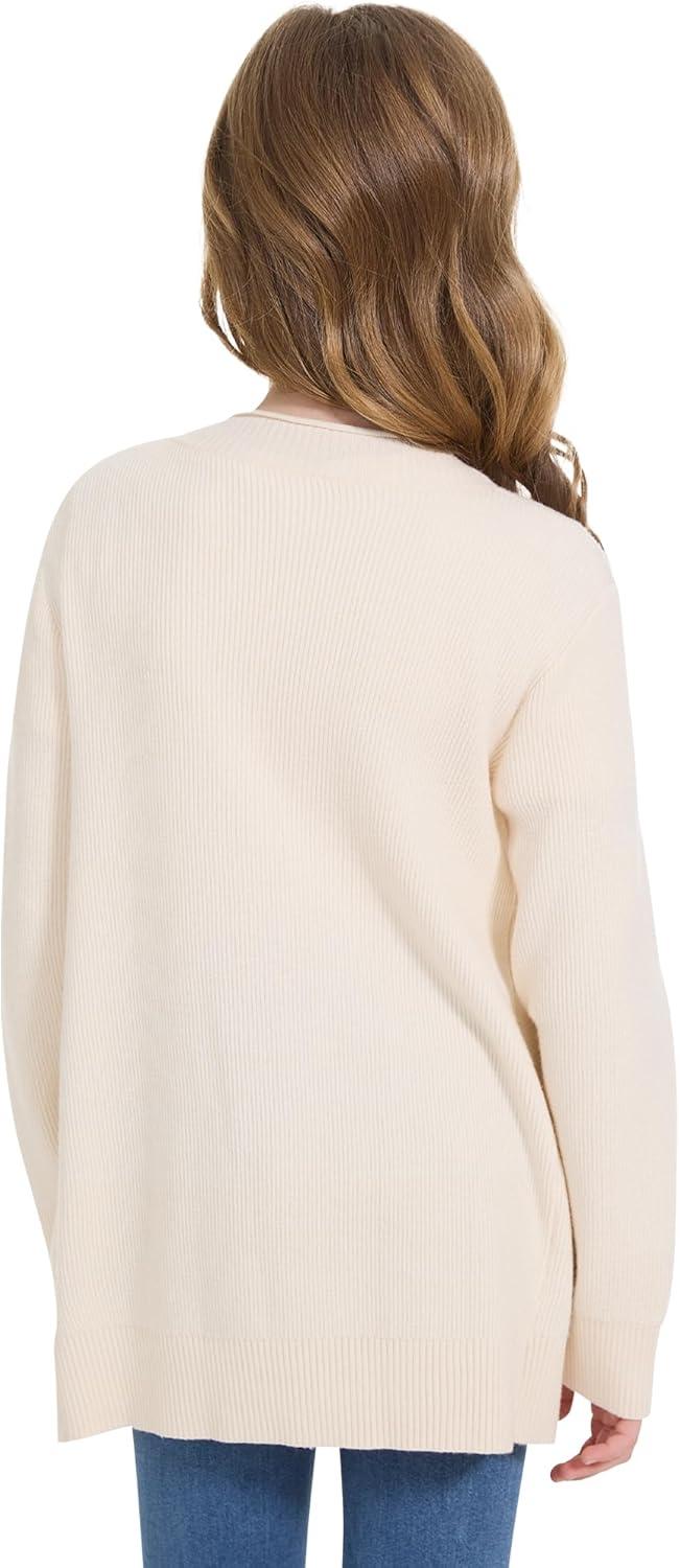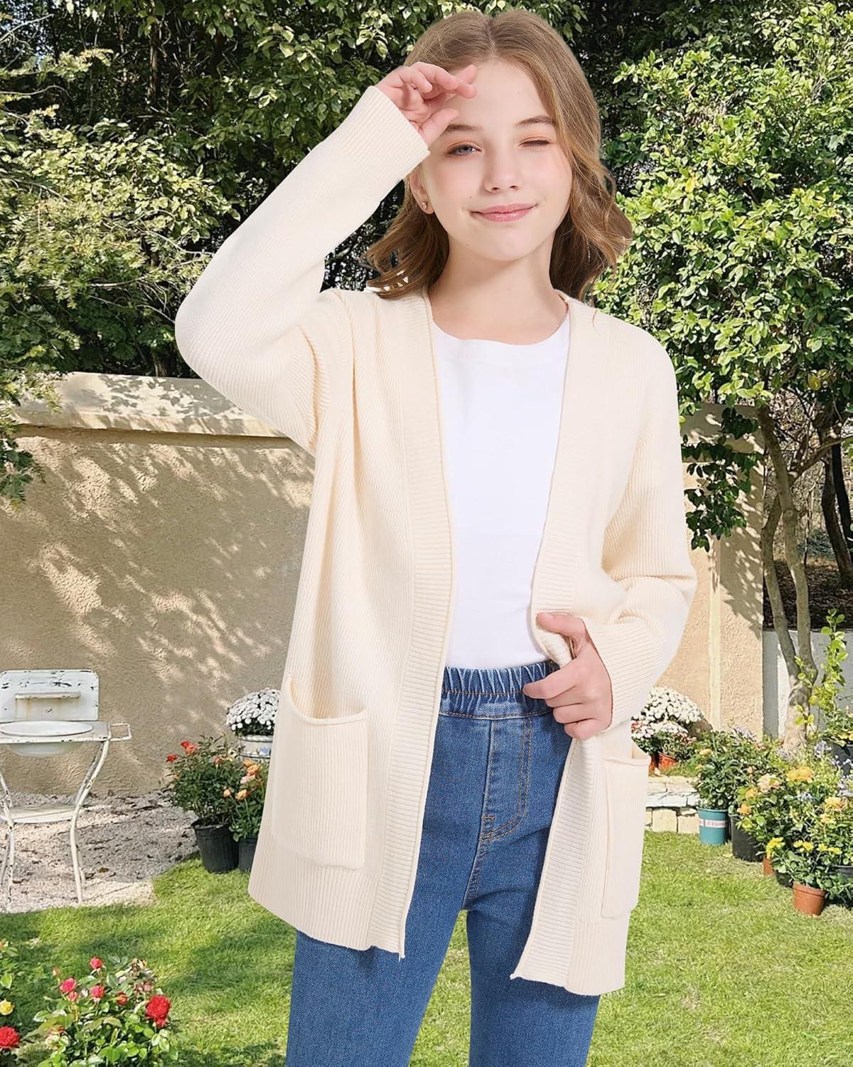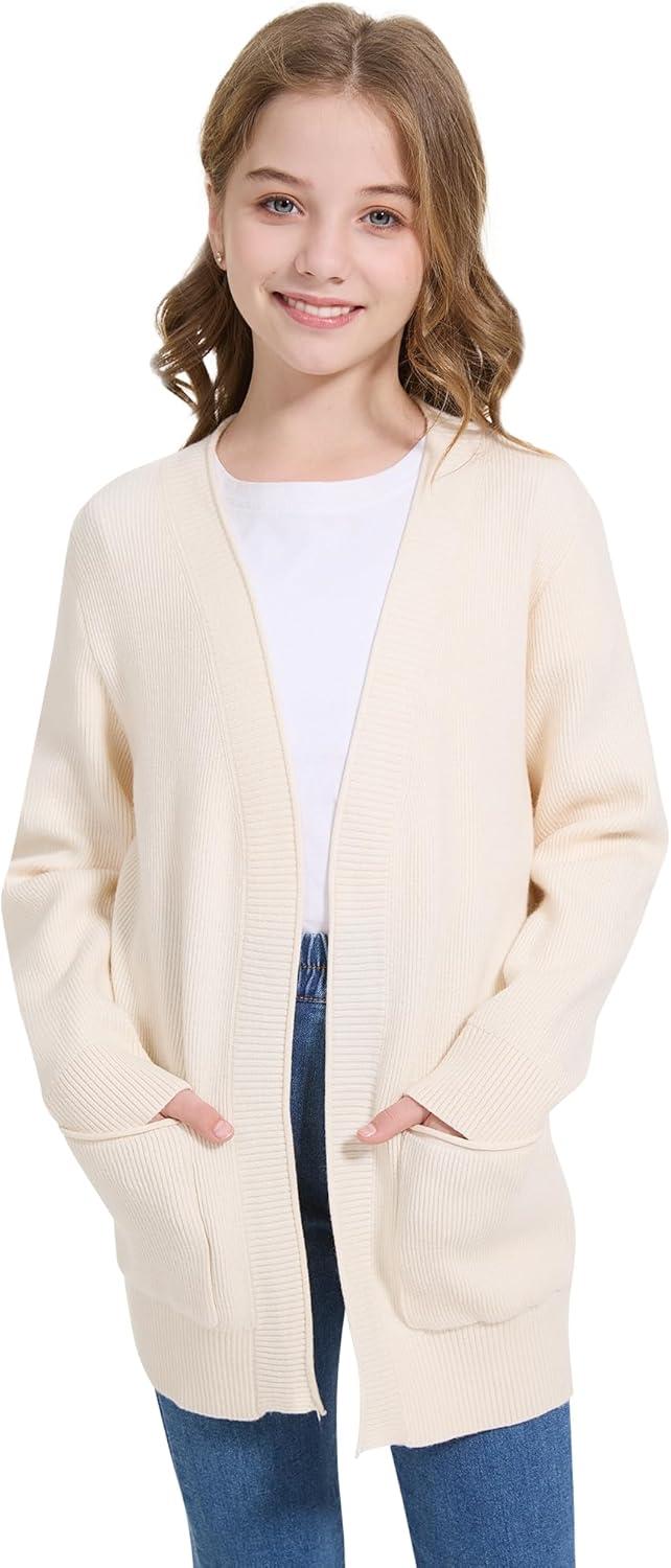 WULFUL Girls Long Sleeve Cardigan Kids Casual Open Front Oversized Sweater with Pockets(White)