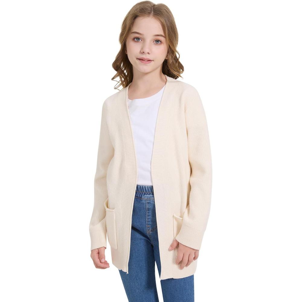 imageWULFUL Girls Long Sleeve Cardigan Kids Casual Open Front Oversized Sweater with PocketsWhite