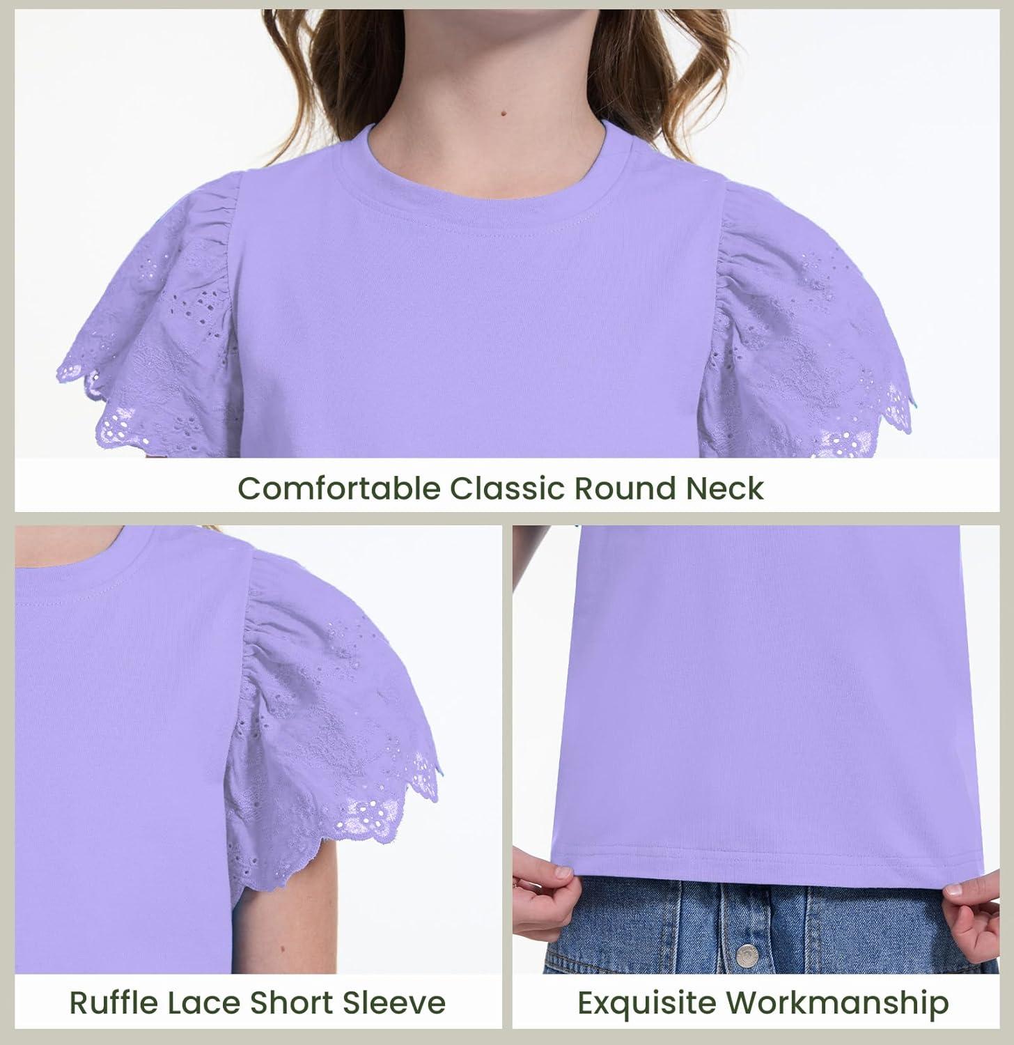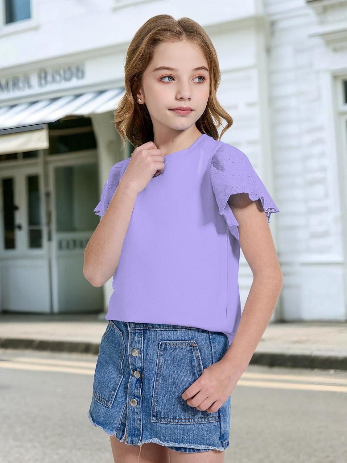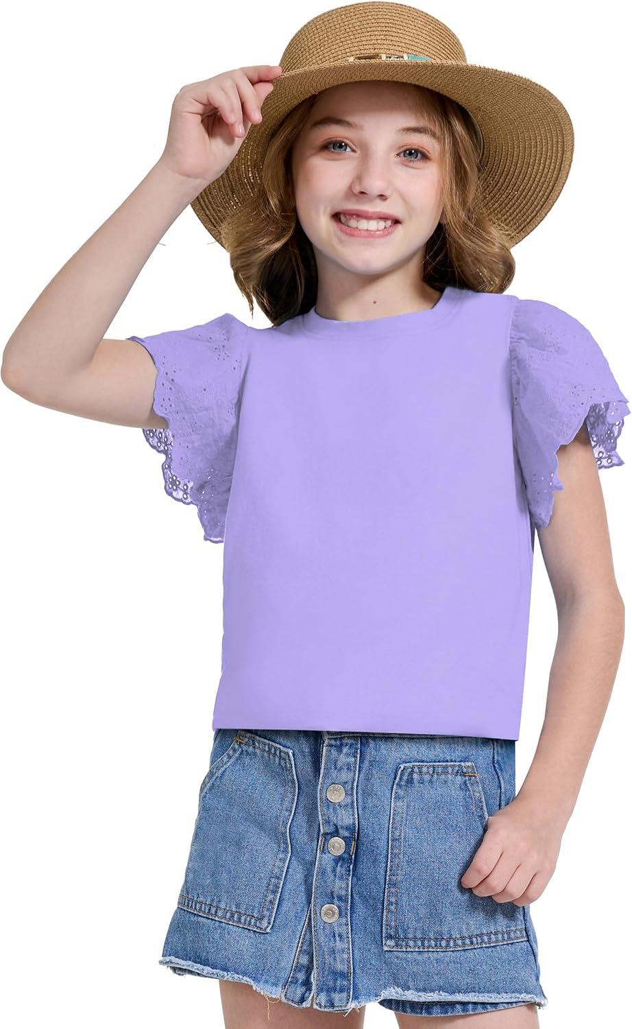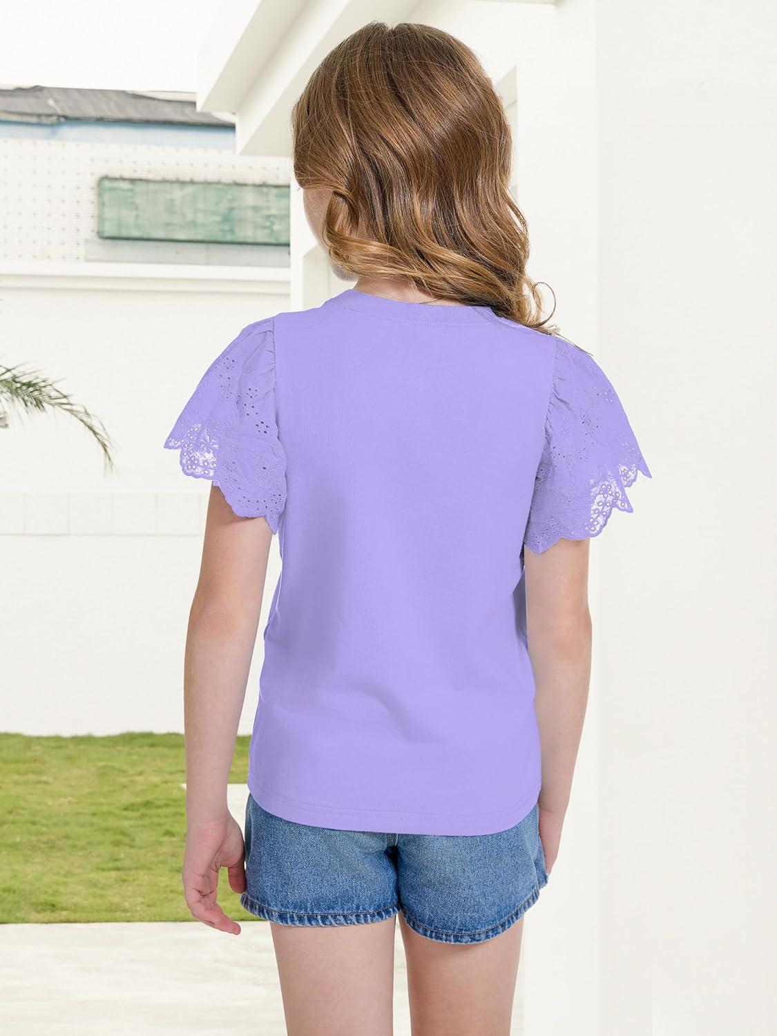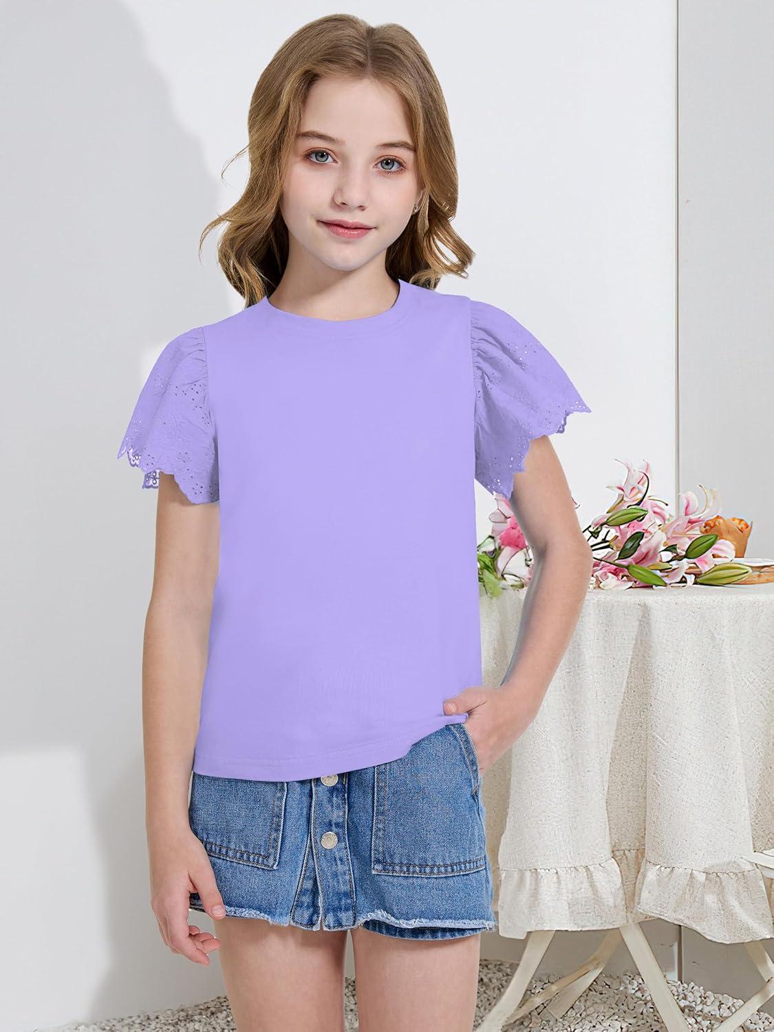 WULFUL Girls Shirts Fashion Cotton Summer Short Sleeve Tops Casual T-Shirts 4-15 Years Old(Light Purple)