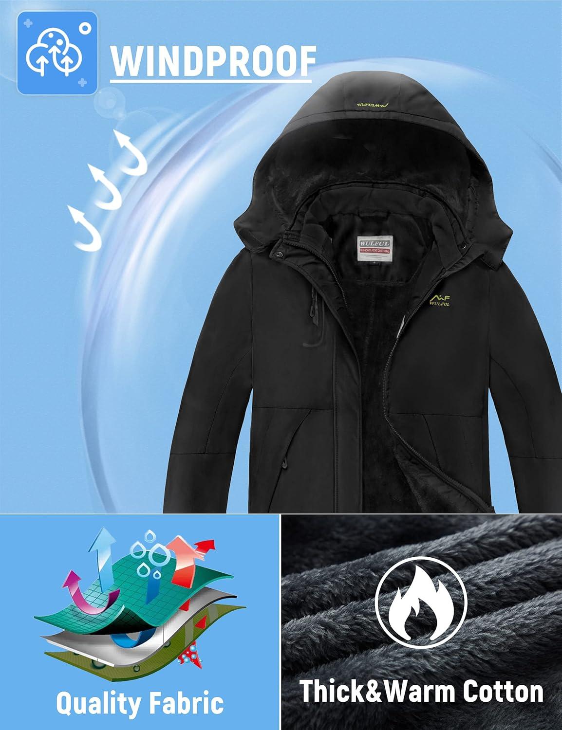 imageWULFUL Girls Waterproof Ski Jacket Warm Fleece Hooded Winter Snow CoatBlack