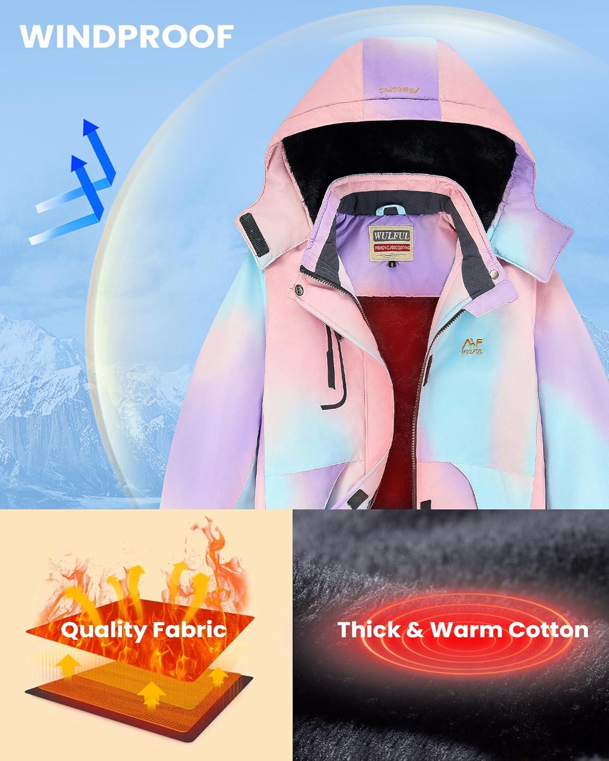 imageWULFUL Girls Waterproof Ski Jacket Warm Fleece Hooded Winter Snow CoatPinkgreen