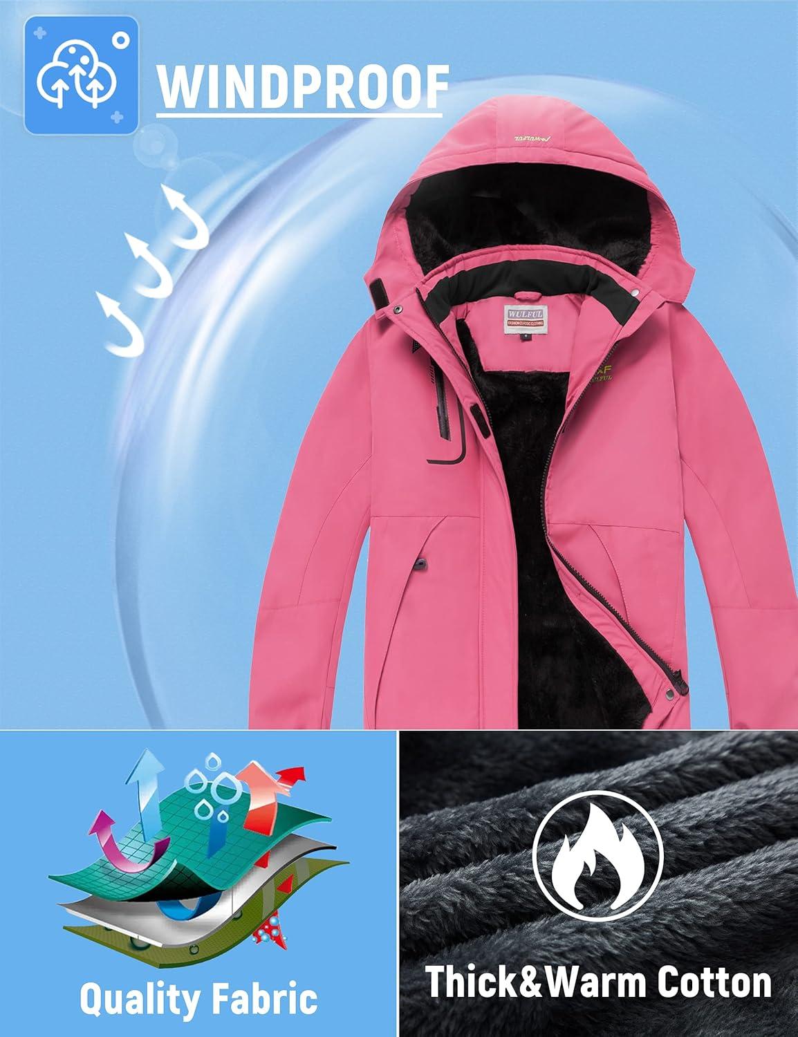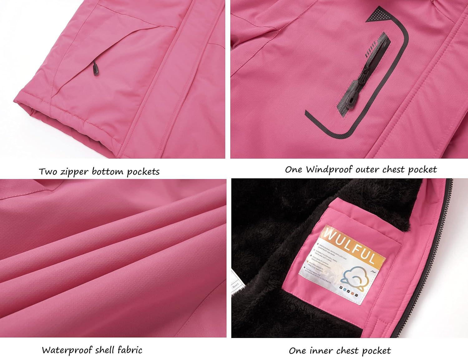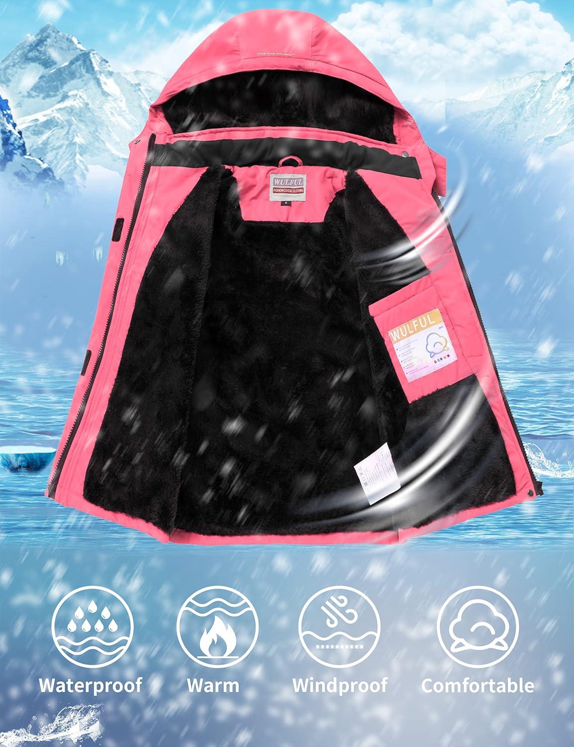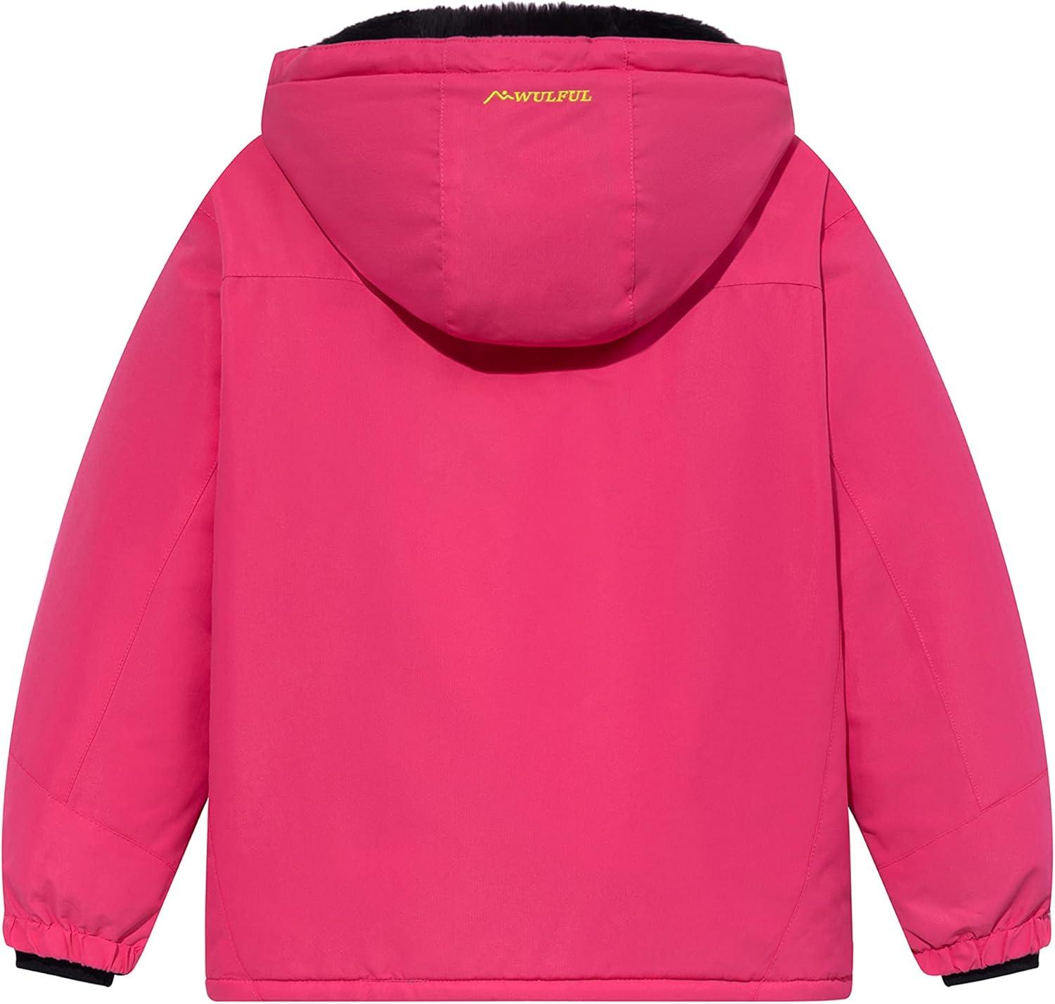 WULFUL Girl's Waterproof Ski Jacket Warm Fleece Hooded Winter Snow Coat(Rose Red)