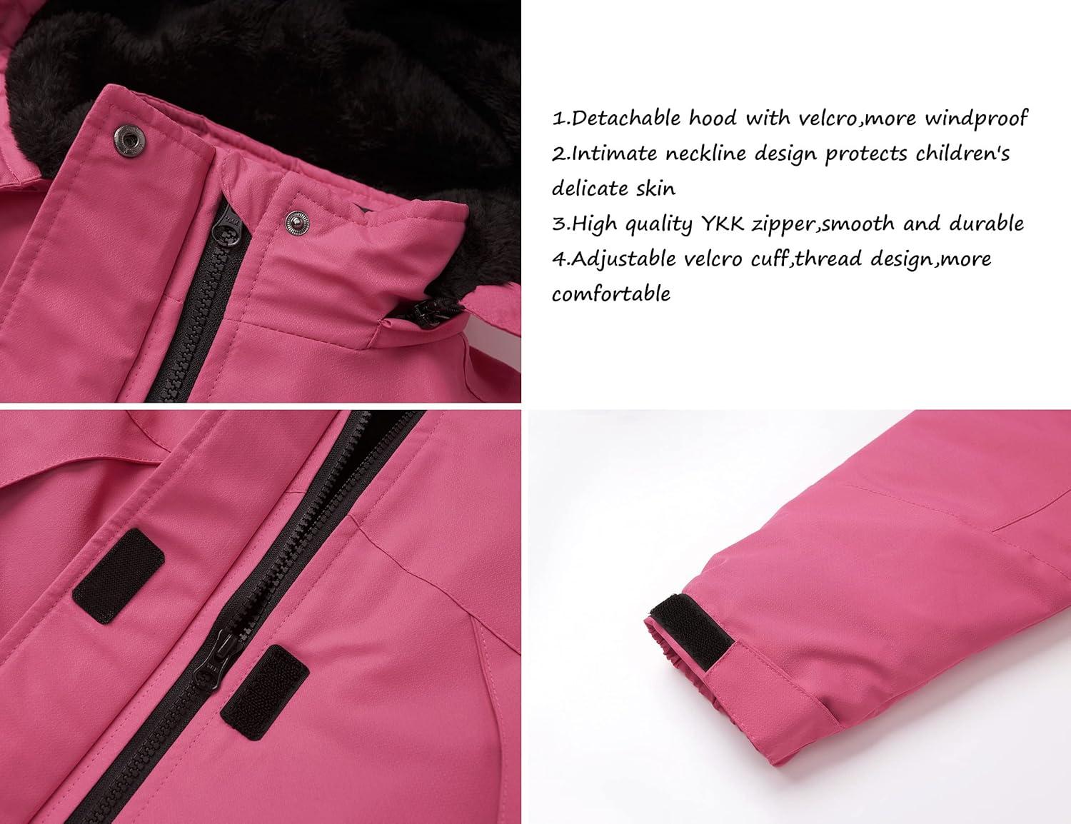 WULFUL Girl’s Waterproof Ski Jacket Warm Fleece Hooded Winter Snow Coat(Rose Red)