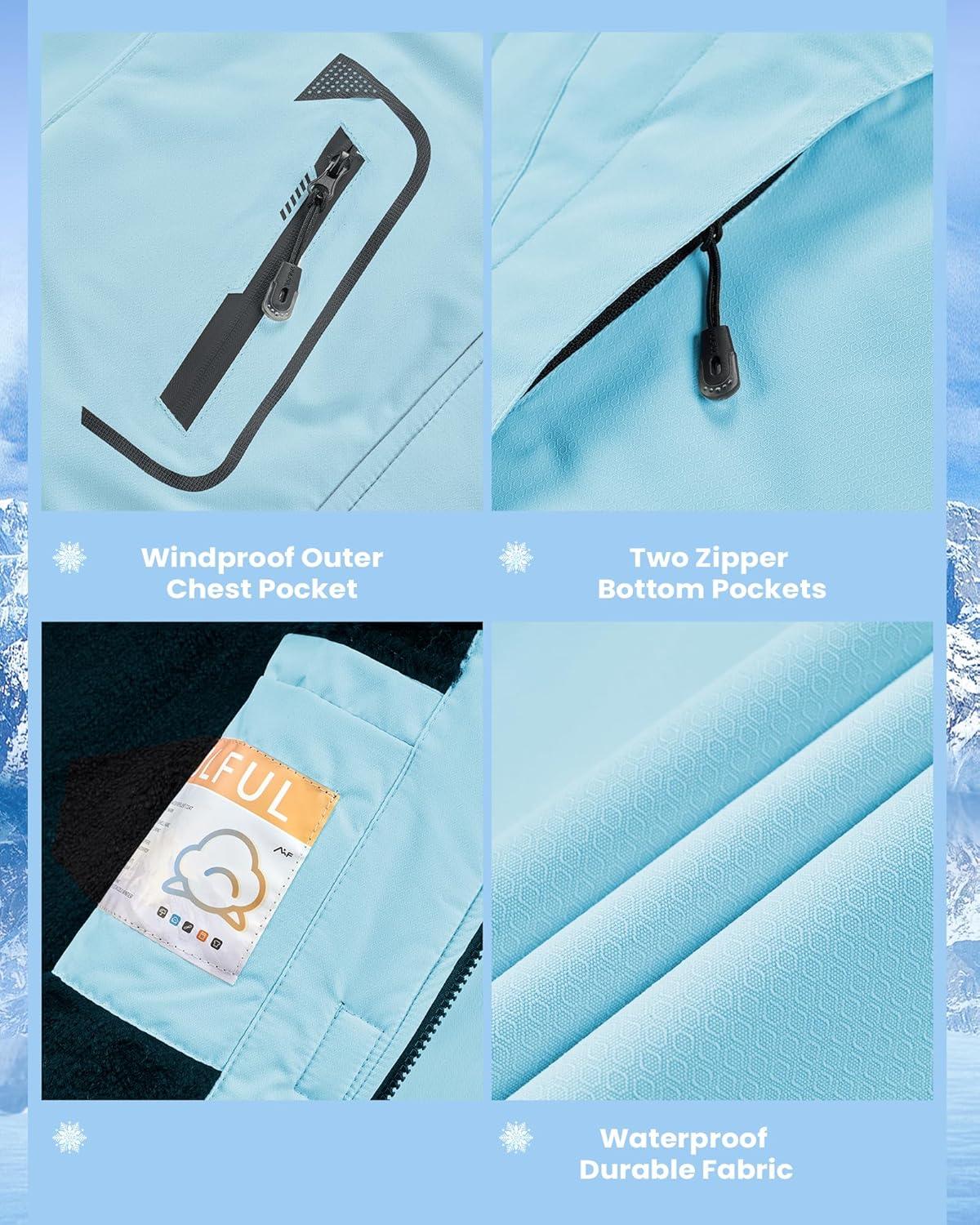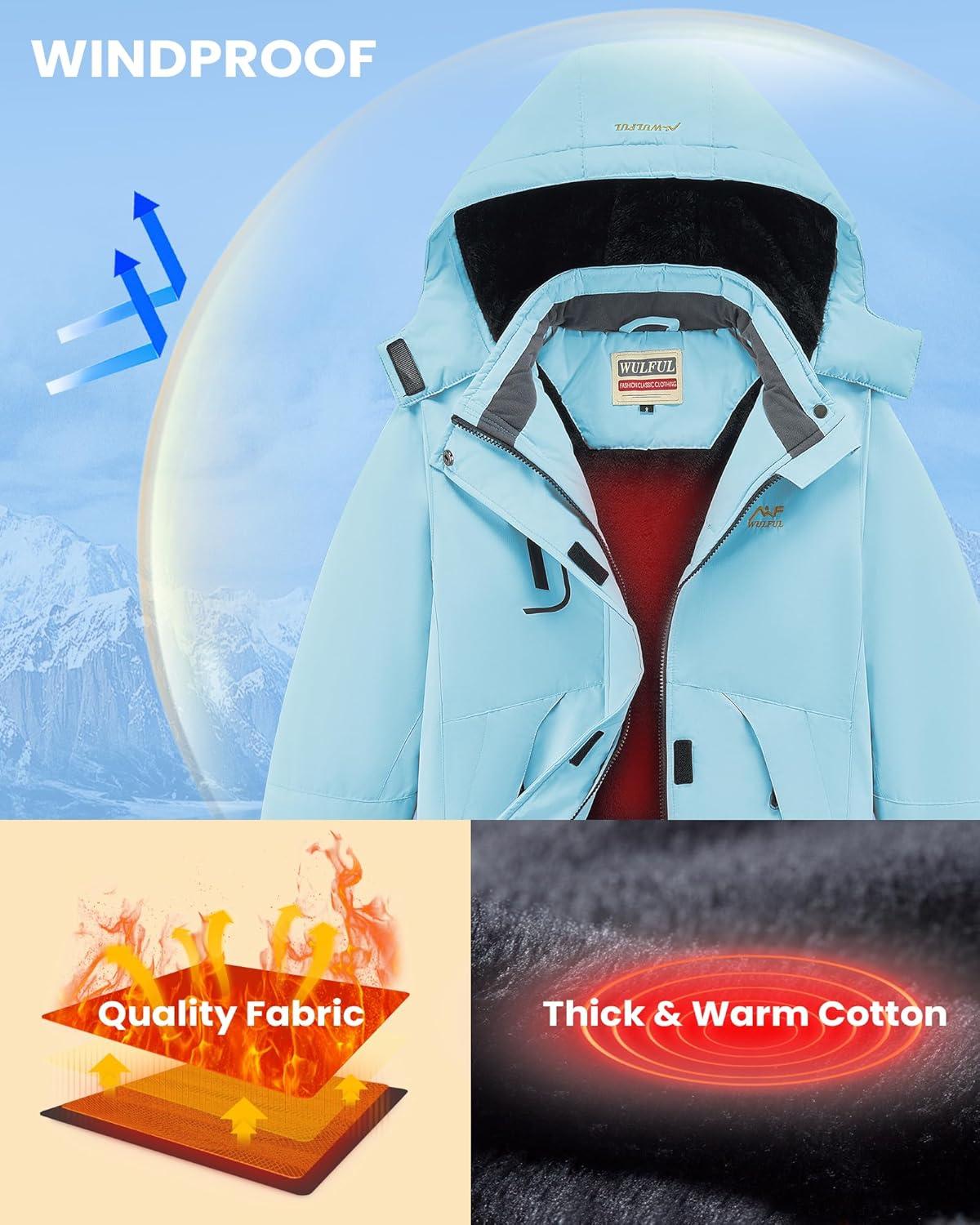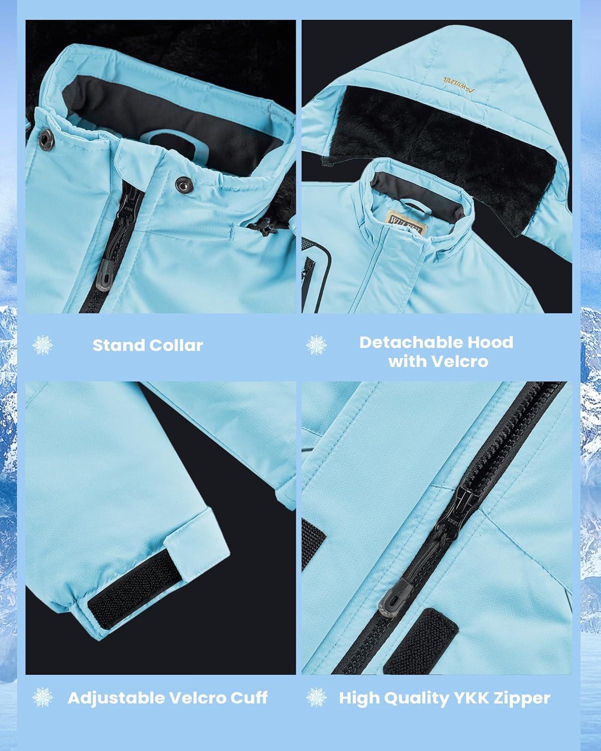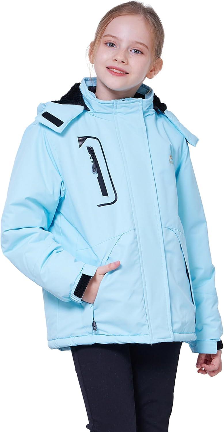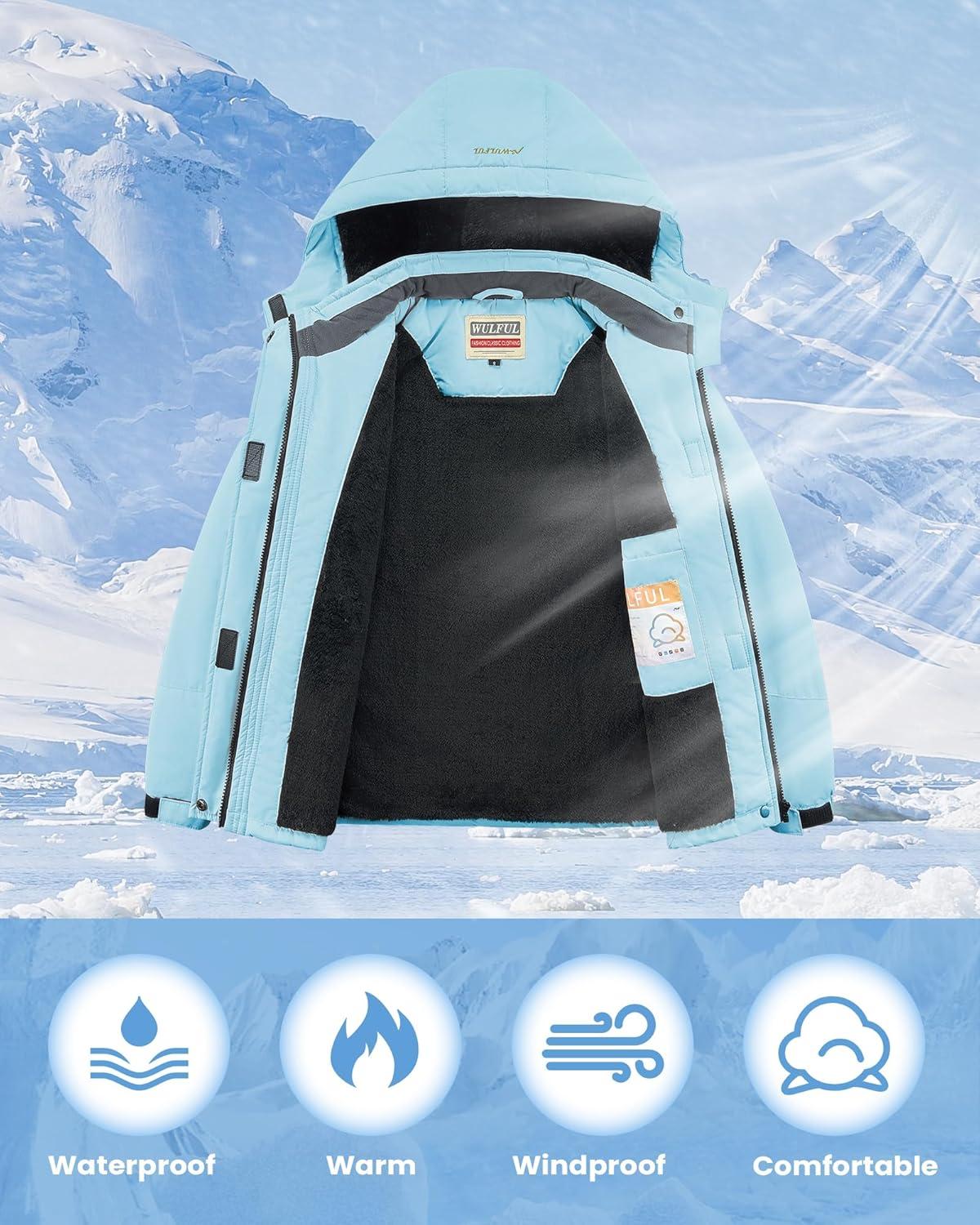 WULFUL Girl’s Waterproof Ski Jacket Warm Fleece Hooded Winter Snow Coat(Sky Blue)