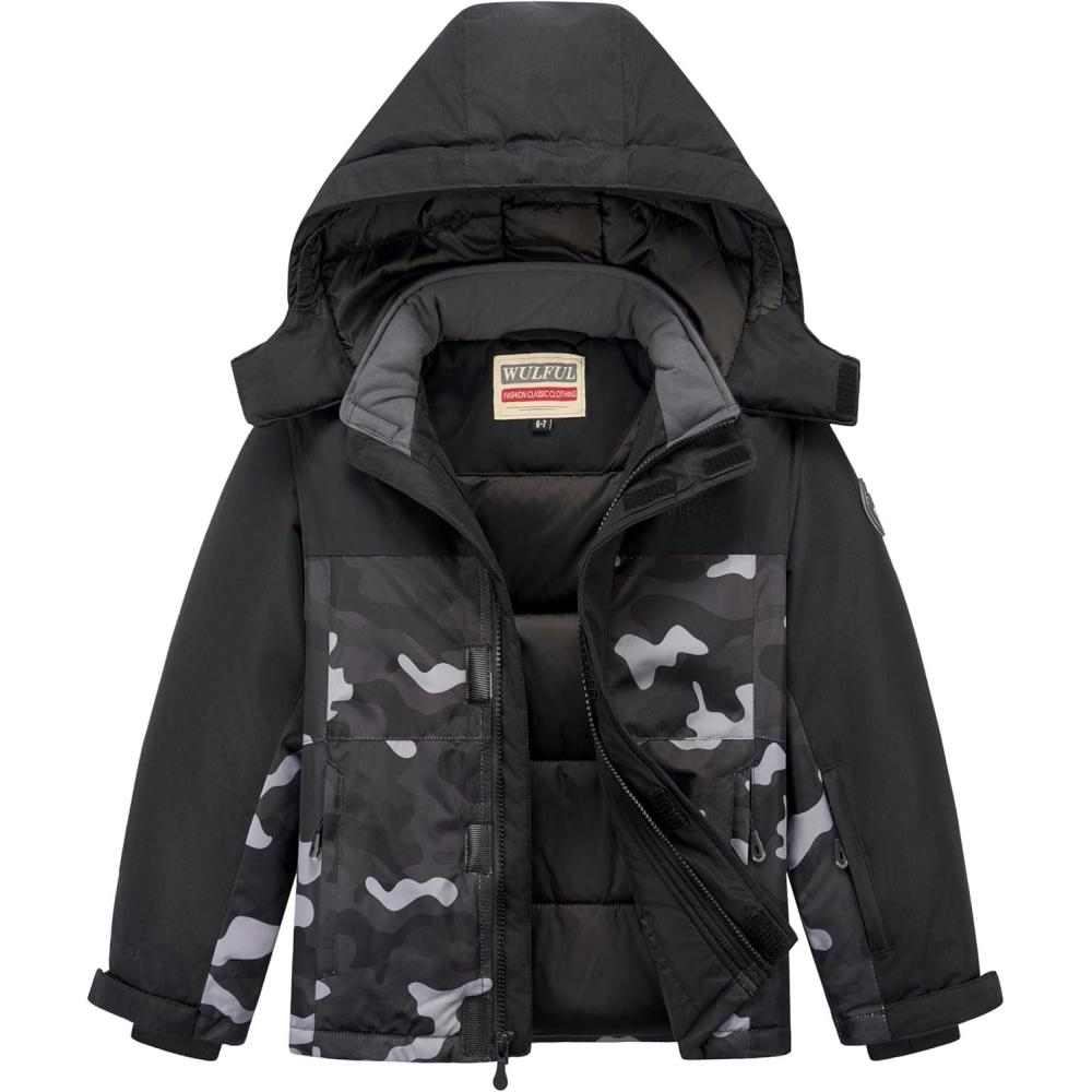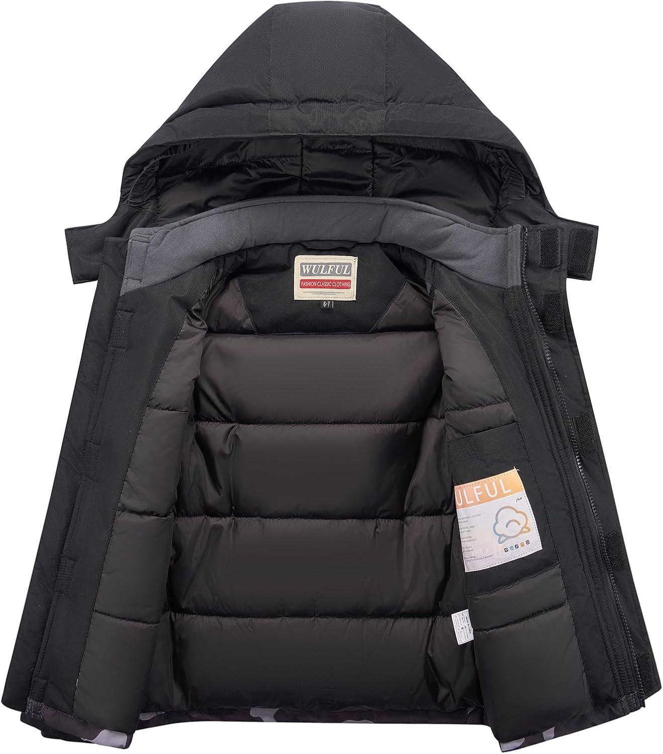 WULFUL Kid's Waterproof Ski Jacket Warm Fleece Hooded Boy's and Girl's Winter Snow Coat Outwear,Windproof RainCoat(Black Camouflage)
