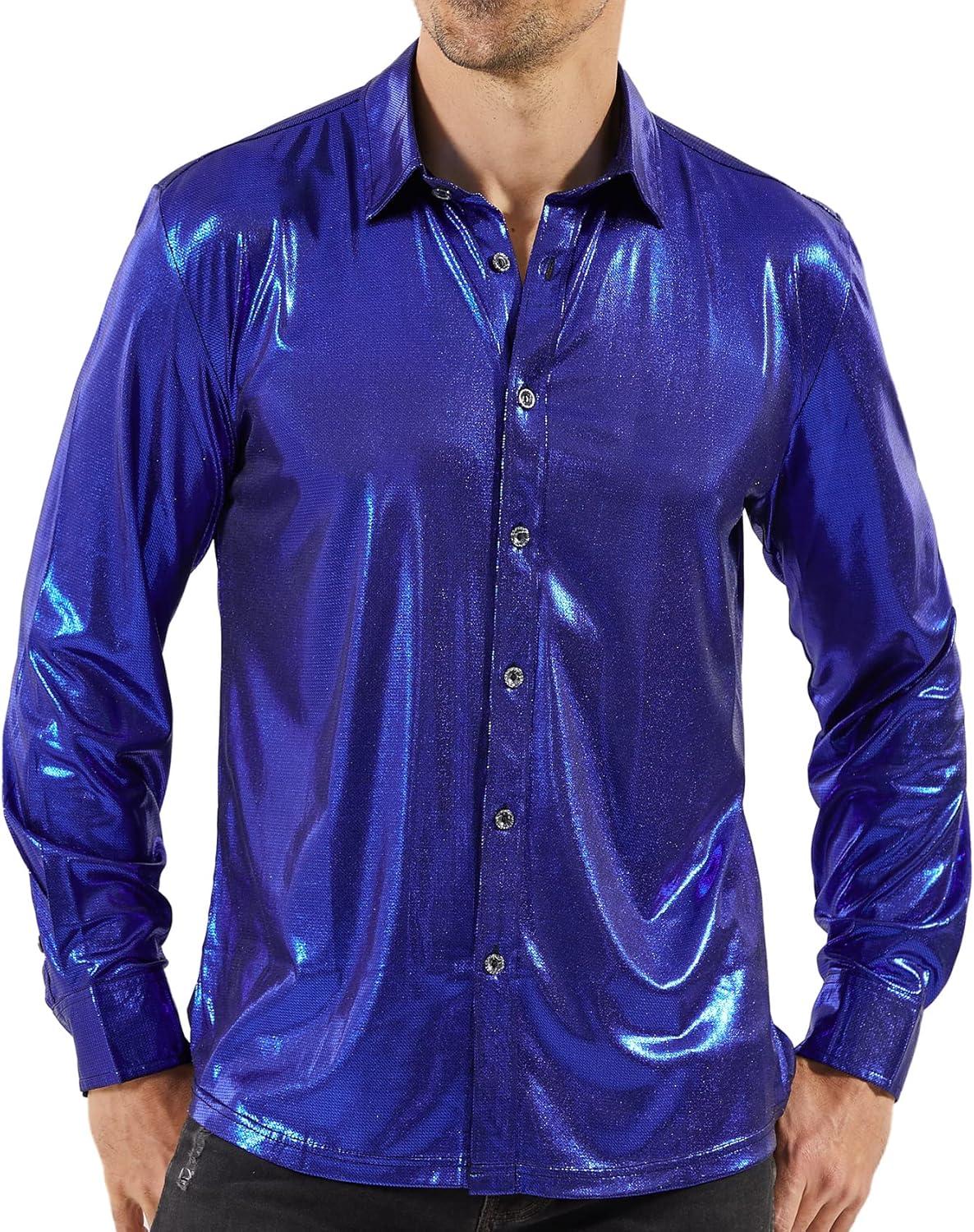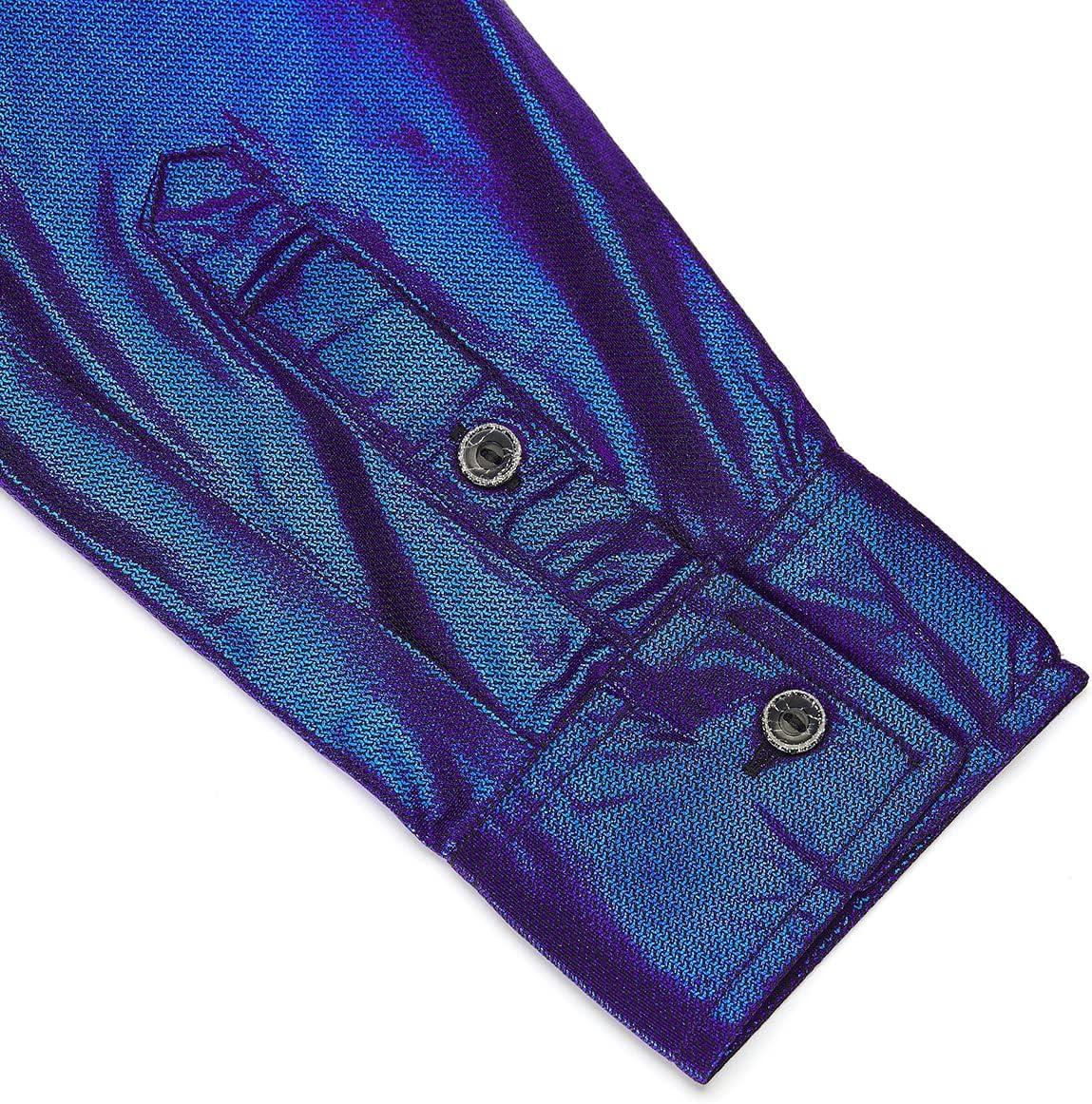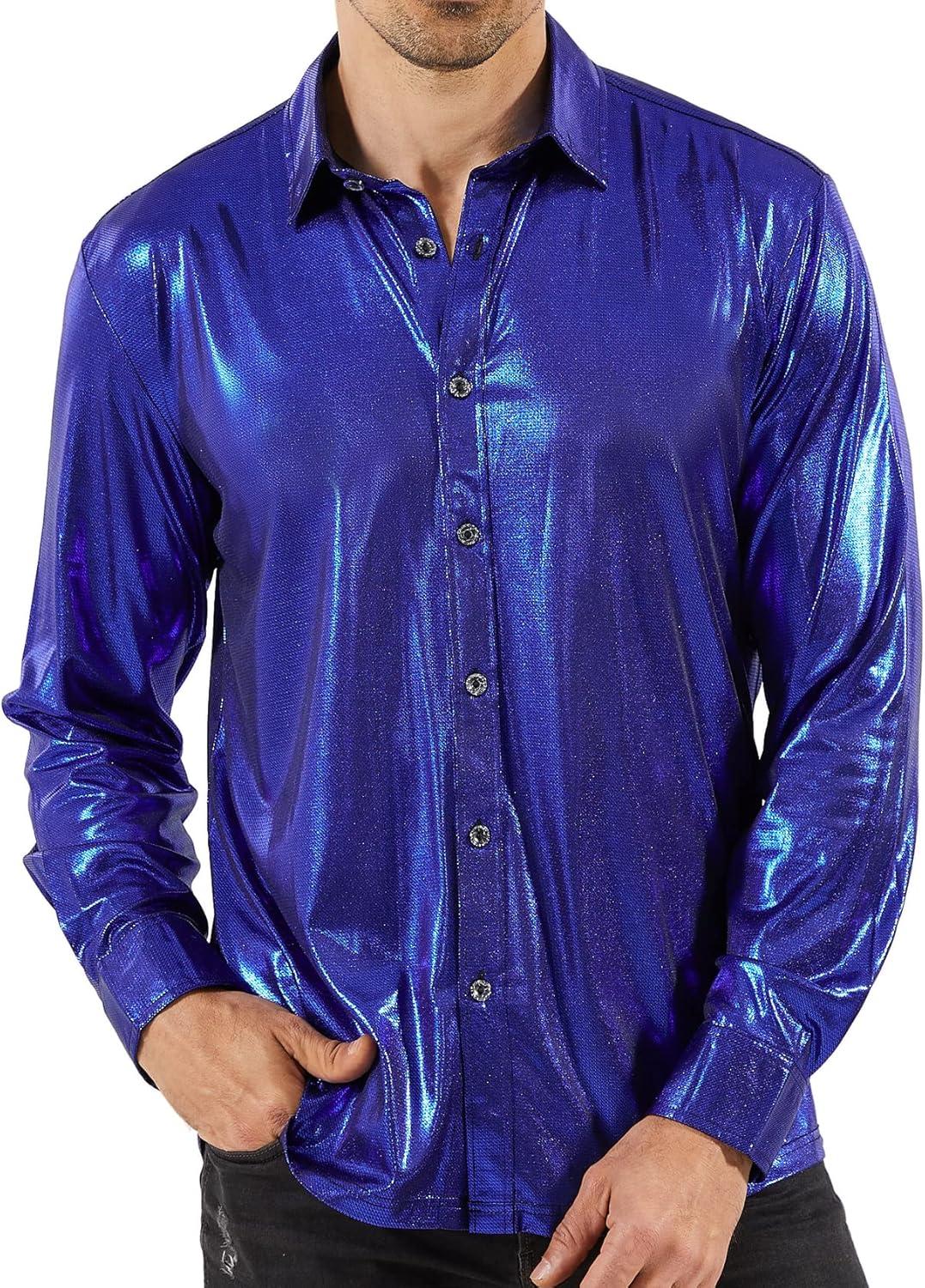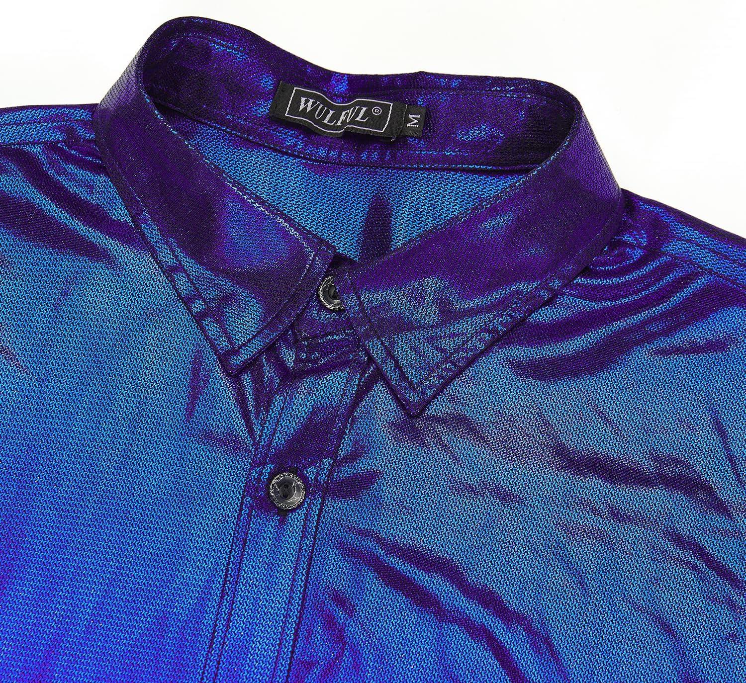 WULFUL Men Dress Shirt Sequins Long Sleeve Button Down Shirt Luxury Disco Party Nightclub Christmas Prom Costume(Blue0156)