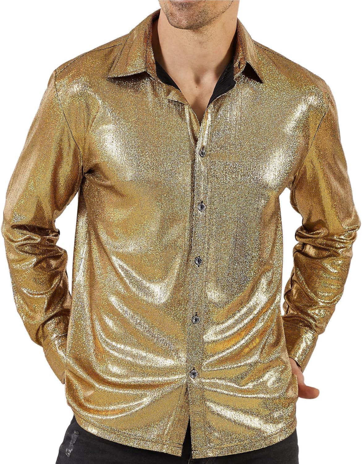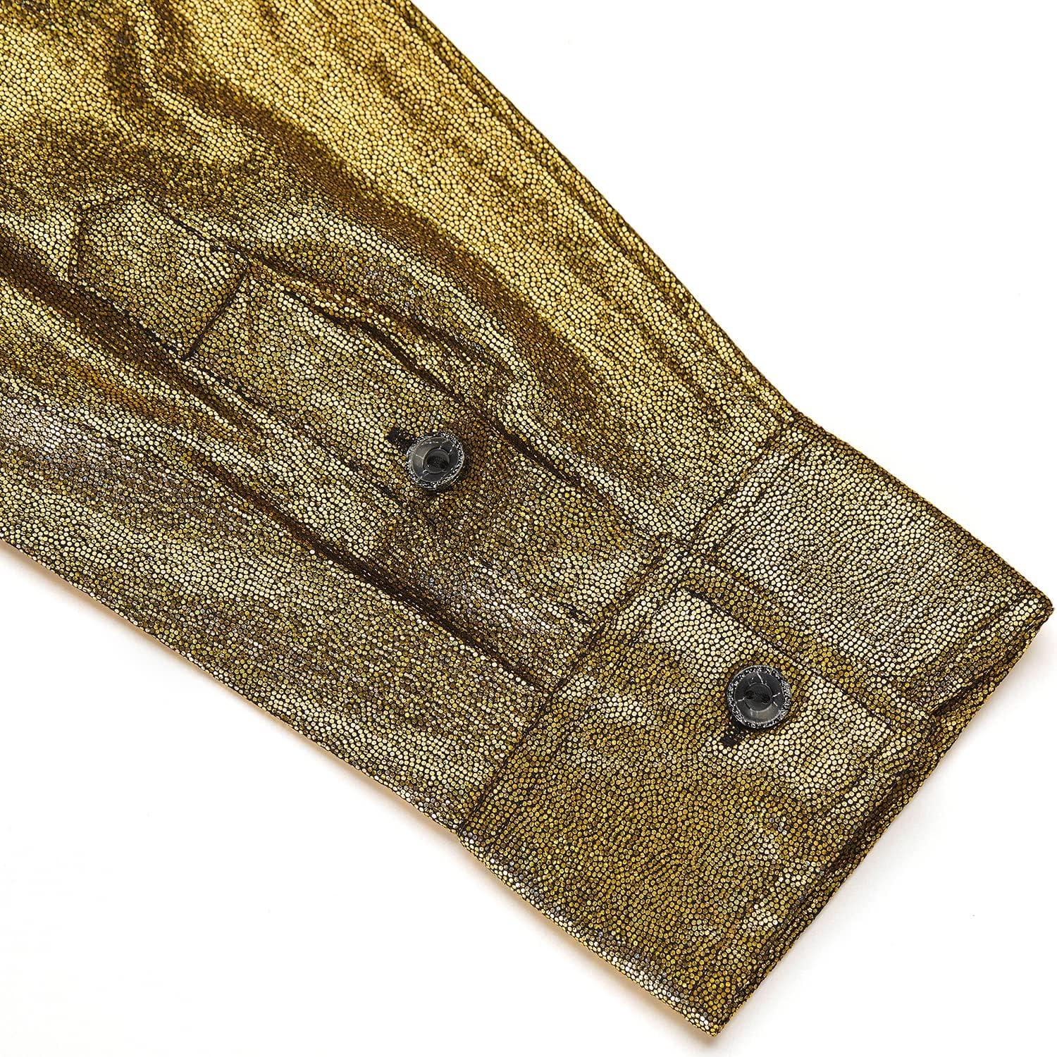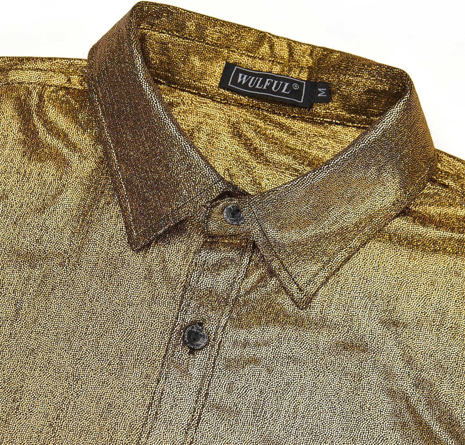 WULFUL Men Dress Shirt Sequins Long Sleeve Button Down Shirt Luxury Disco Party Nightclub Christmas Prom Costume(Gold0155)