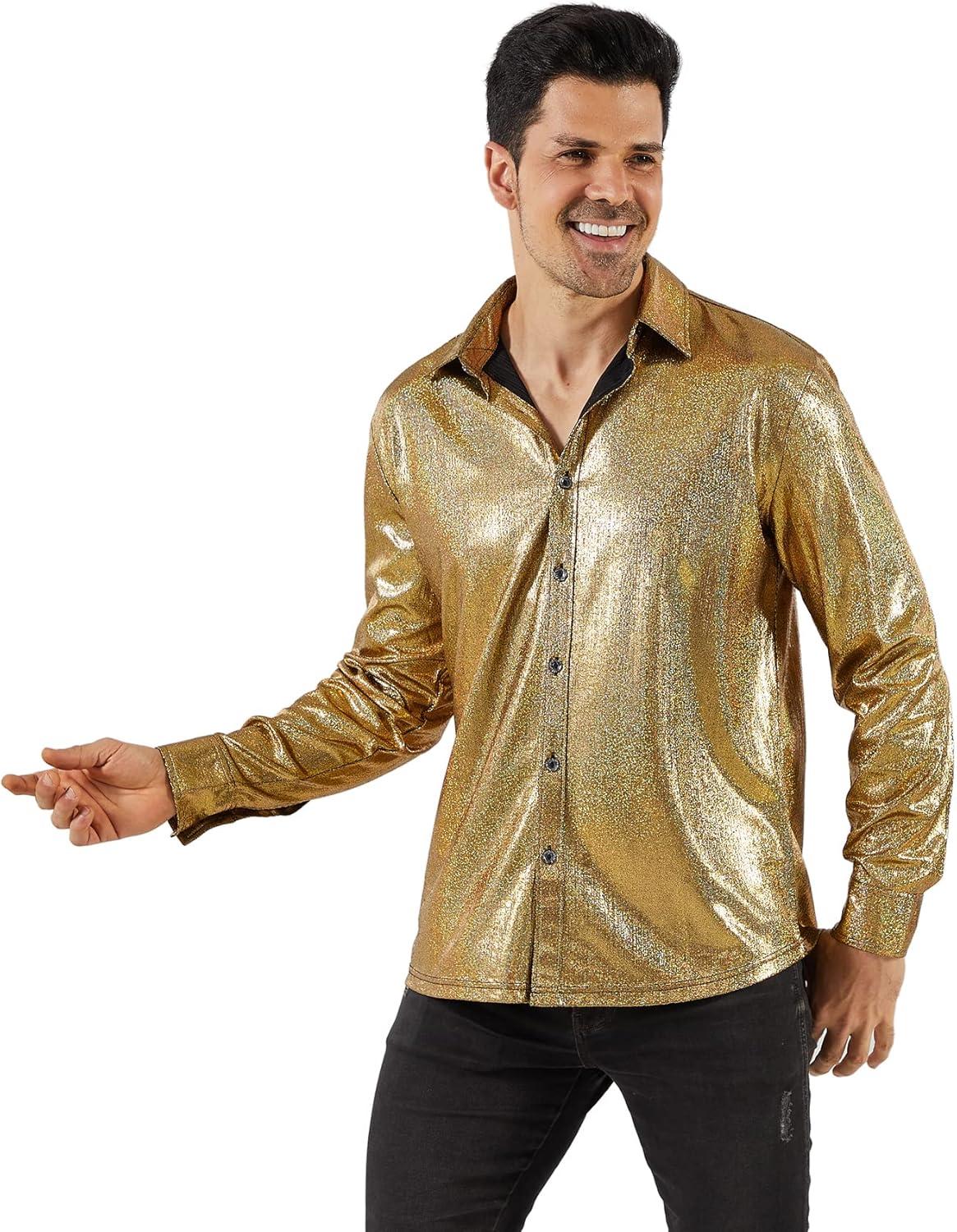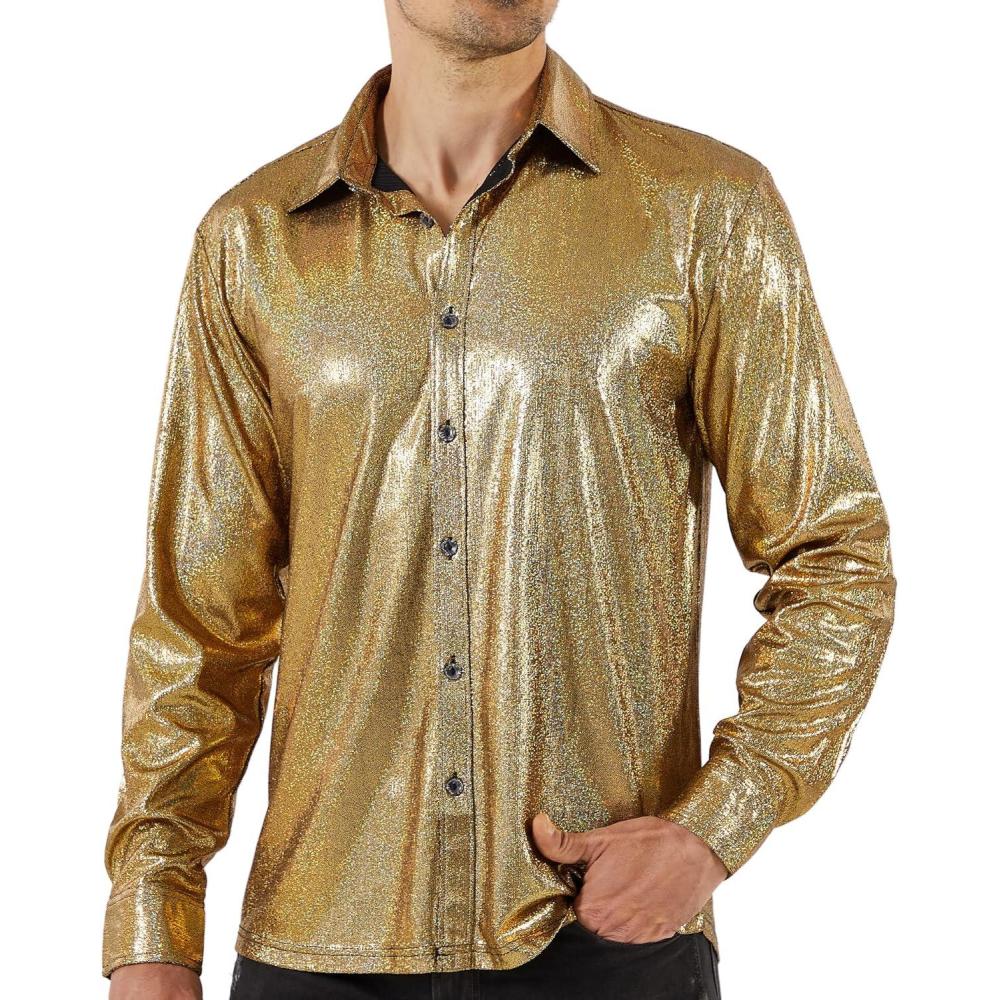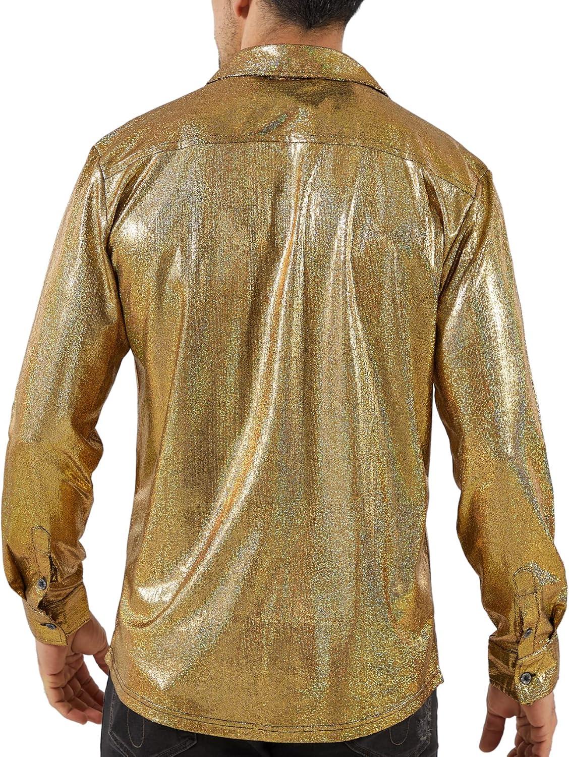 WULFUL Men Dress Shirt Sequins Long Sleeve Button Down Shirt Luxury Disco Party Nightclub Christmas Prom Costume(Gold0155)