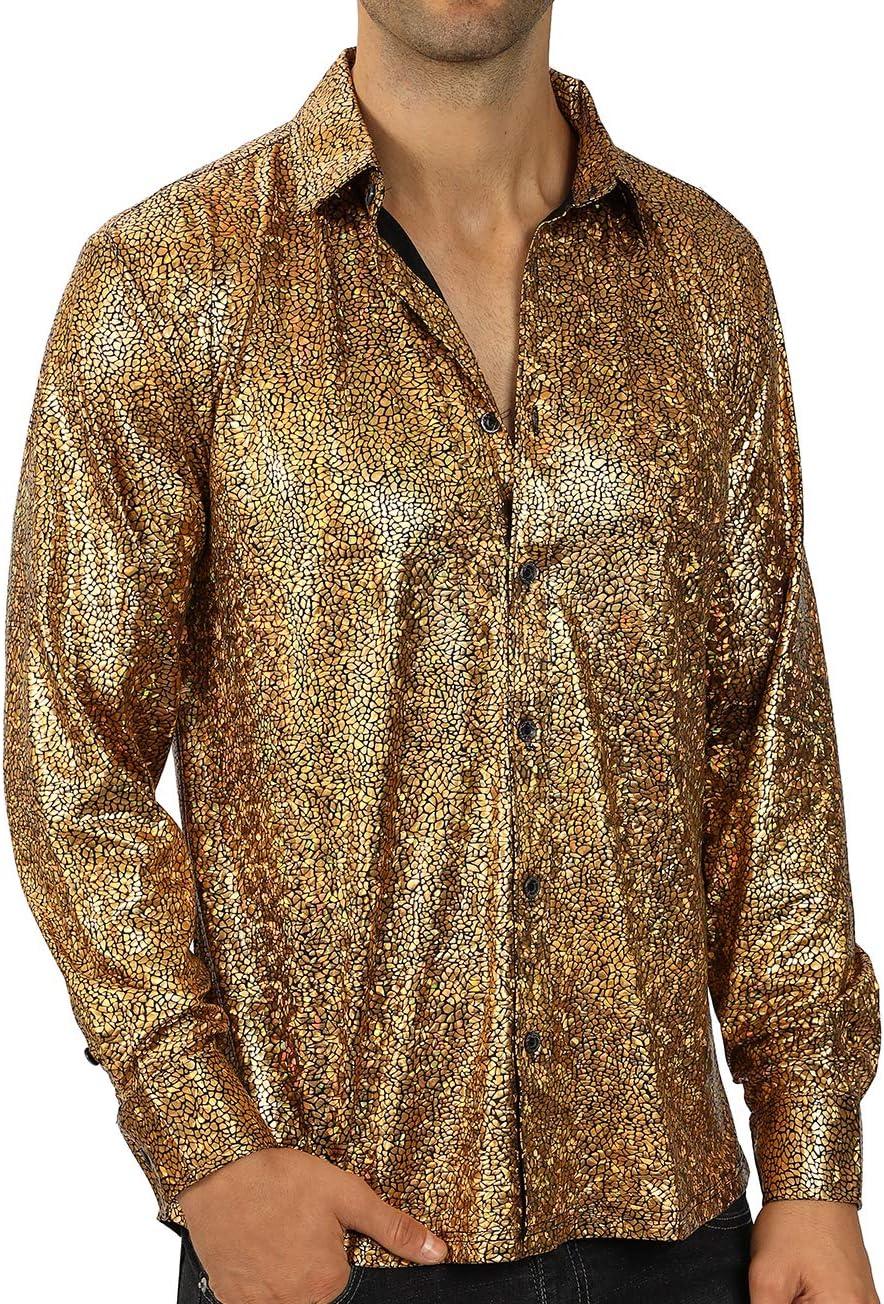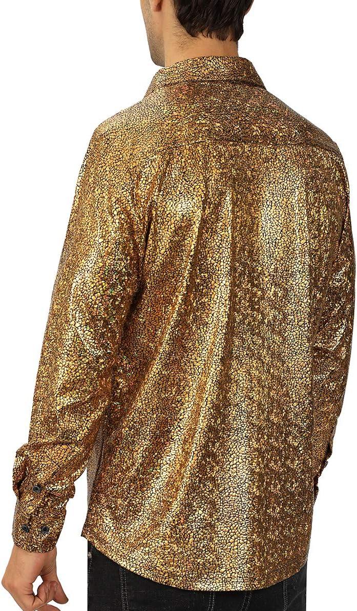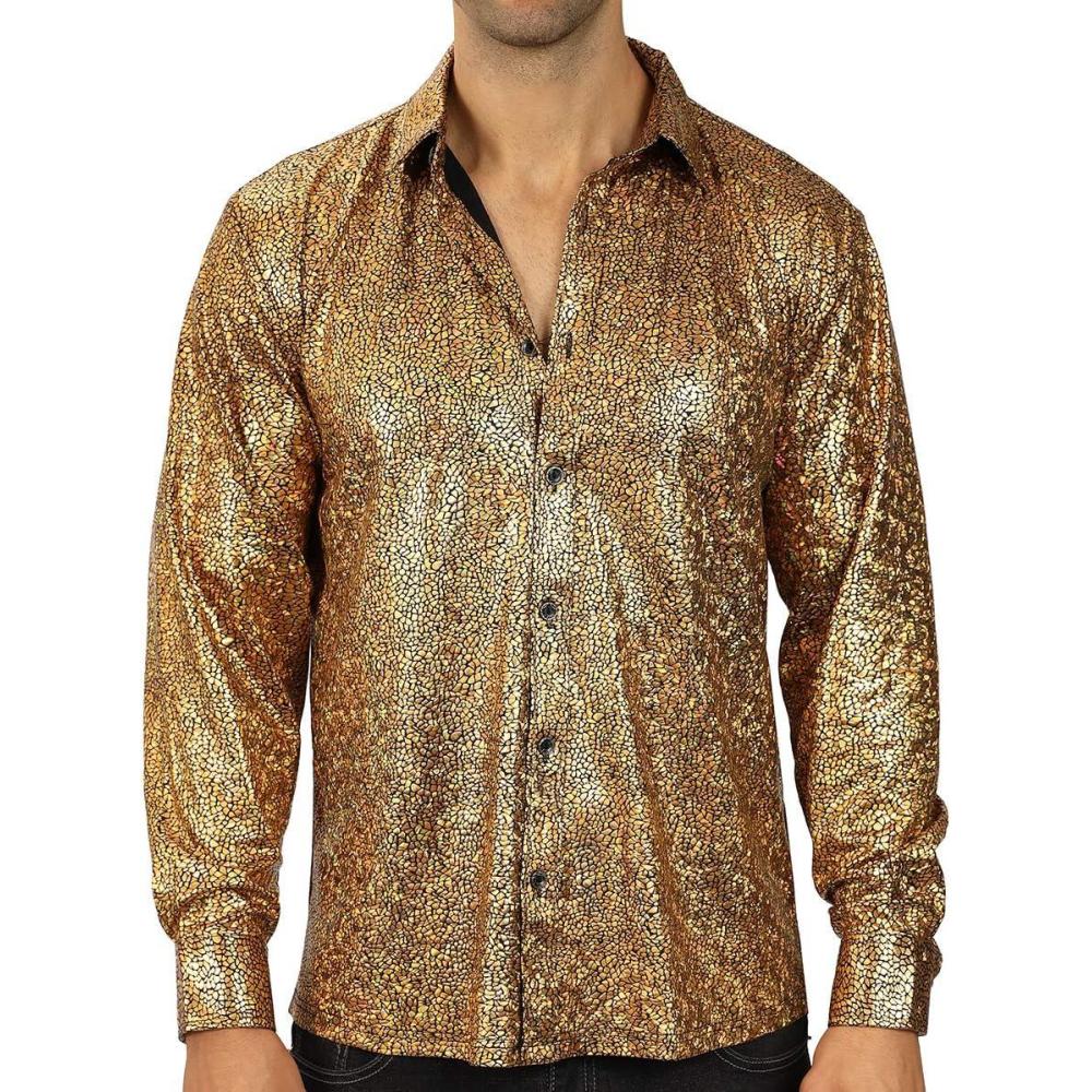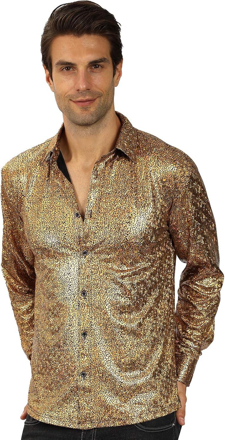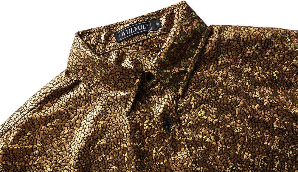 WULFUL Men Dress Shirt Sequins Long Sleeve Button Down Shirt Luxury Disco Party Nightclub Christmas Prom Costume(Gold033)