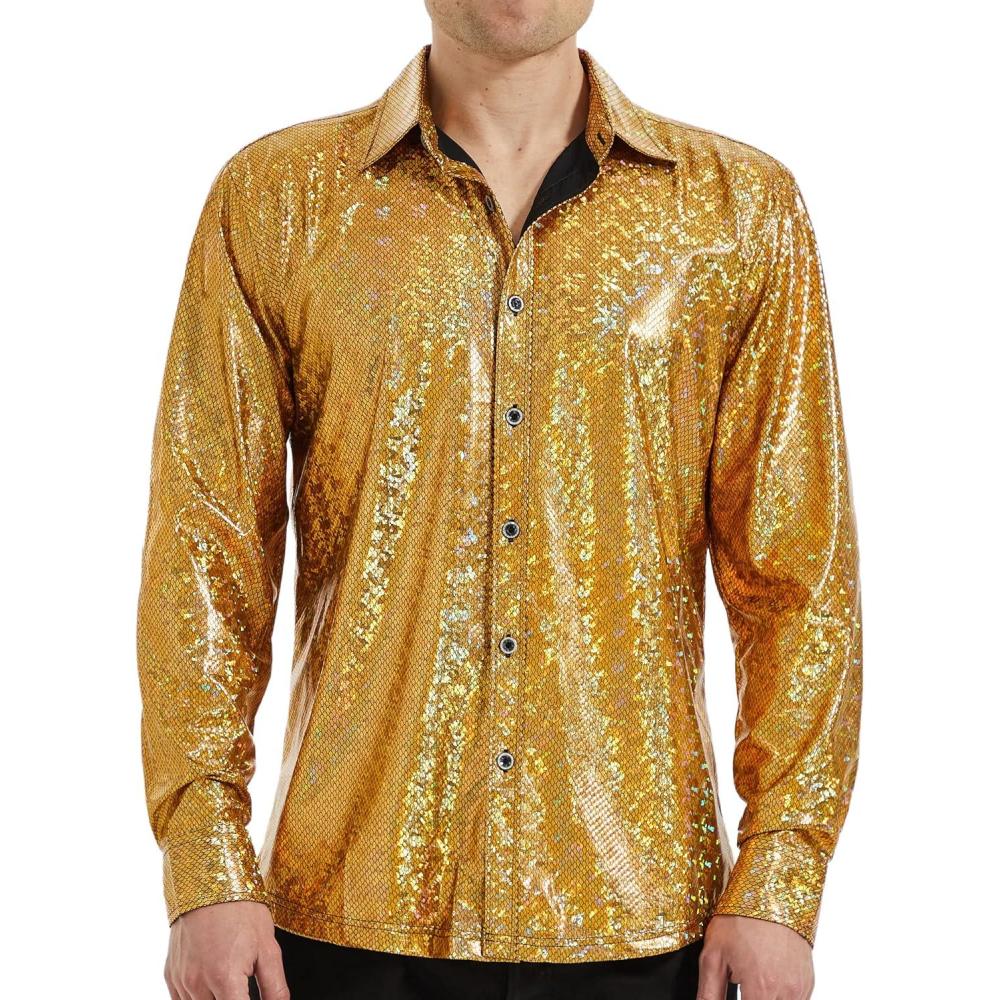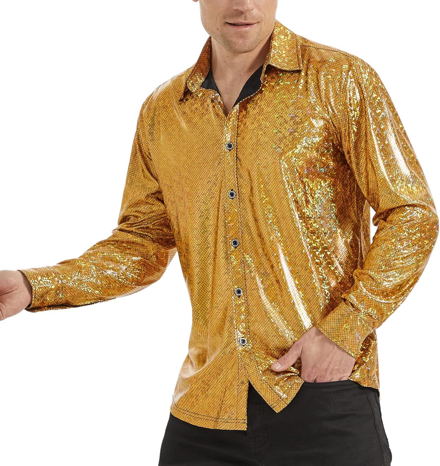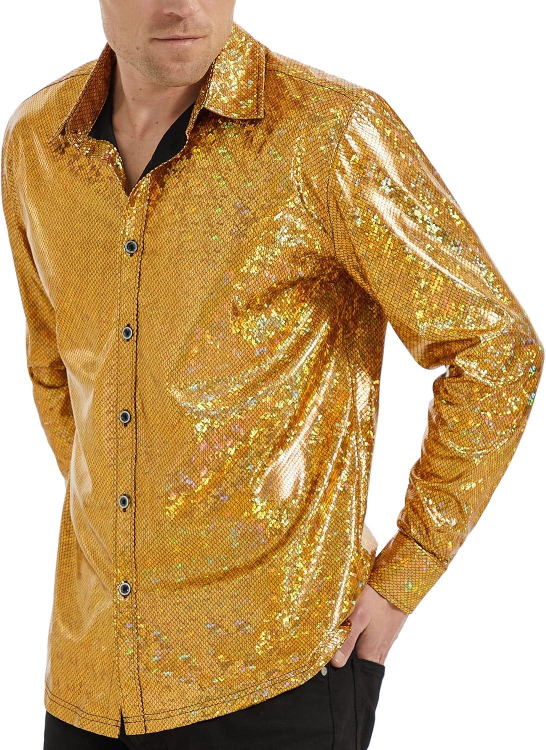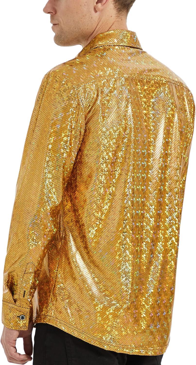WULFUL Men Dress Shirt Sequins Long Sleeve Button Down Shirt Luxury Disco Party Nightclub Christmas Prom Costume(Gold0155)