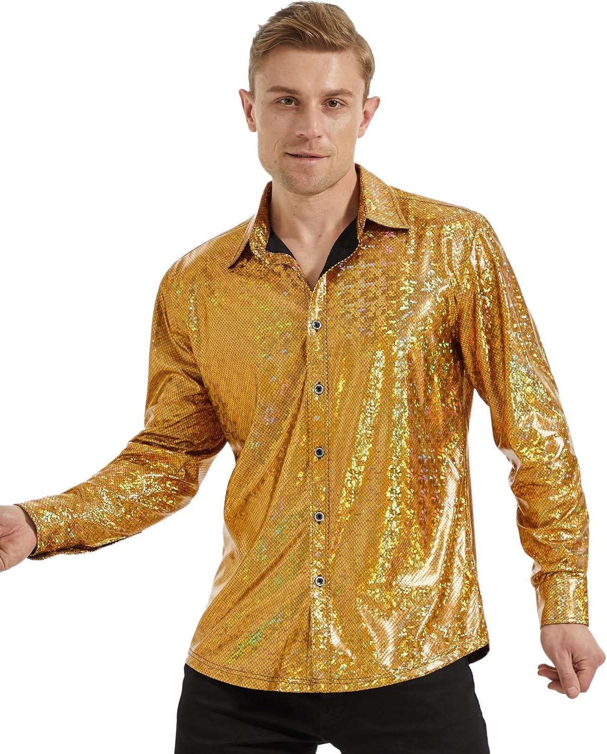Men Dress Shirt Sequins Long Sleeve Button Down Shirt Luxury Disco Party Nightclub Christmas Prom Costume