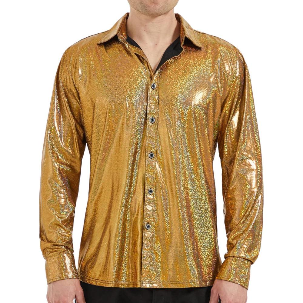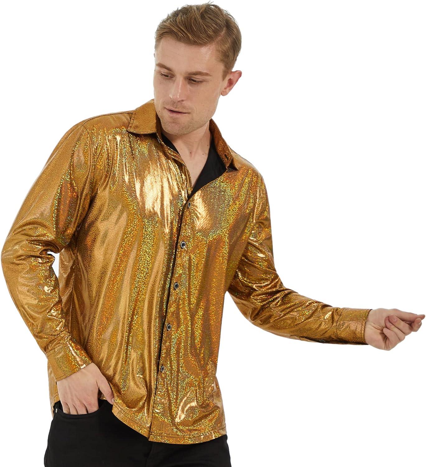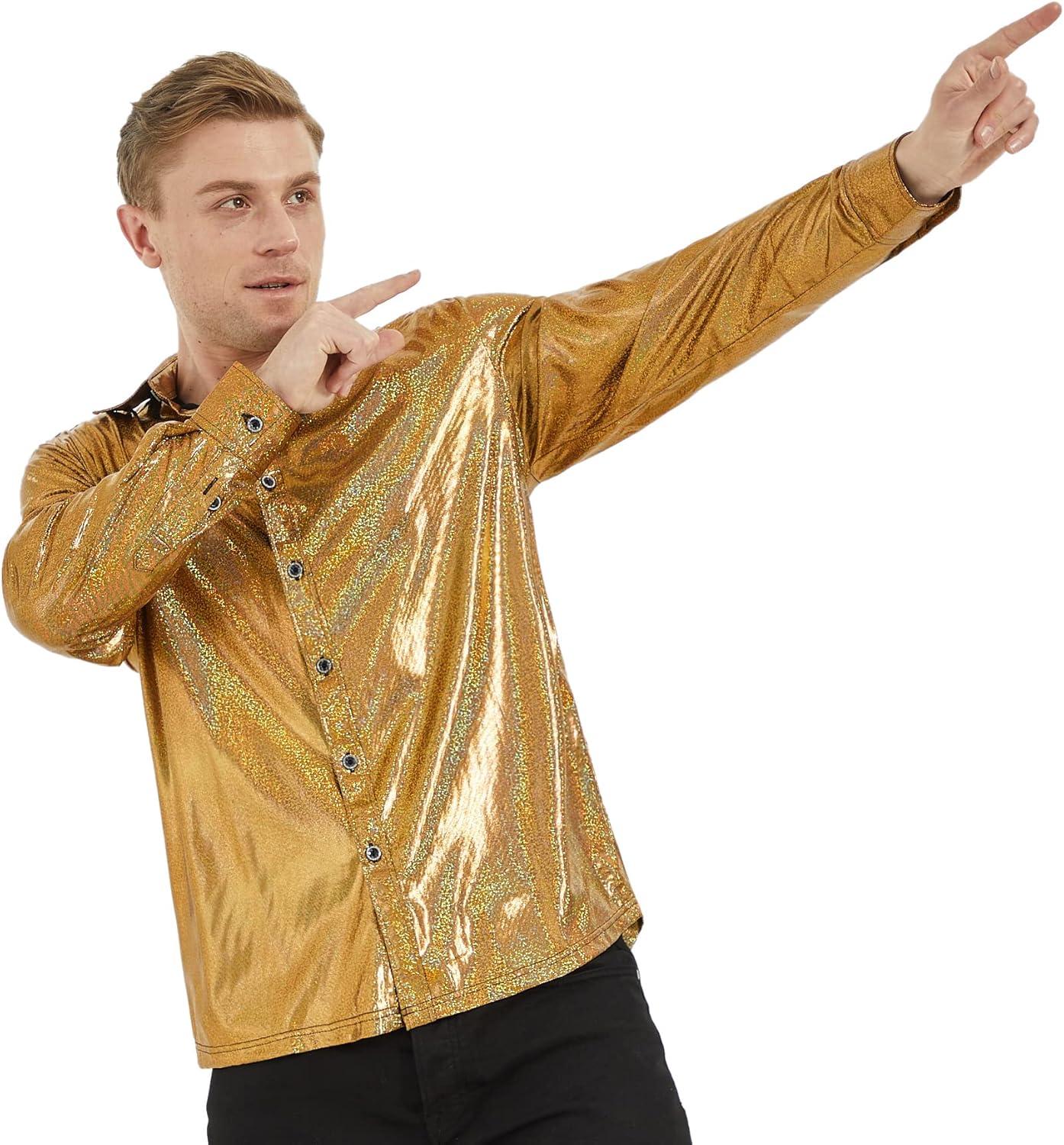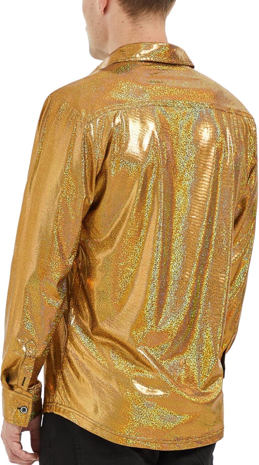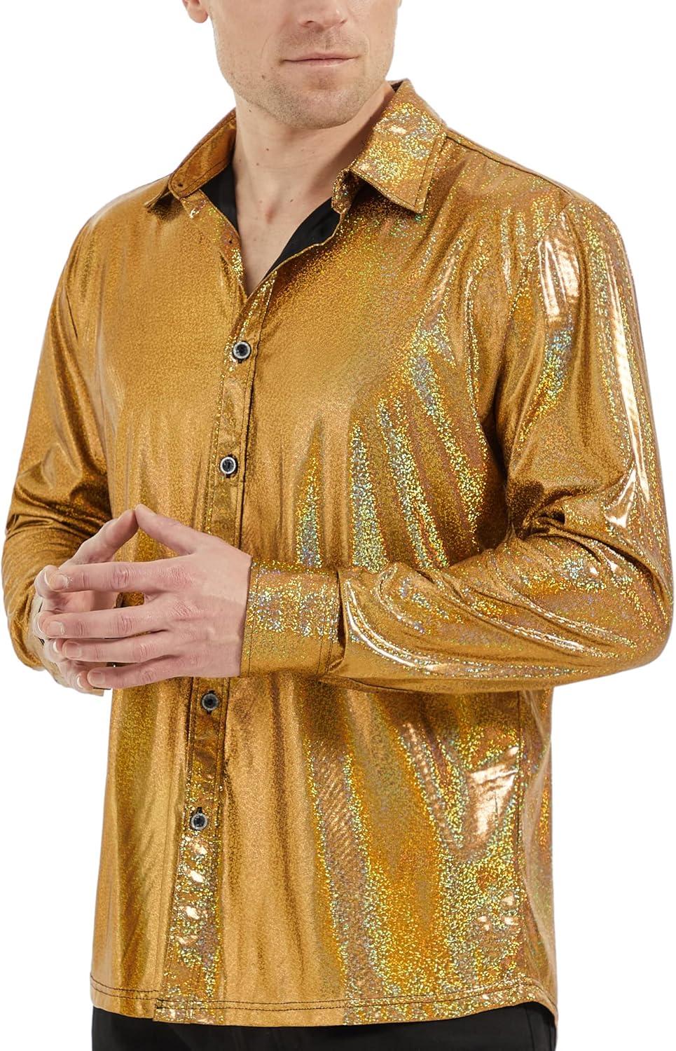 WULFUL Men Dress Shirt Sequins Long Sleeve Button Down Shirt Luxury Disco Party Nightclub Christmas Prom Costume(Gold033)