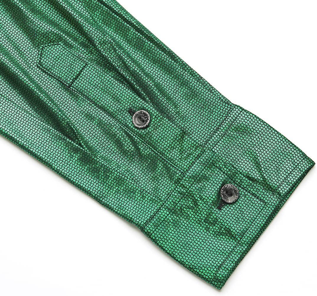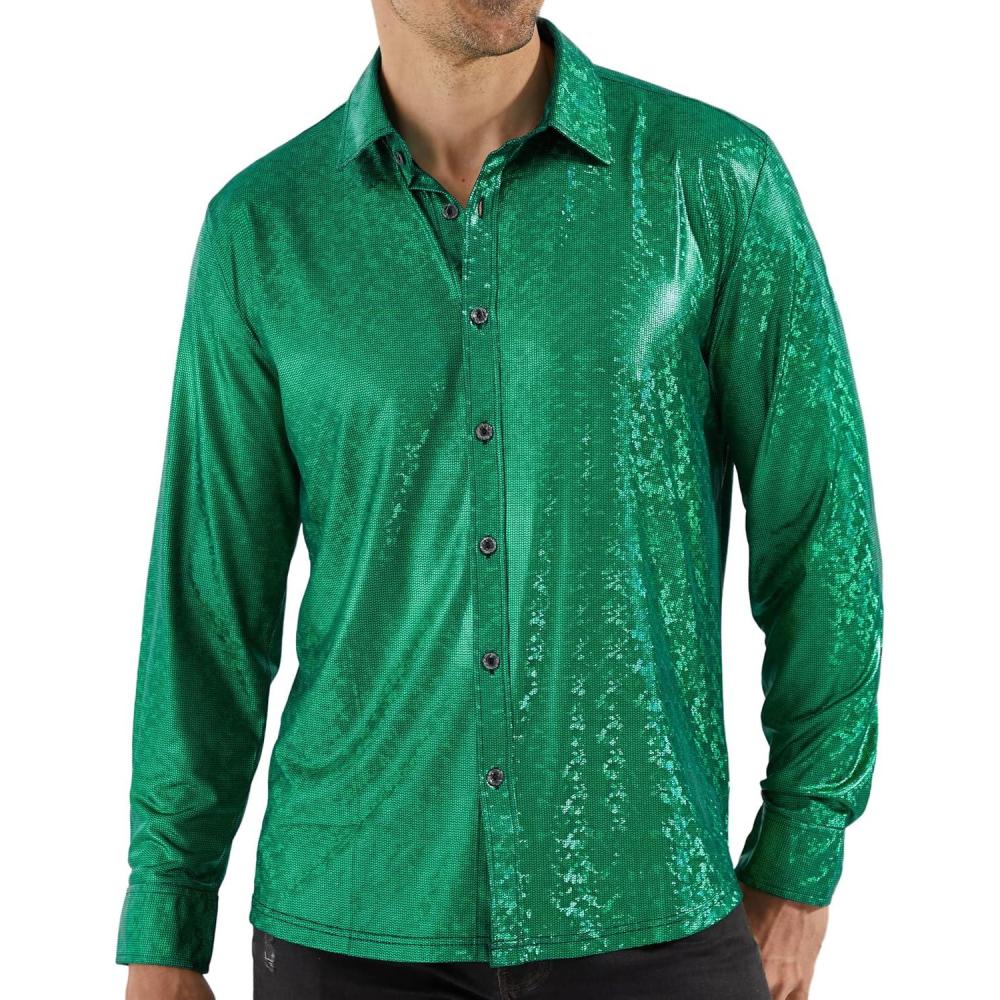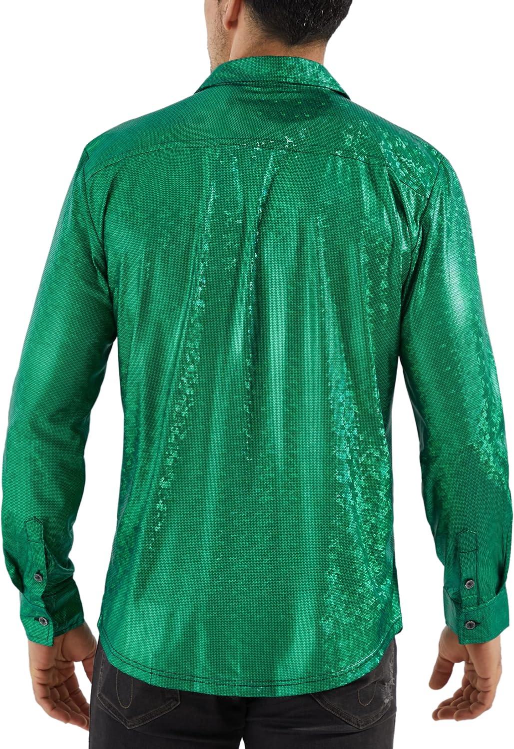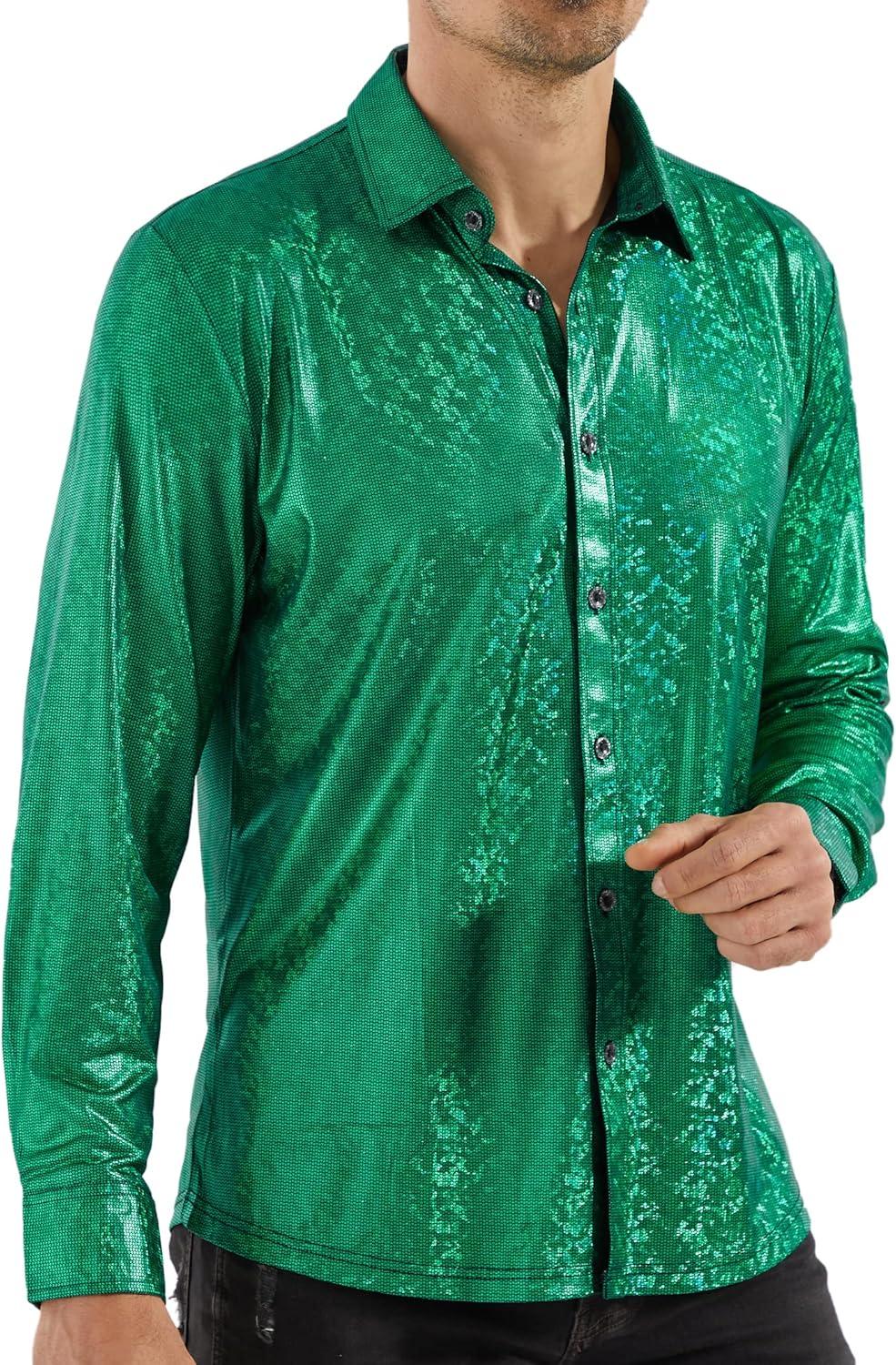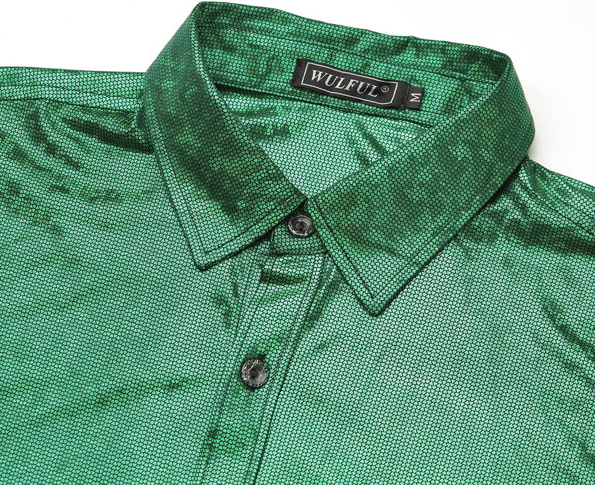 WULFUL Men Dress Shirt Sequins Long Sleeve Button Down Shirt Luxury Disco Party Nightclub Christmas Prom Costume(Green0154)