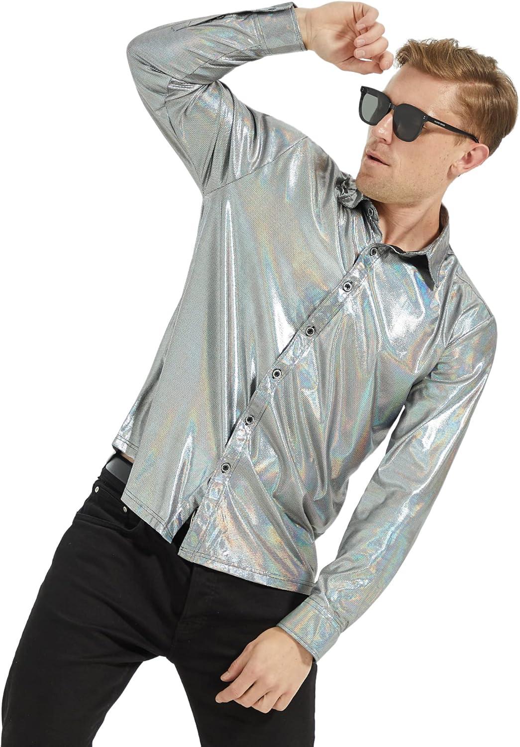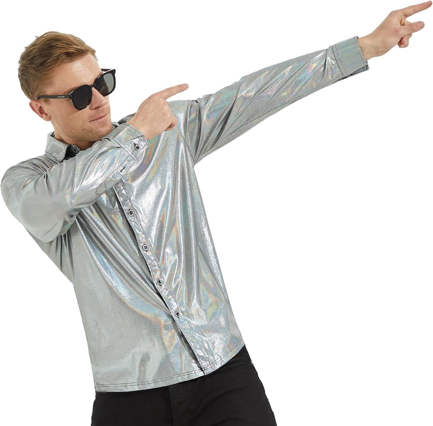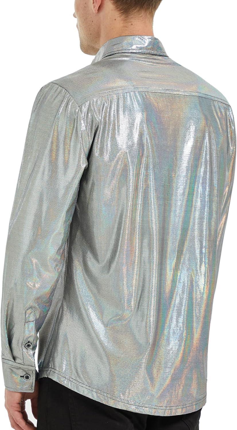 WULFUL Men Dress Shirt Sequins Long Sleeve Button Down Shirt Luxury Disco Party Nightclub Christmas Prom Costume(Silver033)