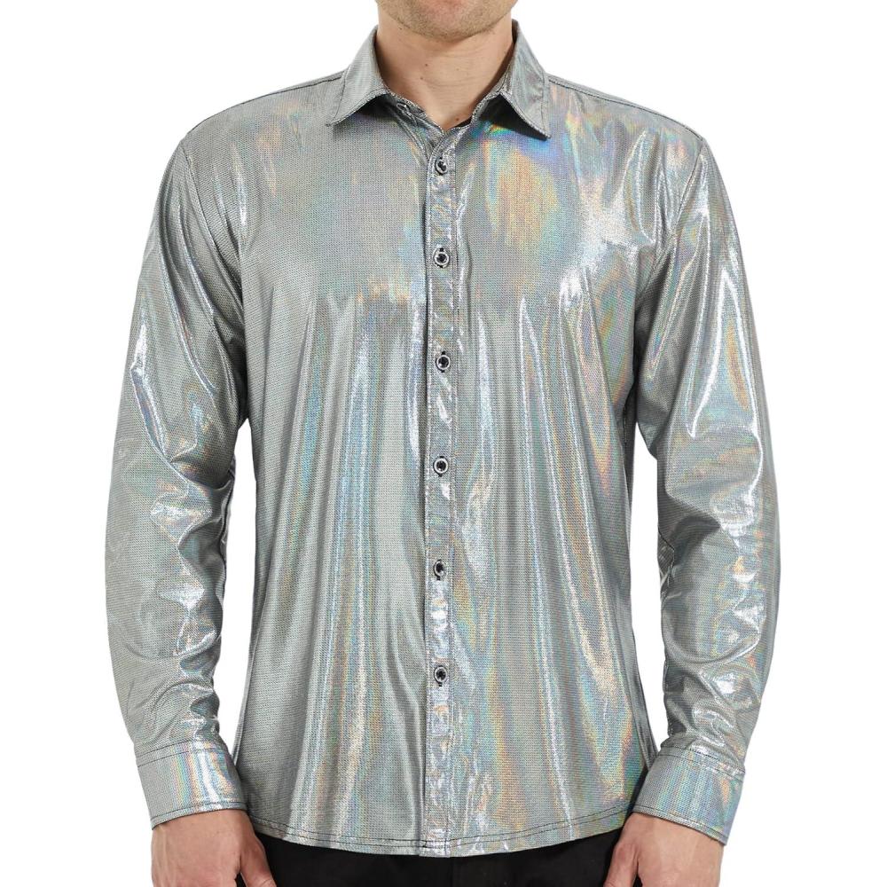 Men Dress Shirt Sequins Long Sleeve Button Down Shirt Luxury Disco Party Nightclub Christmas Prom Costume
