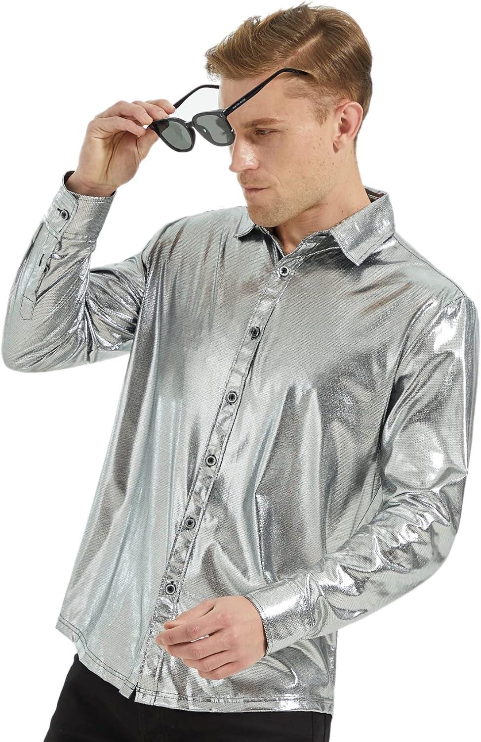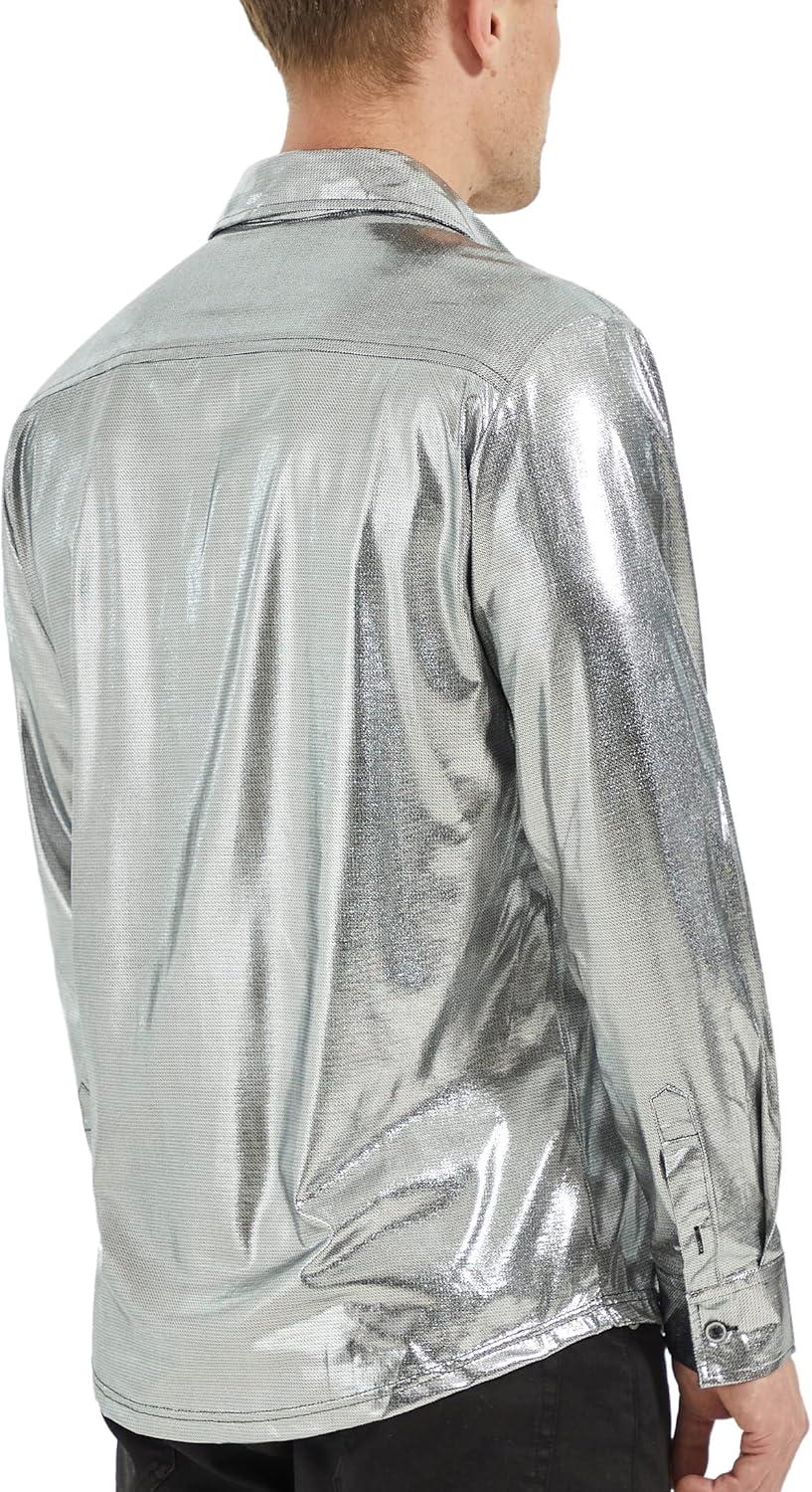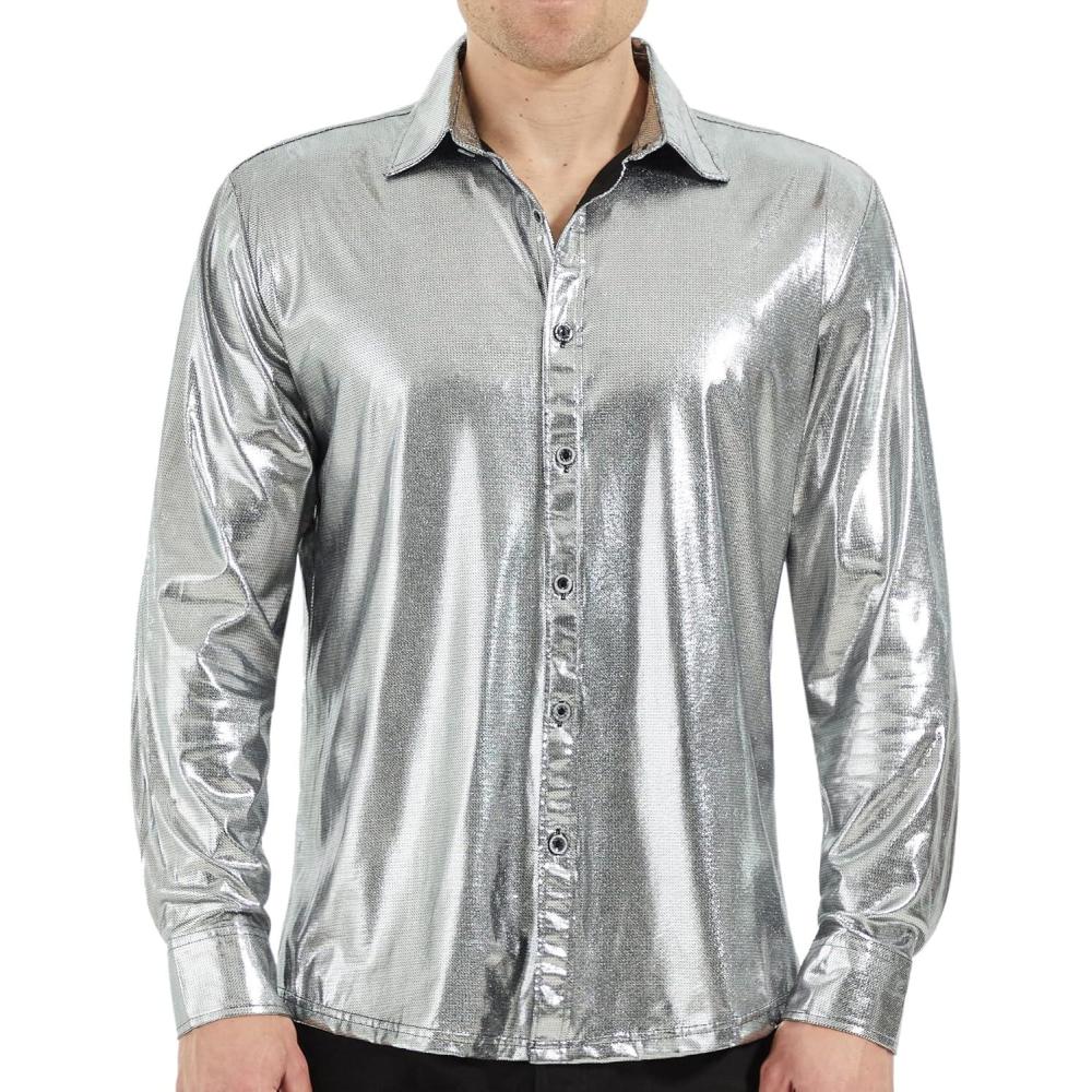 WULFUL Men Dress Shirt Sequins Long Sleeve Button Down Shirt Luxury Disco Party Nightclub Christmas Prom Costume(Silver035)