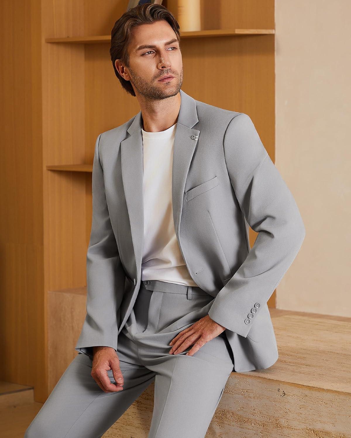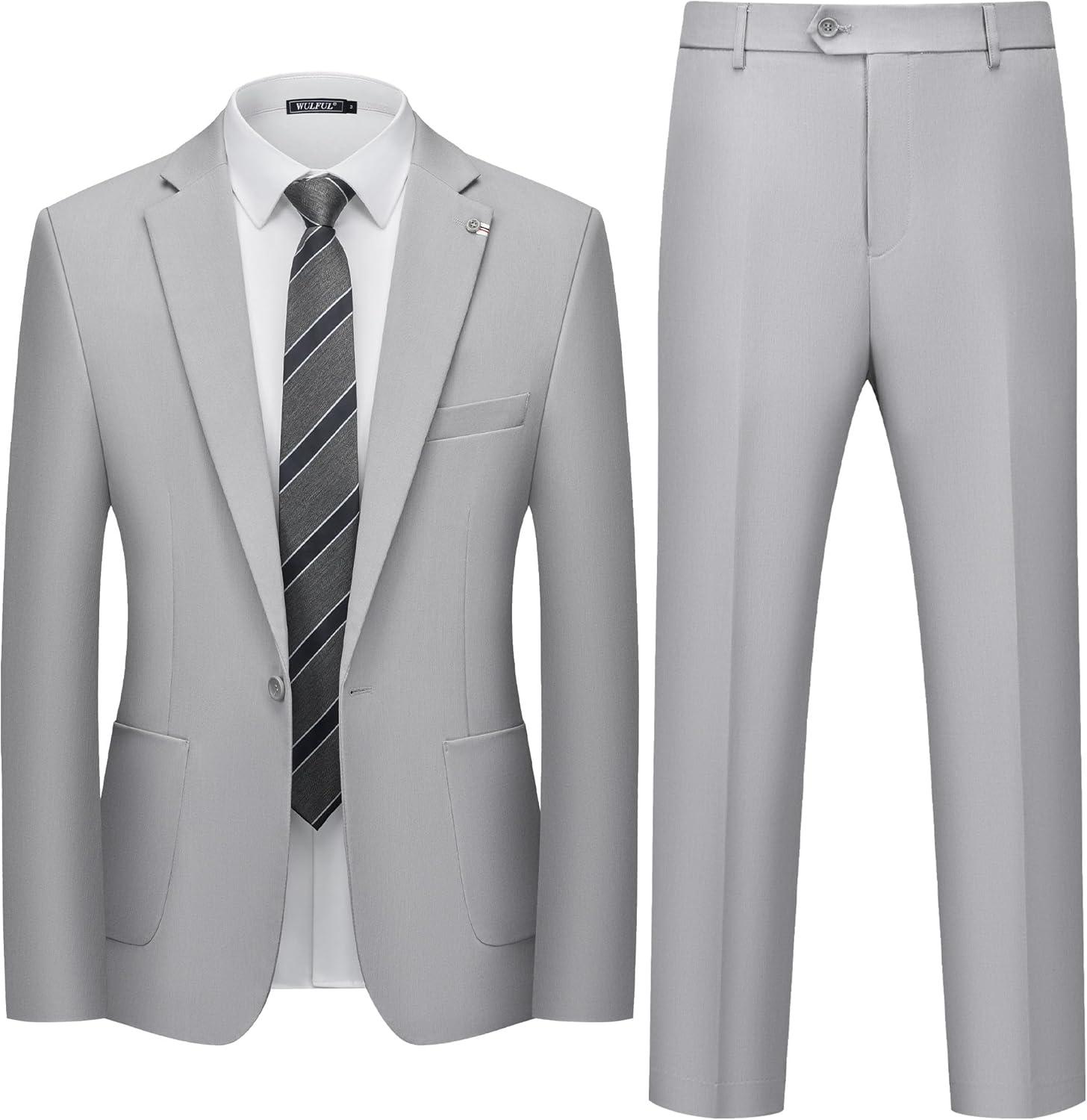 WULFUL Men's 2 Piece Slim Fit Suit Set One Button Blazer Jacket Pants Set(Light Gray)