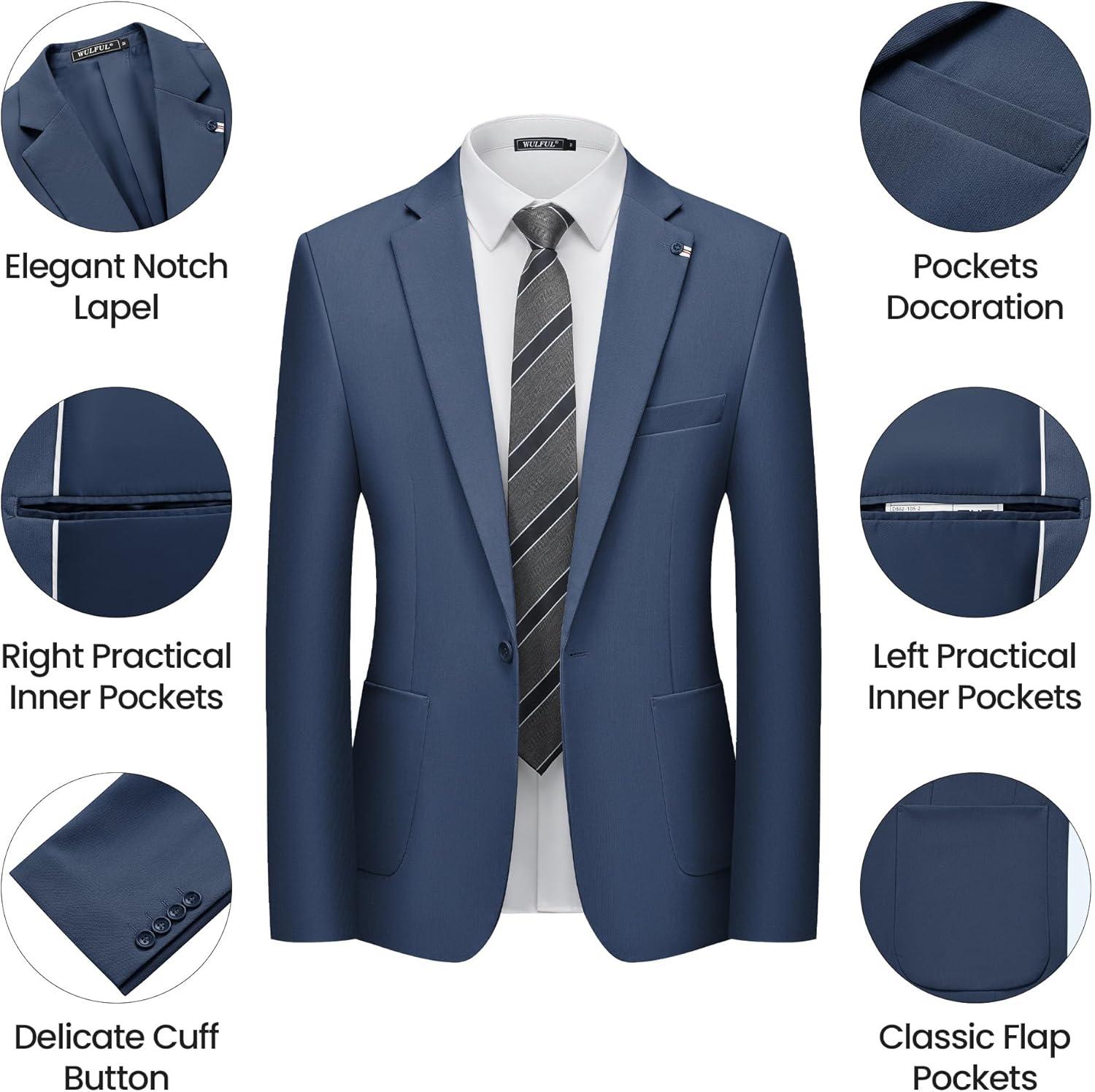 WULFUL Men's 2 Piece Slim Fit Suit Set One Button Blazer Jacket Pants Set(Navy)