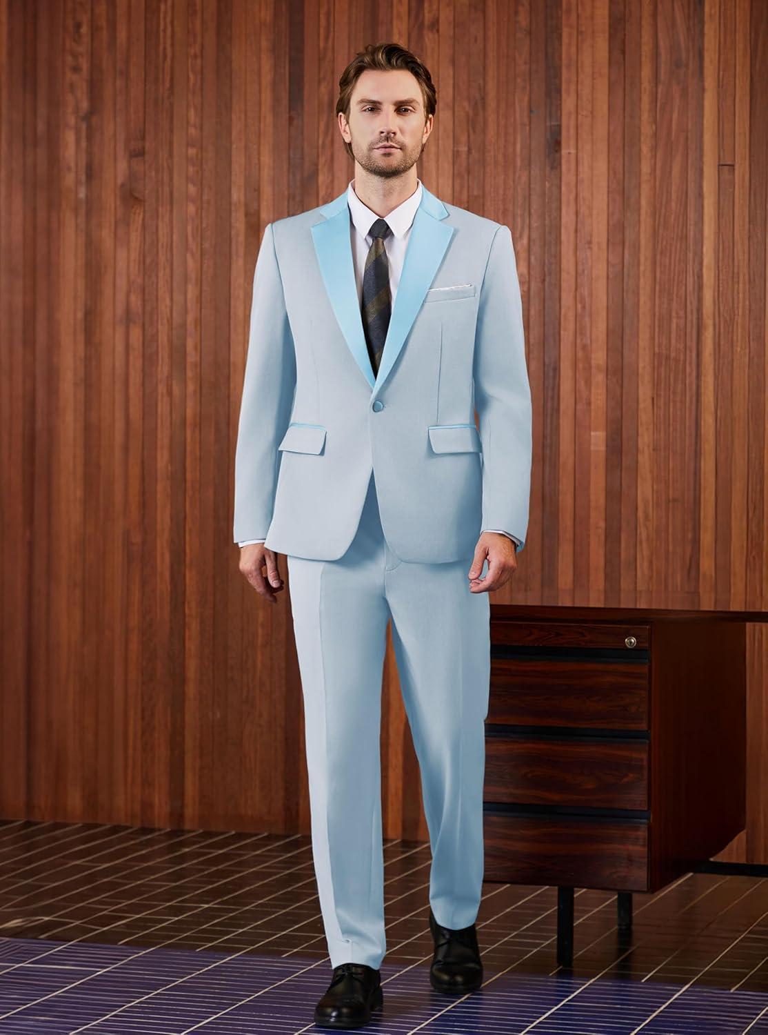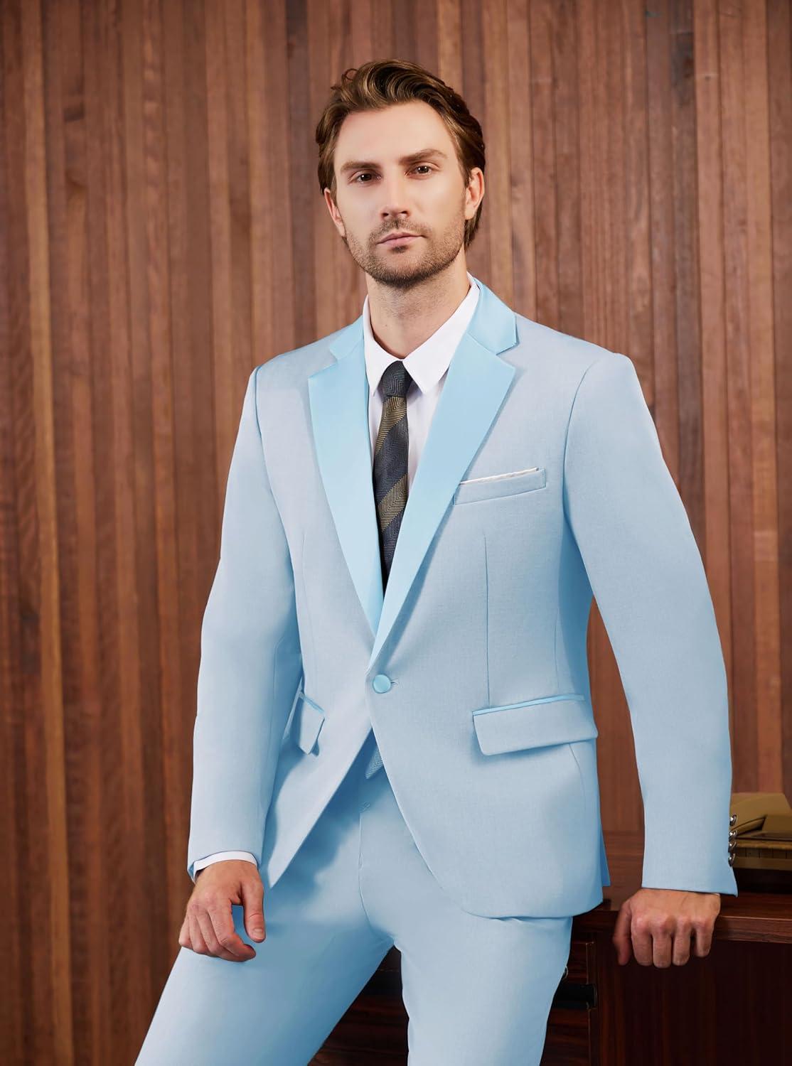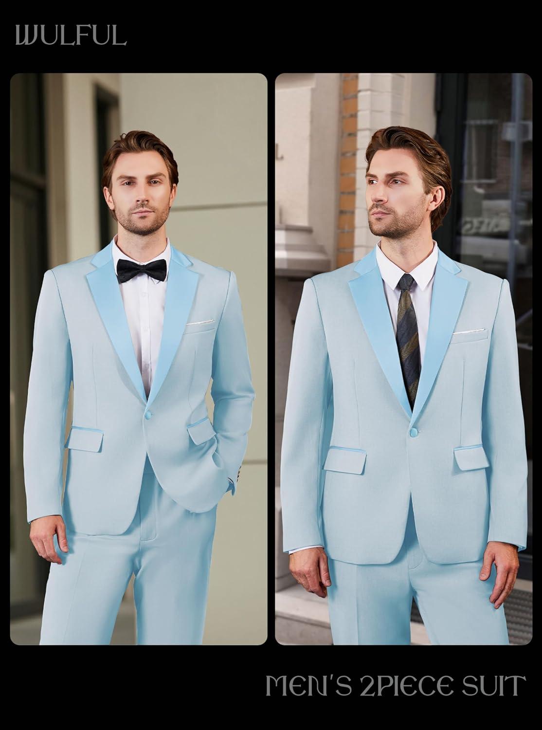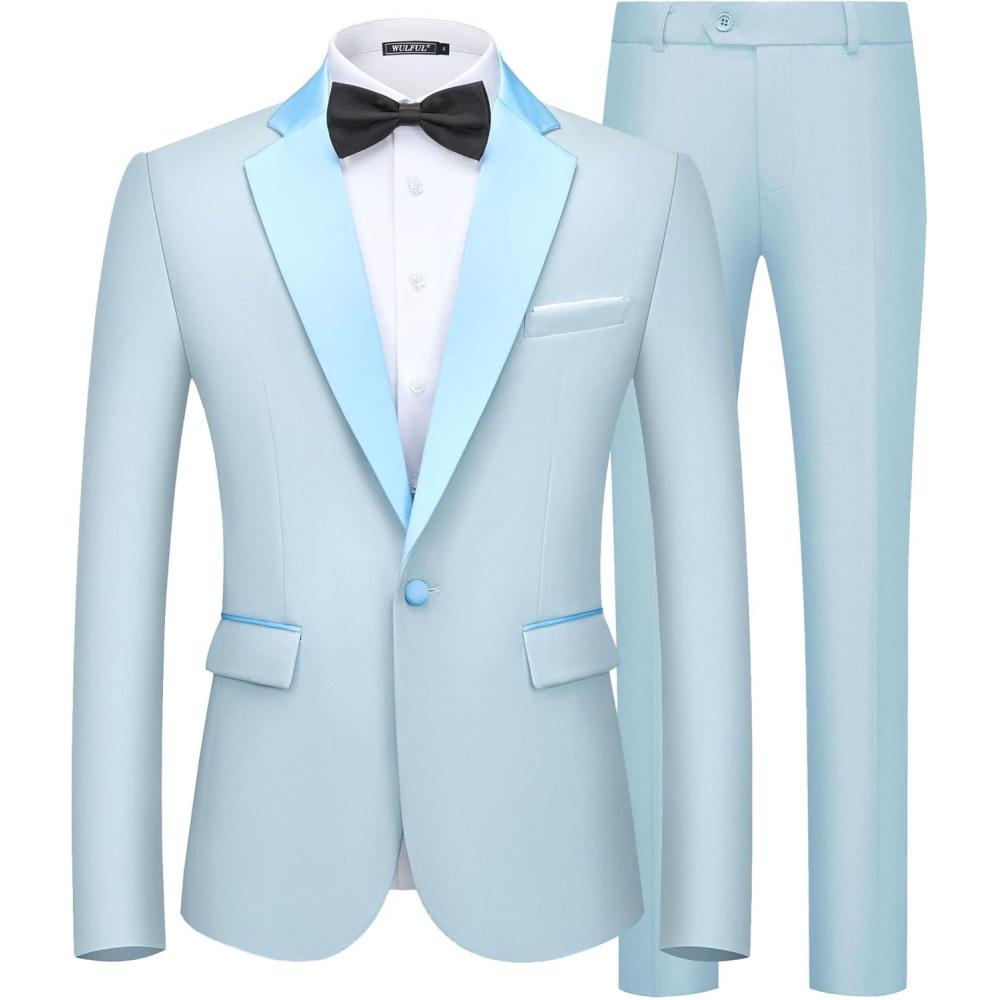 WULFUL Men's 2 Piece Slim Fit Suit Set One Button Blazer Jacket Pants Tuxedo Set for Prom, Wedding and Business(Light Blue- Light Blue Lapel)