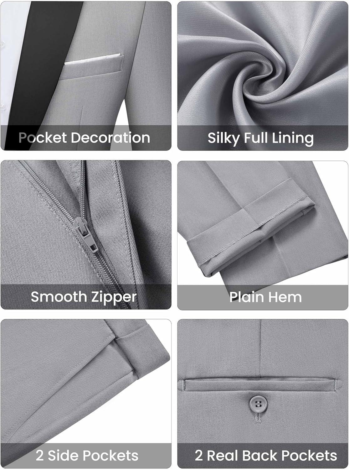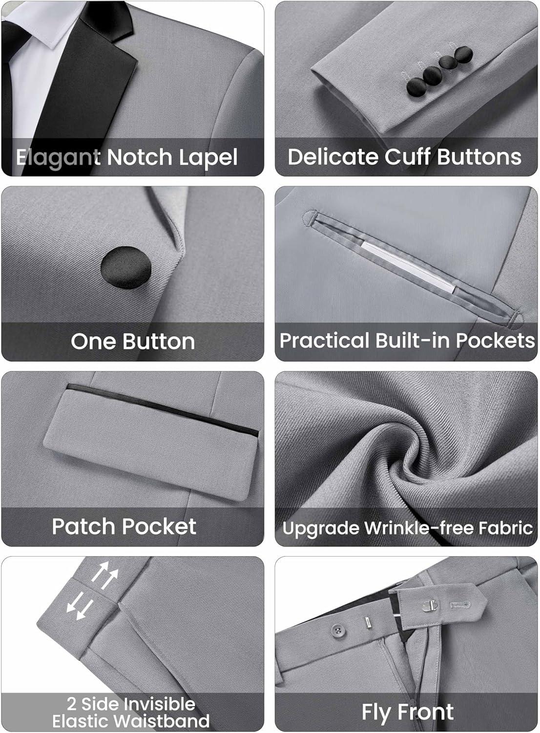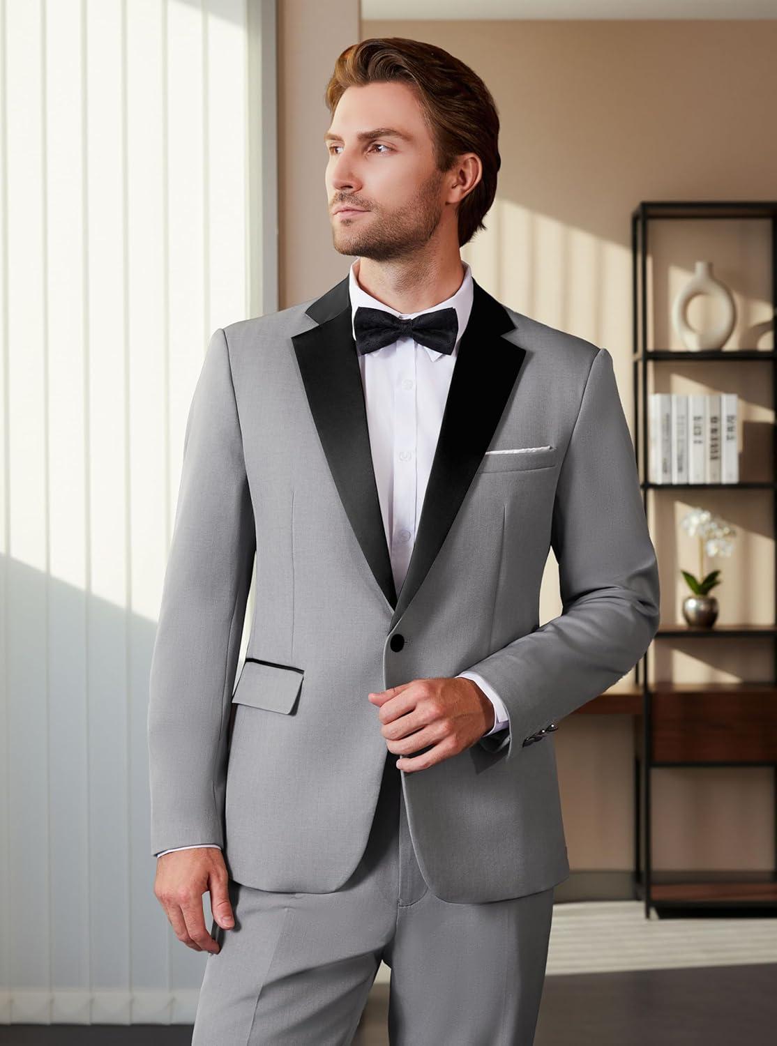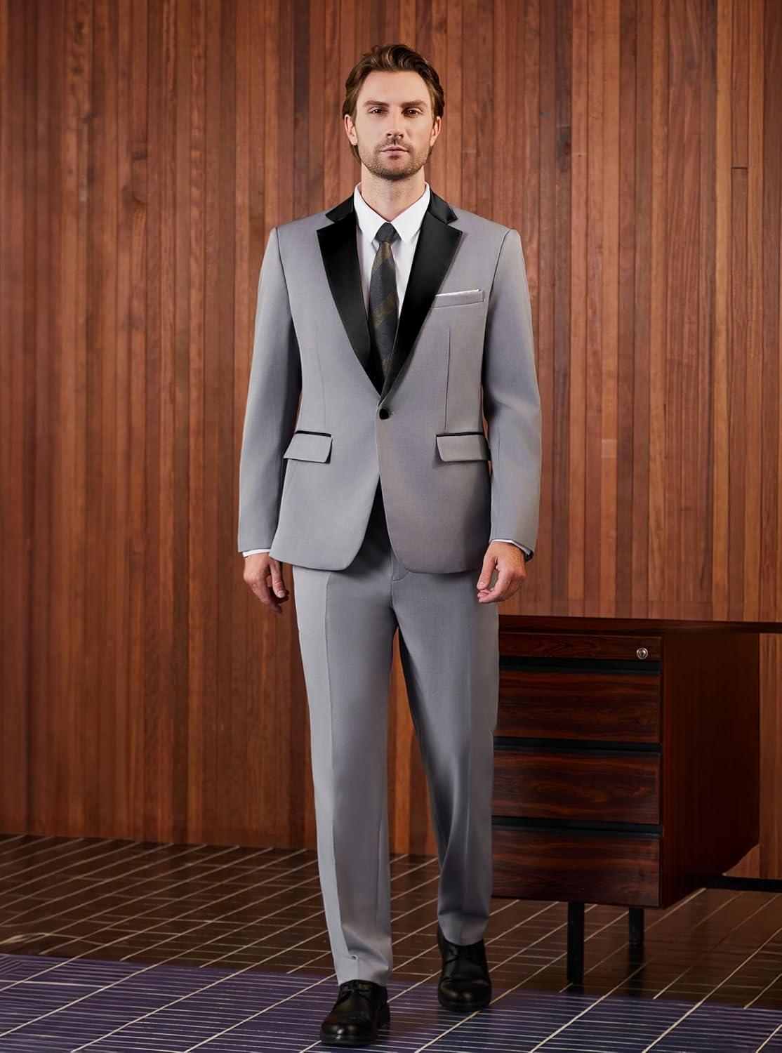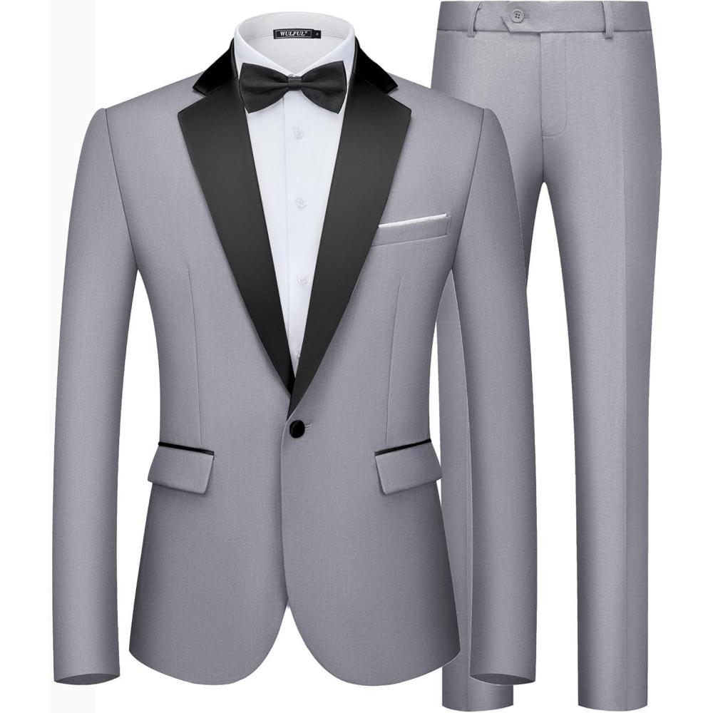 WULFUL Men's 2 Piece Slim Fit Suit Set One Button Blazer Jacket Pants Tuxedo Set for Prom, Wedding and Business(Light Grey- Black Lapel)