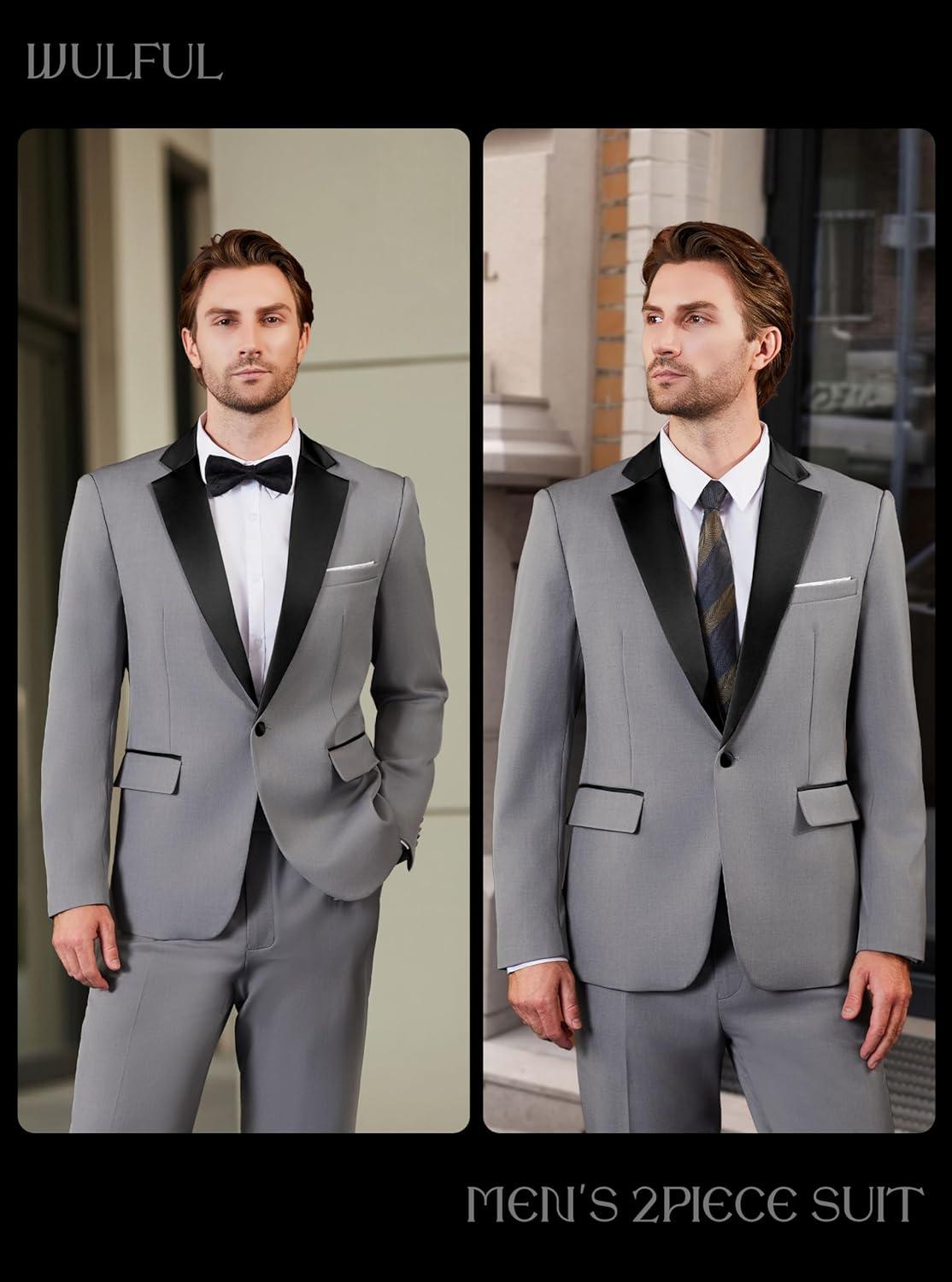 imageWULFUL Mens 2 Piece Slim Fit Suit Set One Button Blazer Jacket Pants Tuxedo Set for Prom Wedding and BusinessLight Grey Black Lapel