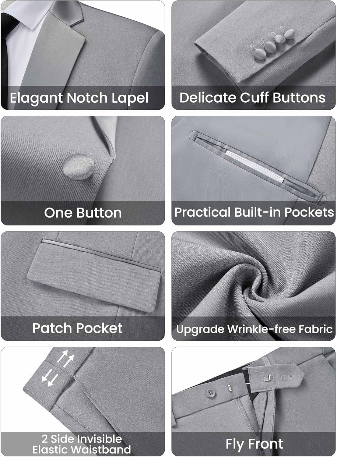 WULFUL Men's 2 Piece Slim Fit Suit Set One Button Blazer Jacket Pants Tuxedo Set for Prom, Wedding and Business(Light Grey- Light Grey Lapel)