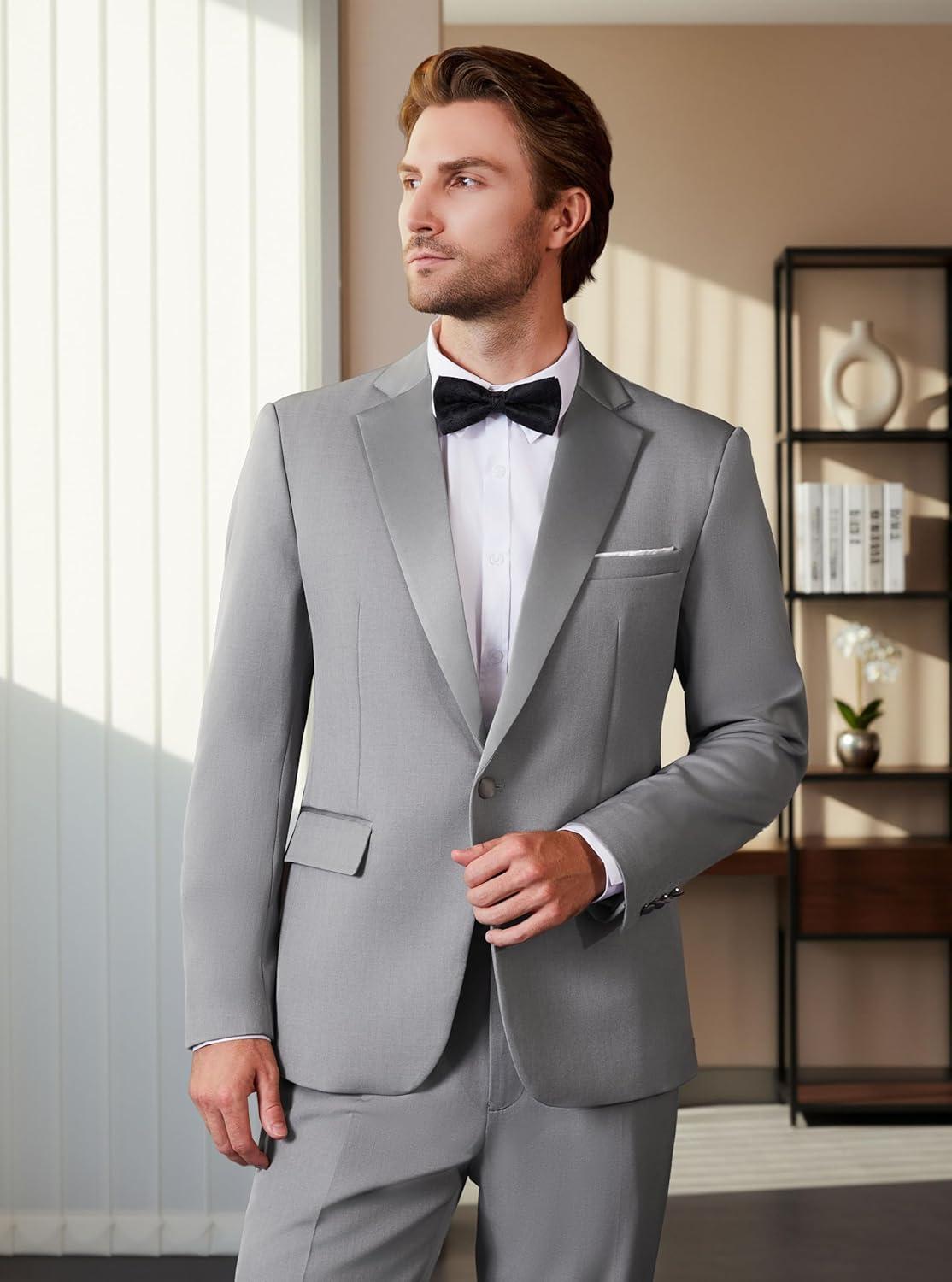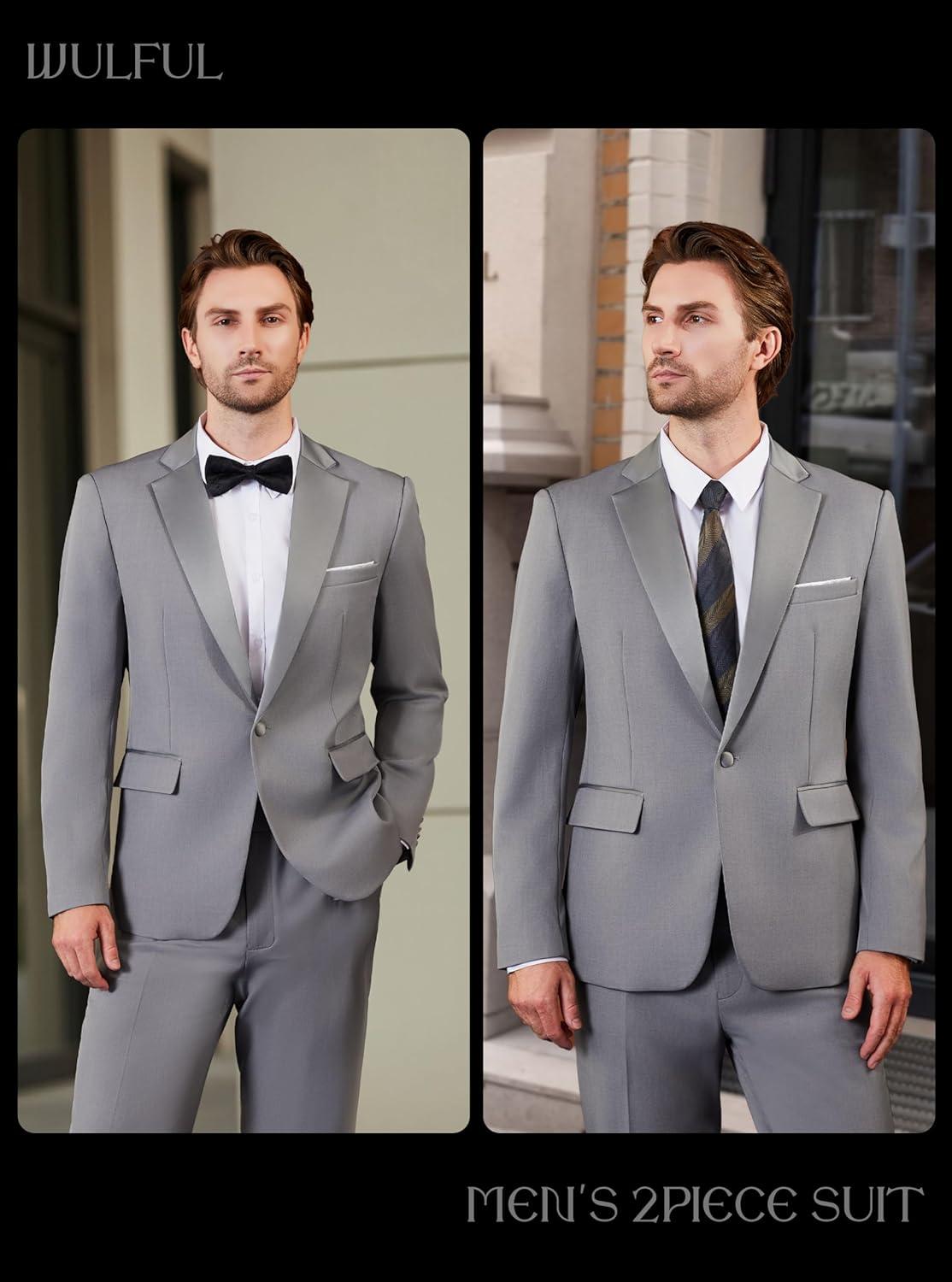 WULFUL Men’s 2 Piece Slim Fit Suit Set One Button Blazer Jacket Pants Tuxedo Set for Prom, Wedding and Business(Light Grey- Black Lapel)