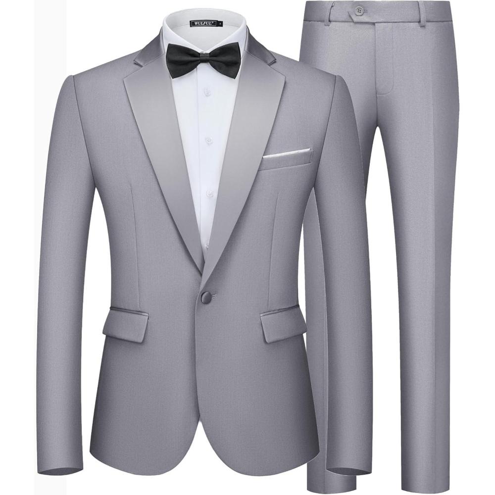imageWULFUL Mens 2 Piece Slim Fit Suit Set One Button Blazer Jacket Pants Tuxedo Set for Prom Wedding and BusinessLight Grey Black Lapel