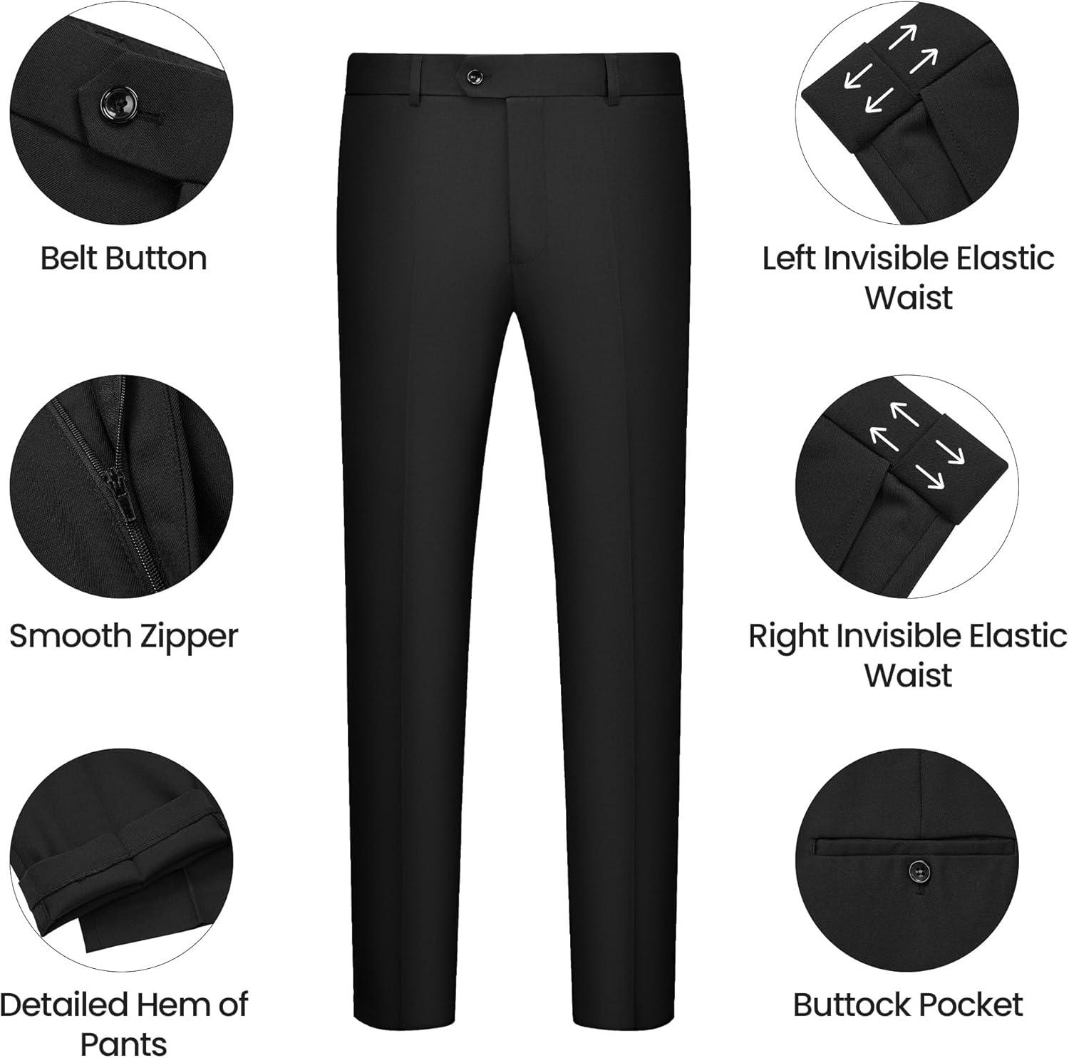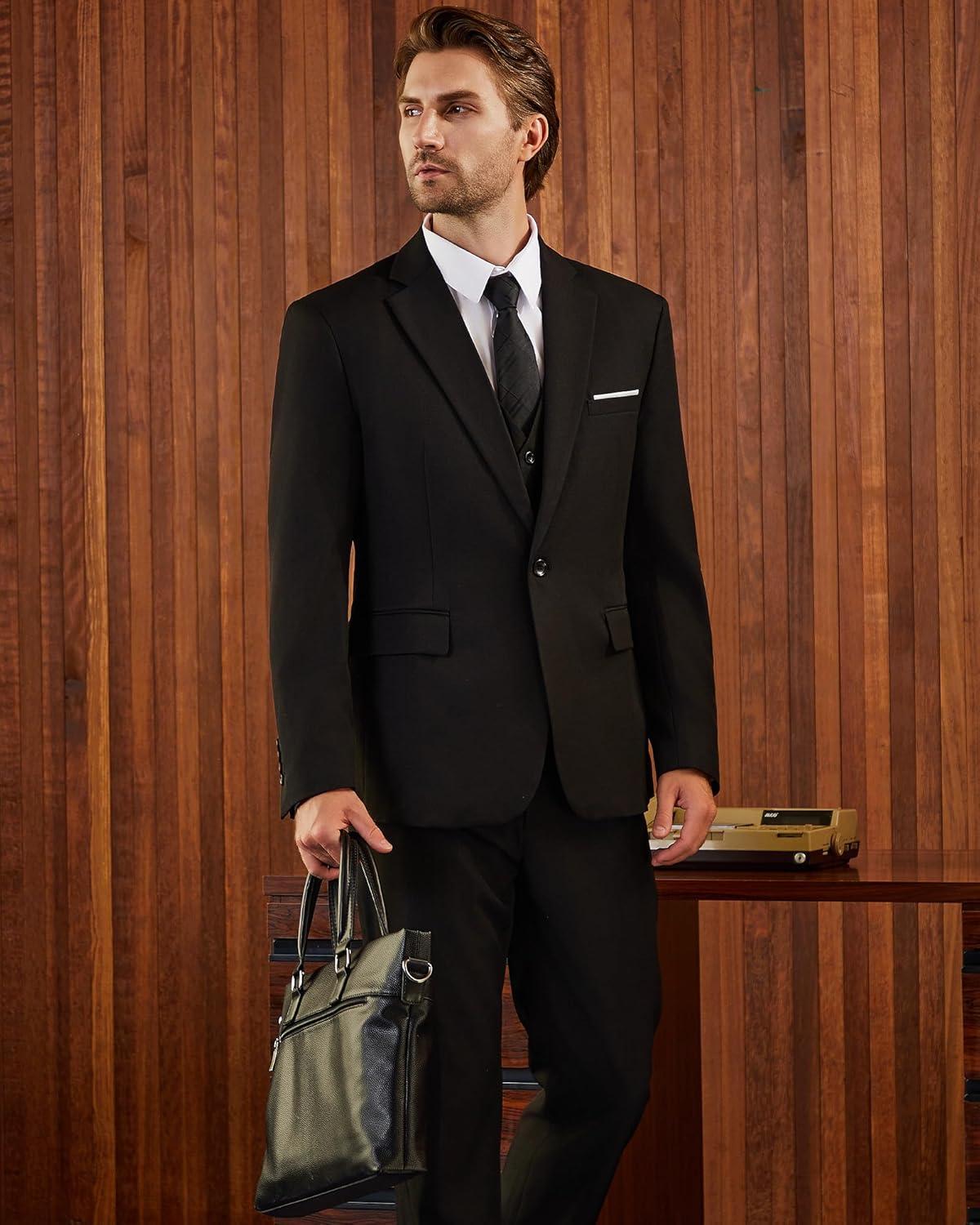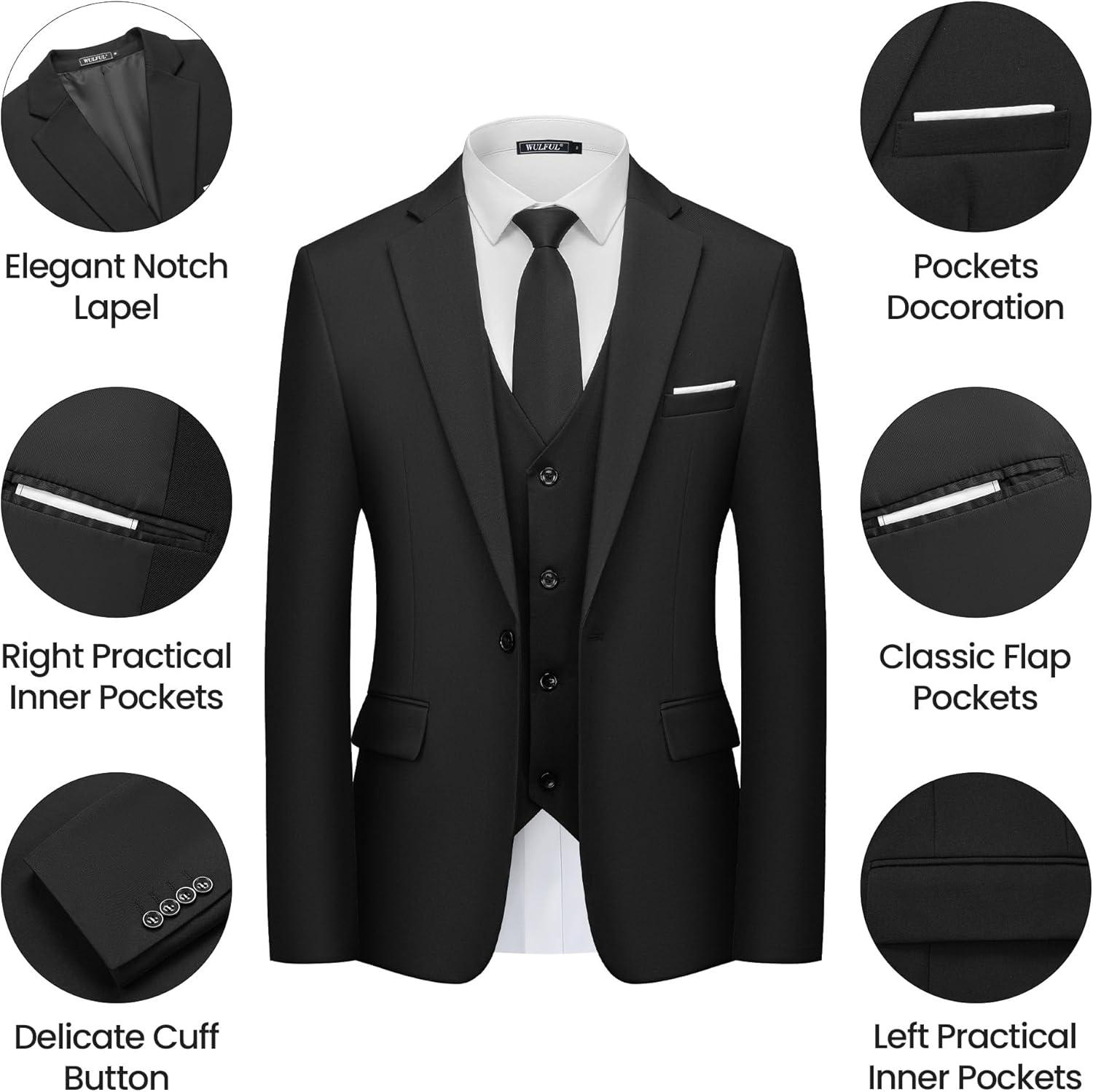 WULFUL Men's 3 Piece Slim Fit Suit Set One Button Blazer Jacket Pants Tuxedo Set(Black)