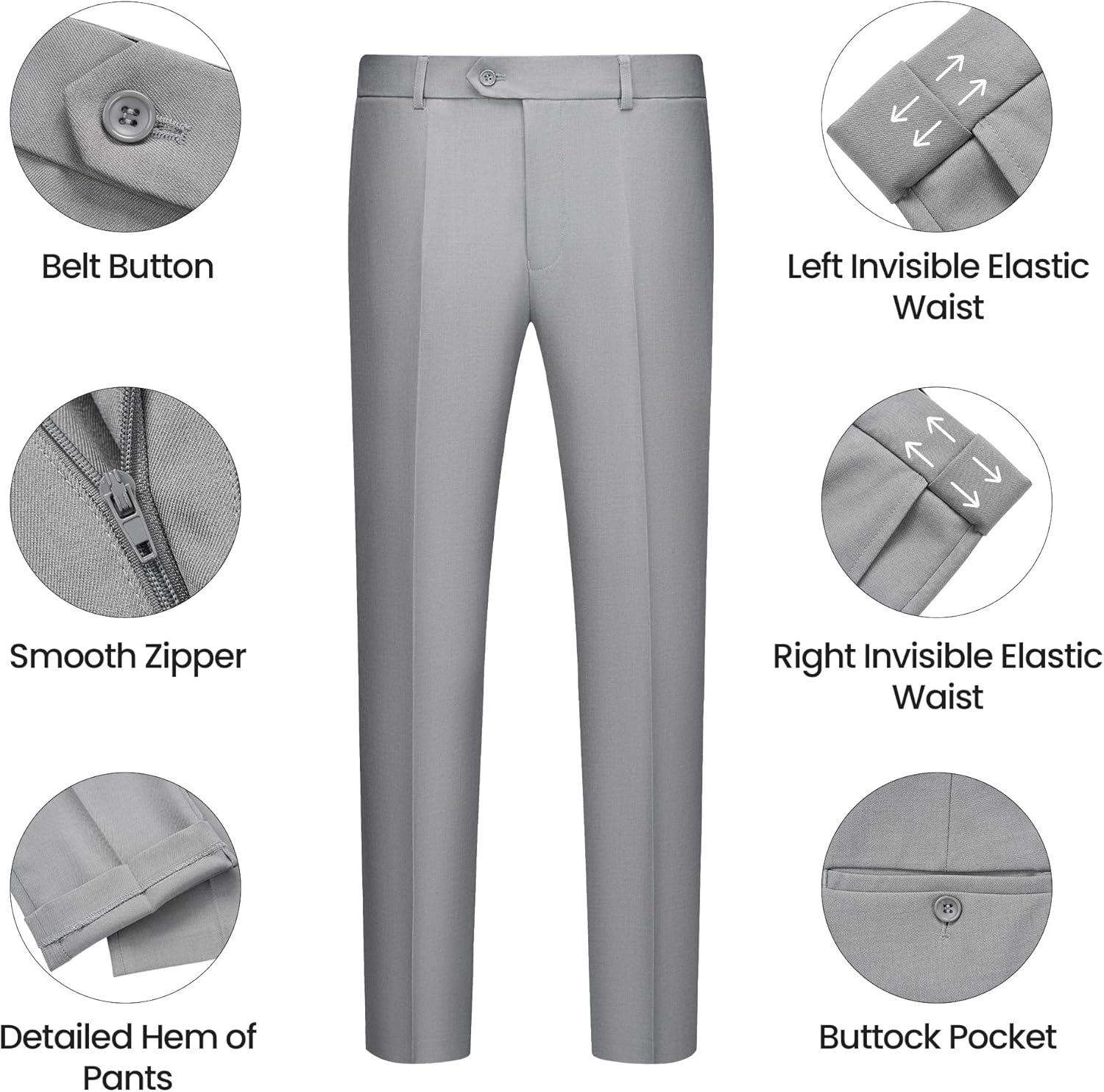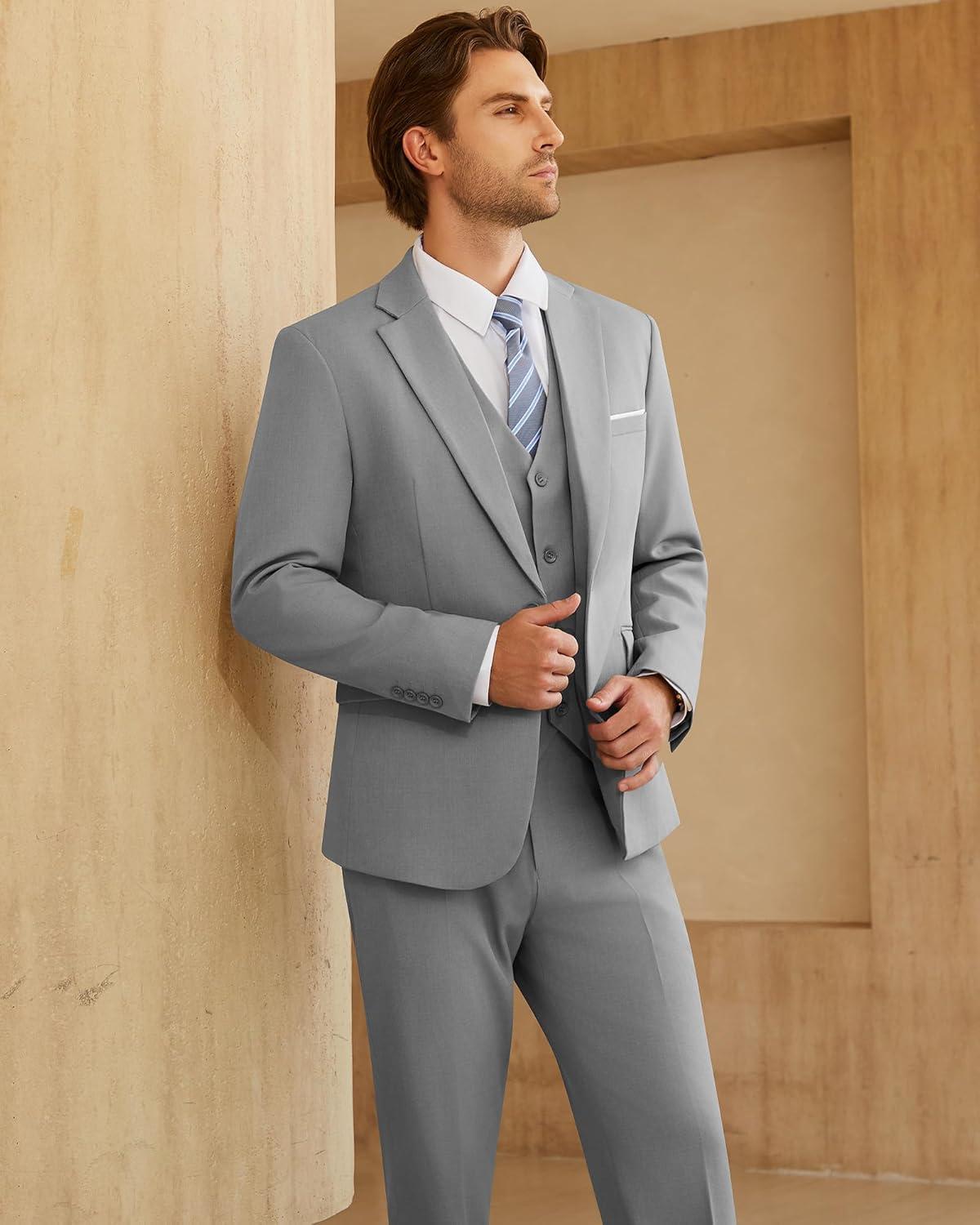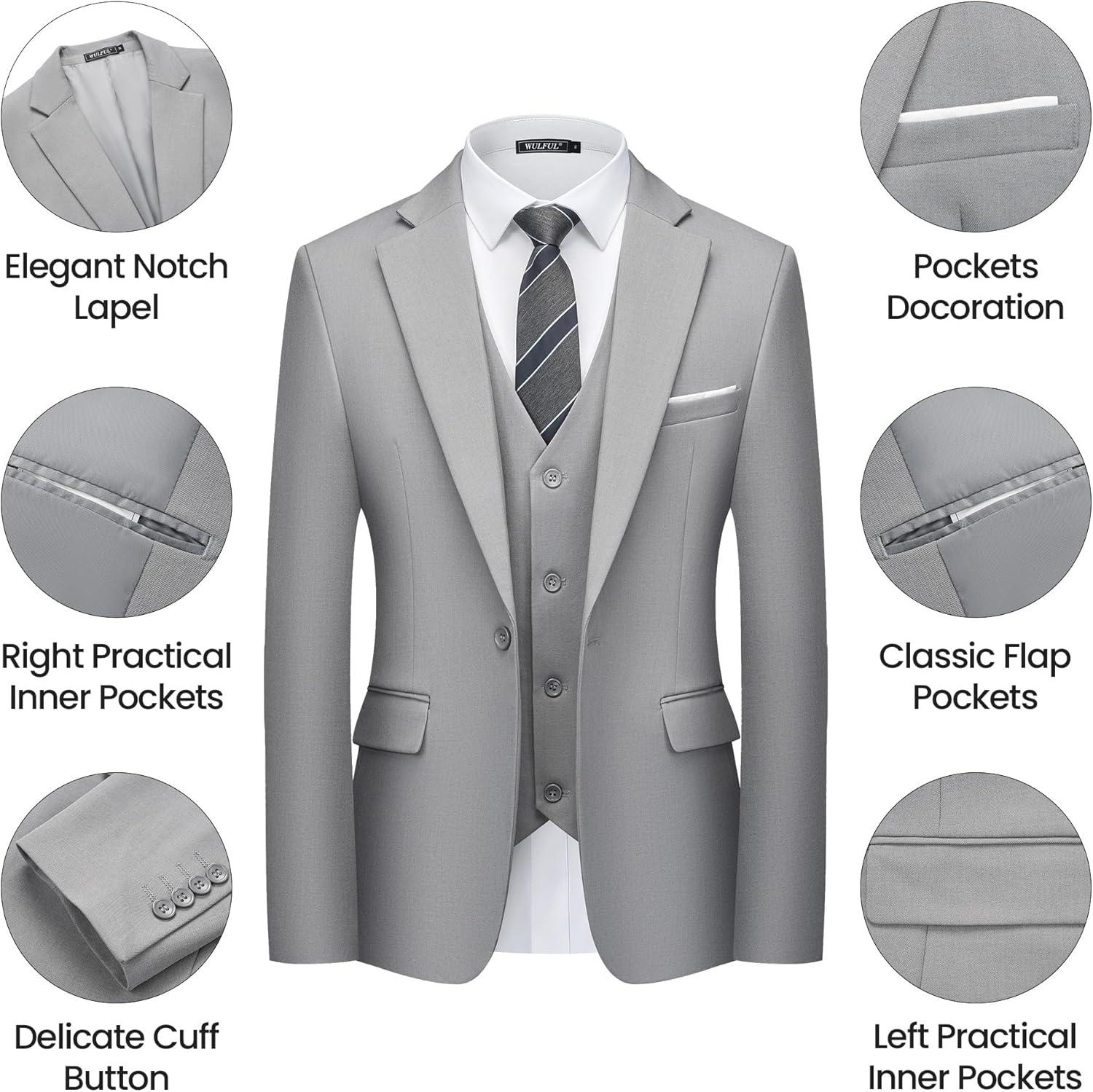 WULFUL Men's 3 Piece Slim Fit Suit Set One Button Blazer Jacket Pants Tuxedo Set(Light Gray)