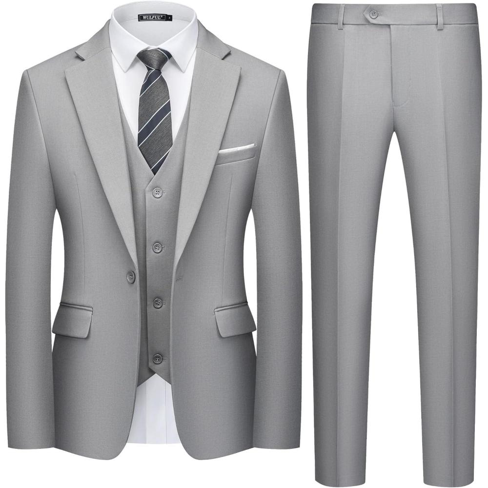 imageWULFUL Mens 3 Piece Slim Fit Suit Set One Button Blazer Jacket Pants Tuxedo SetLight Gray